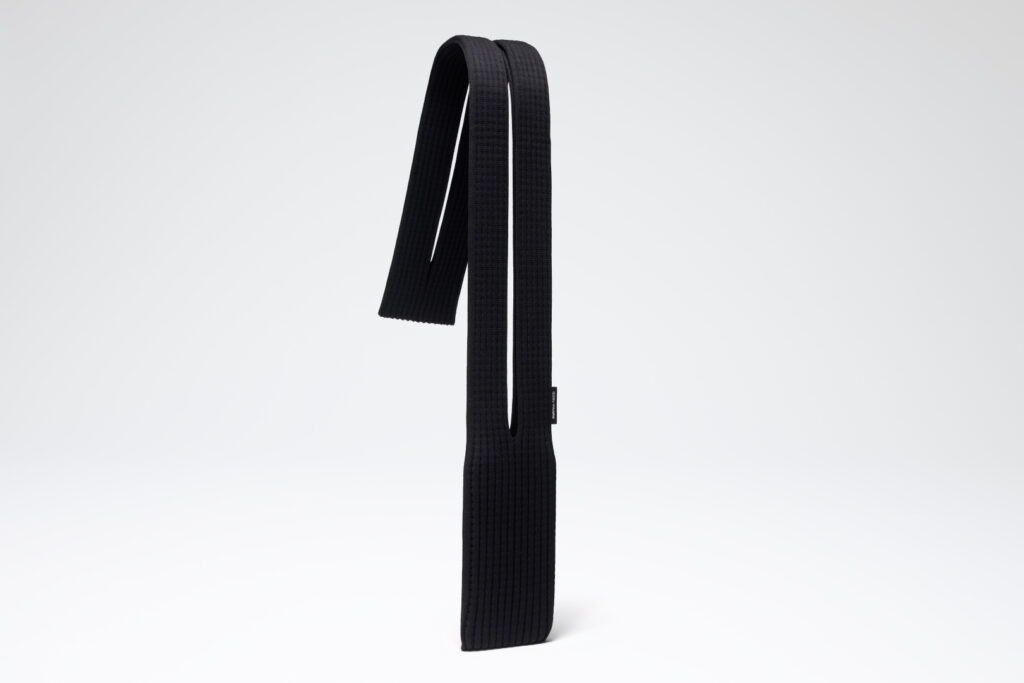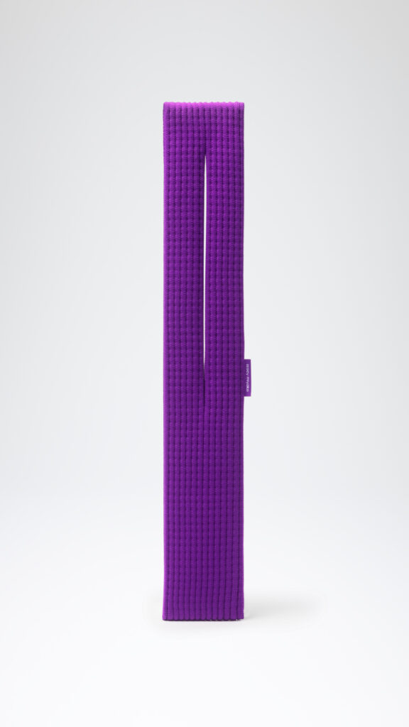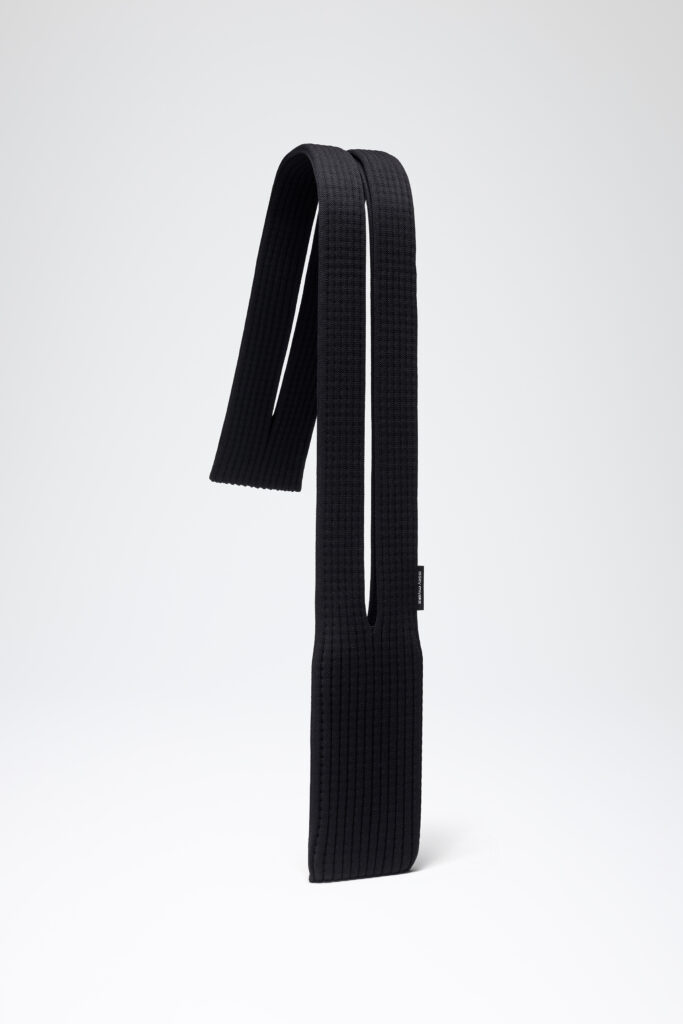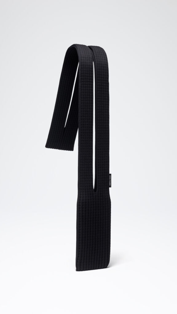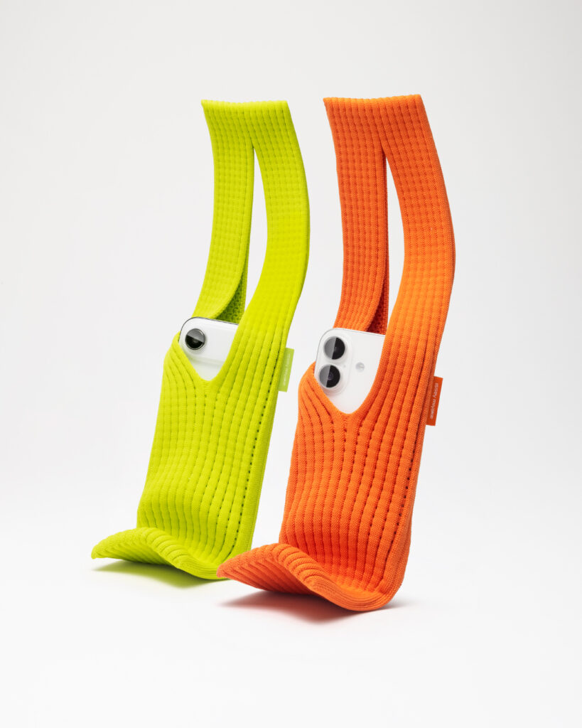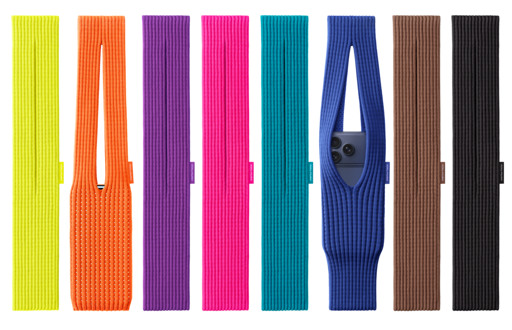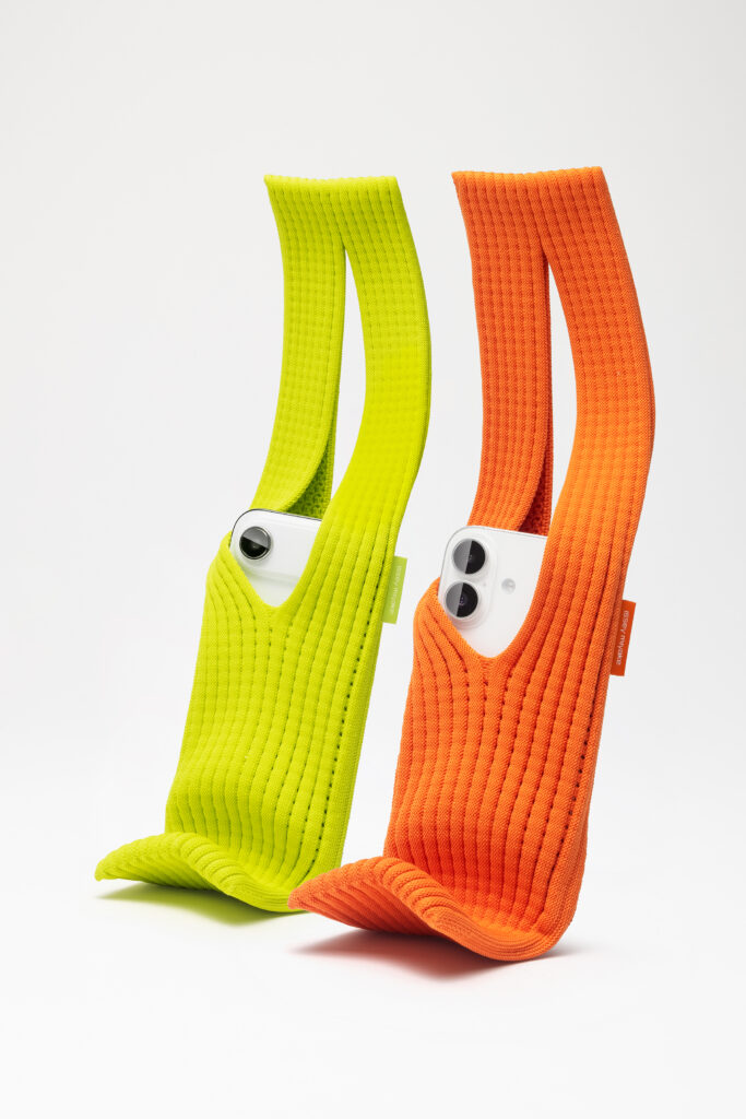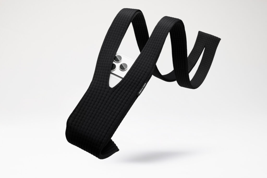 La référence au plissé n’est pas décorative. Elle est structurelle. La maille côtelée évoque les recherches historiques d’Issey Miyake sur le mouvement et la modularité, mais transposées ici à un usage quotidien contemporain : le téléphone, prolongement constant de la main et du regard. L’iPhone Pocket ne cherche pas à effacer cette présence. Au contraire, il l’assume. Le textile ajouré laisse deviner l’écran, les contours, parfois même la couleur de l’appareil. Le contenu n’est jamais dissimulé, simplement accompagné.