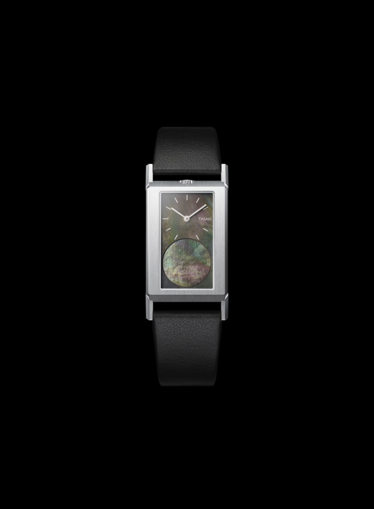 La montre est intégralement produite en Suisse par un réseau de sous-traitants spécialisés — un choix qui, selon Tasaki, « soutient l’artisanat, garantit la traçabilité et limite l’impact environnemental en réduisant les transports ». Le mouvement mécanique à remontage automatique oscille à 25 200 alternances par heure, une fréquence qui permet un compromis entre précision et longévité. La masse oscillante en platine, partiellement masquée par un élément circulaire mobile du cadran, constitue l’un des détails techniques les plus aboutis de l’ensemble.