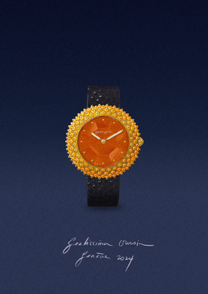Lauréate du prix « Femme » au Grand Prix d’Horlogerie de Genève 2025, cette quatrième pièce de la collection Oursin poursuit le dialogue singulier que Gérald Genta entretenait avec les gemmes d’exception.