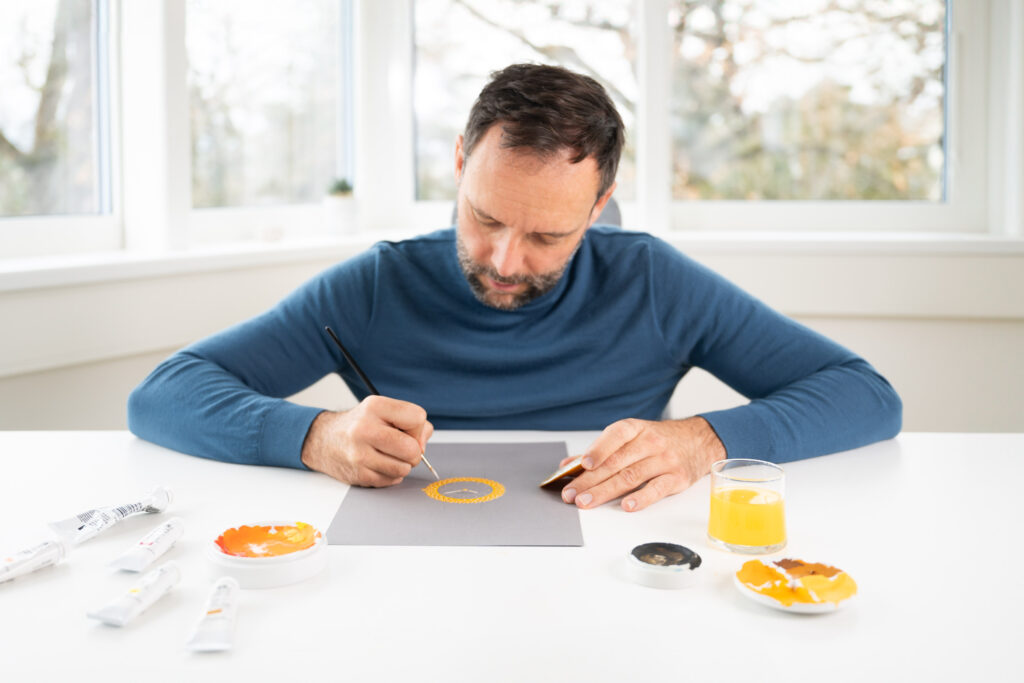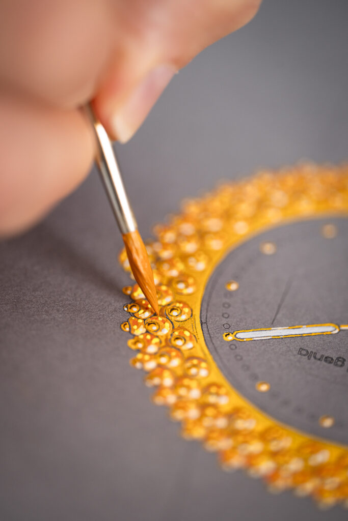 Le cadran en cornaline orange prolonge cette conversation chromatique. Un cristal octogonal facetté — forme indissociable du vocabulaire Genta — structure la lecture du temps tout en faisant écho au pourtour intérieur du boîtier. Les aiguilles et index en or jaune 3N complètent une composition où chaque élément répond au précédent. Le mouvement automatique GG-005, basé sur le calibre Zenith Elite, dispose d’une masse oscillante exclusive en or jaune 18 carats, dessinée par Michel Navas et Enrico Barbasini de La Fabrique du Temps Louis Vuitton.