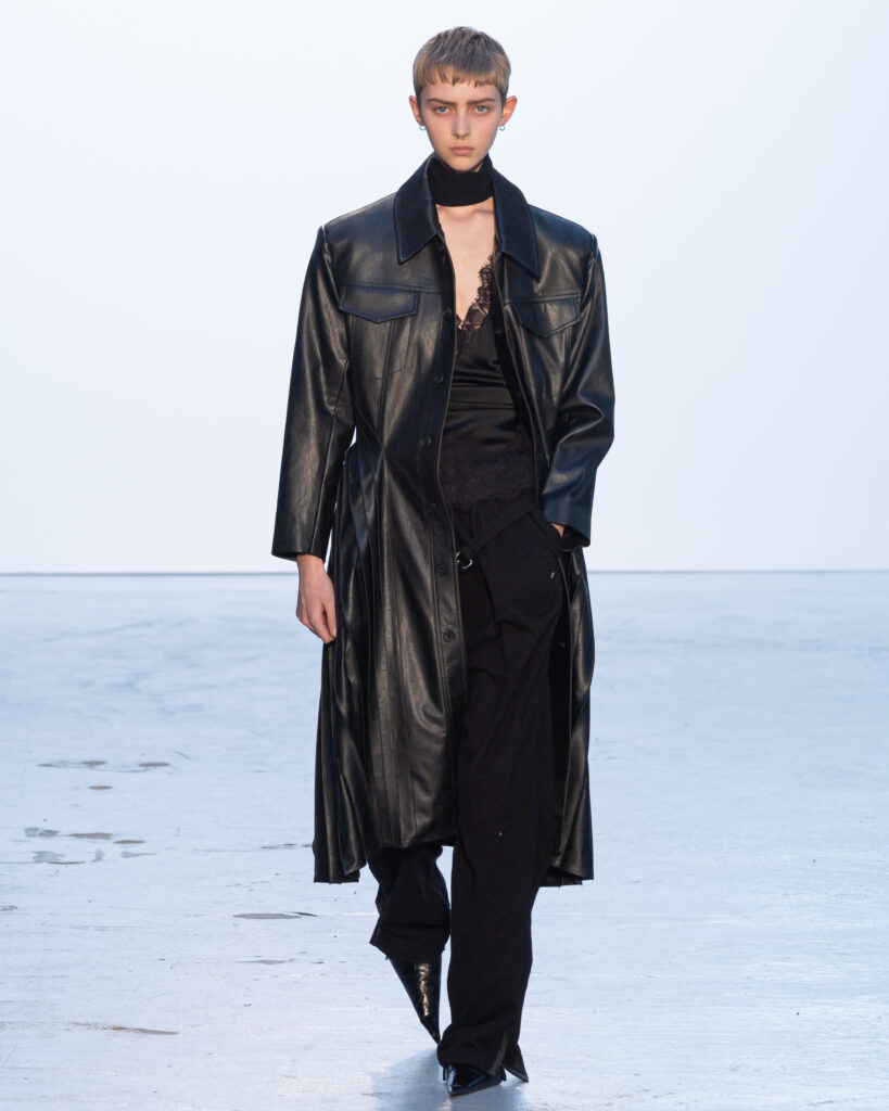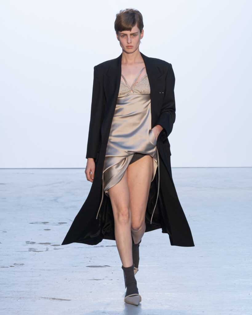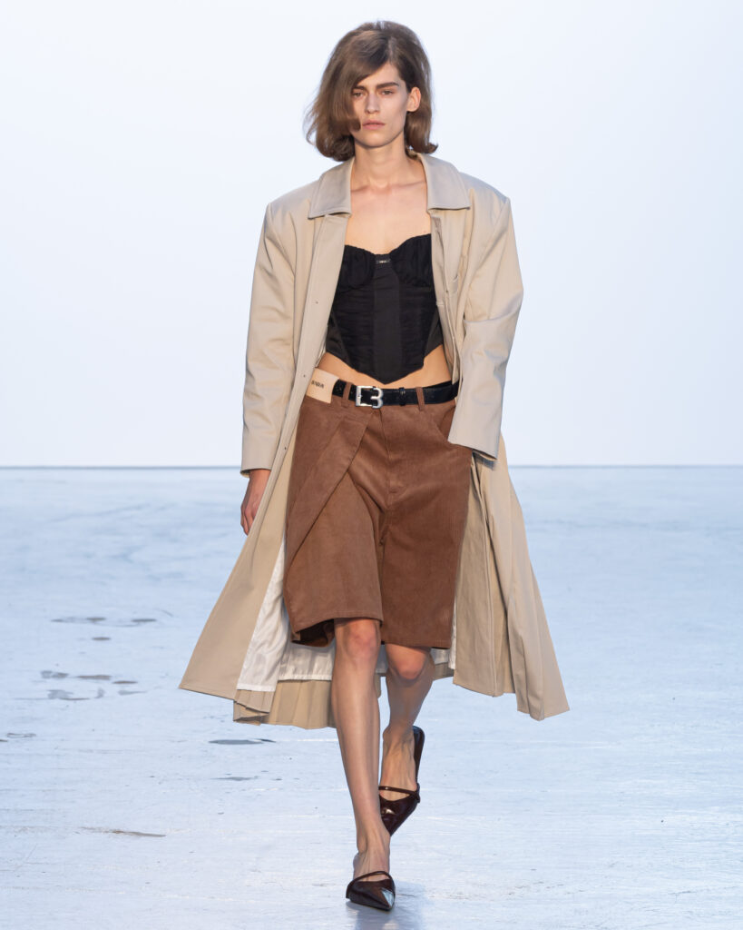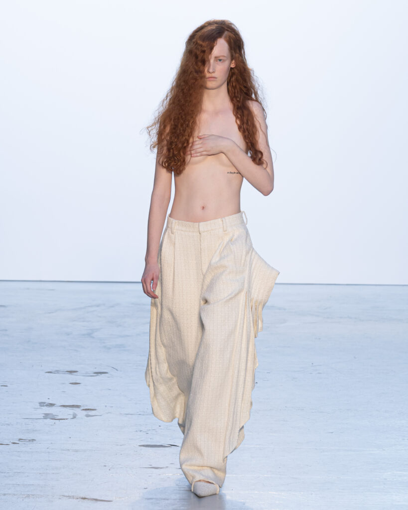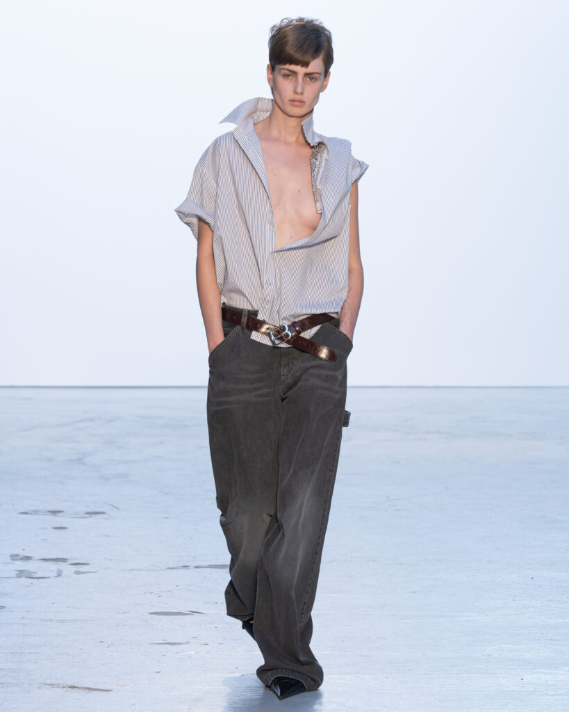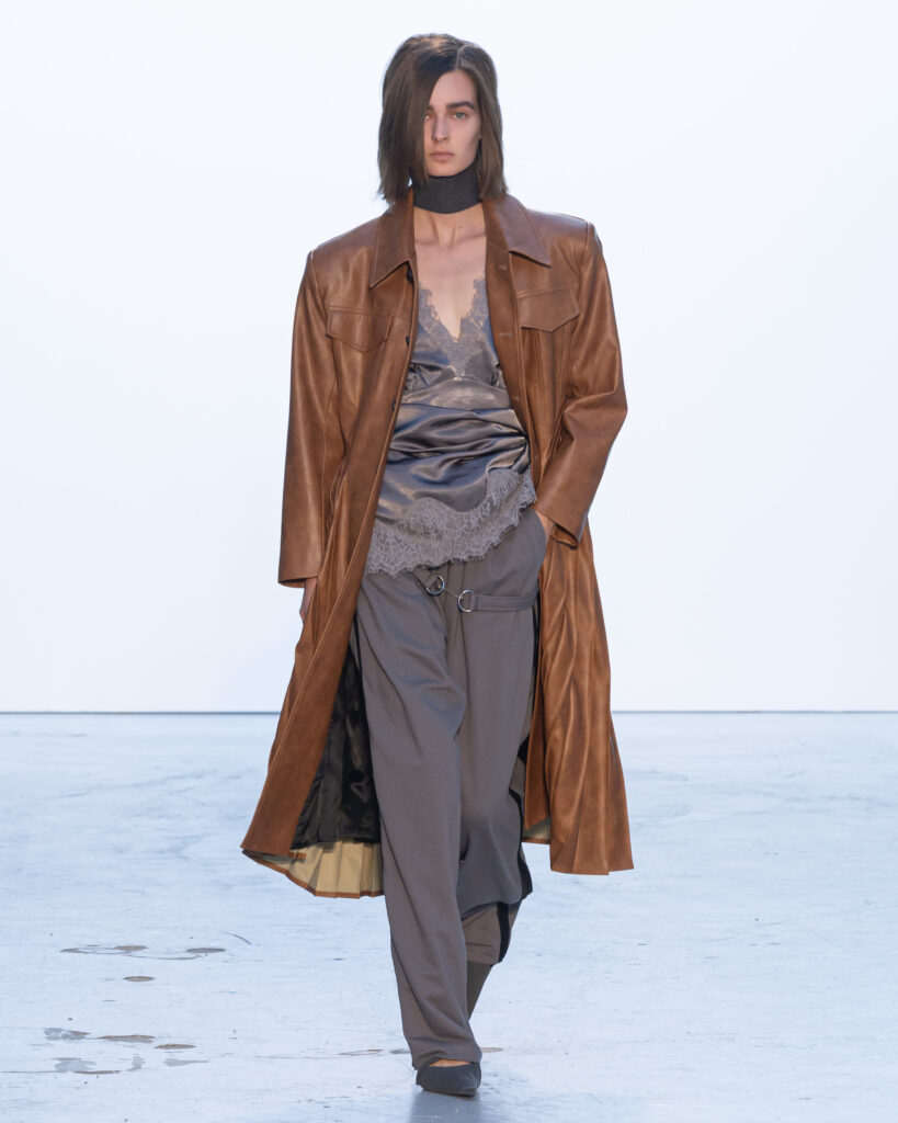 Certaines questions, posées presque naïvement par le créateur, traversent la collection comme des murmures : sortir acheter de l’eau en manteau ample, sans autre protection que des sous-vêtements. Imaginer une tenue parfaitement sage dissimulant jarretelles ou piercings. Ce ne sont pas des provocations. Ce sont des scènes de vie. Des instants où le vêtement révèle ce que l’on choisit habituellement de cacher.