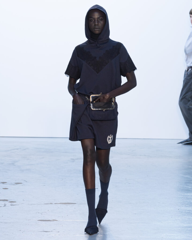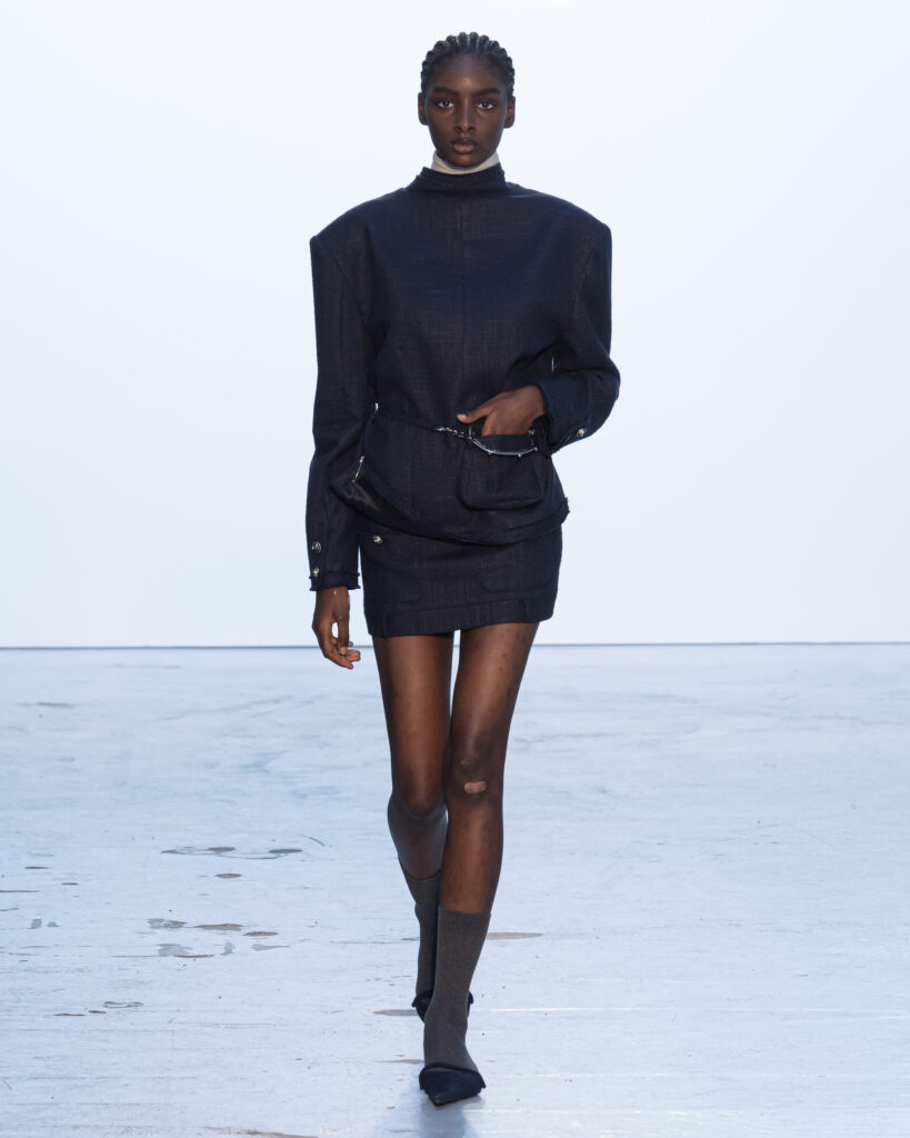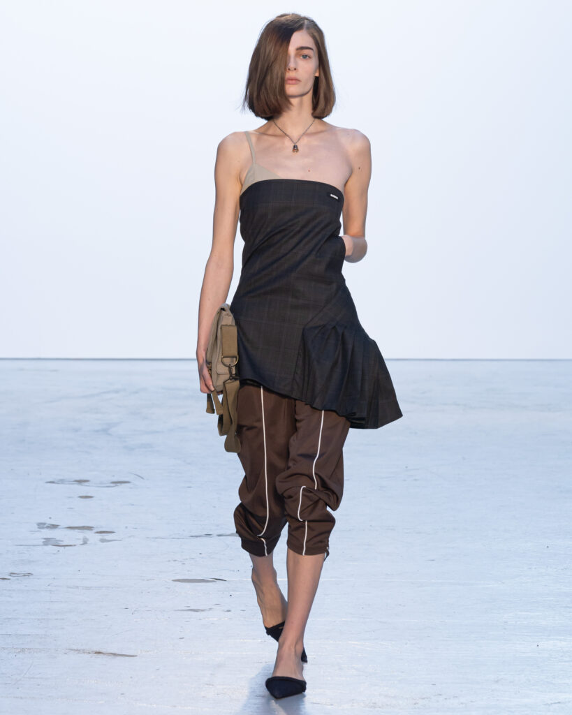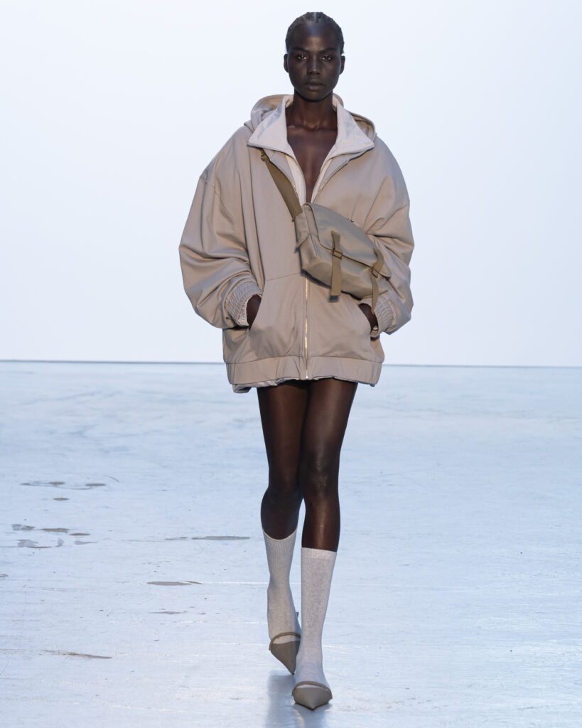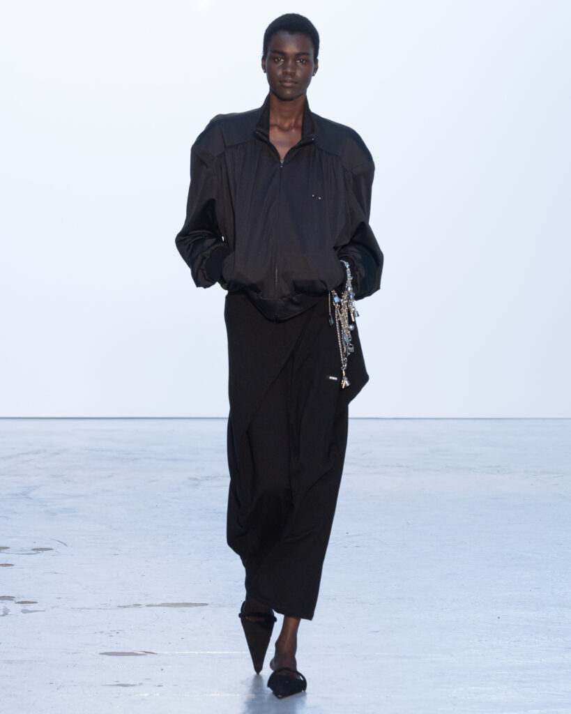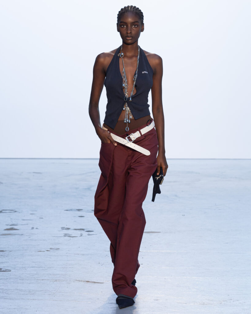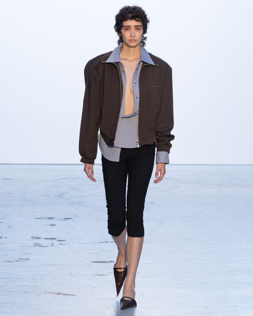 Certaines questions, posées presque naïvement par le créateur, traversent la collection comme des murmures : sortir acheter de l’eau en manteau ample, sans autre protection que des sous-vêtements. Imaginer une tenue parfaitement sage dissimulant jarretelles ou piercings. Ce ne sont pas des provocations. Ce sont des scènes de vie. Des instants où le vêtement révèle ce que l’on choisit habituellement de cacher.