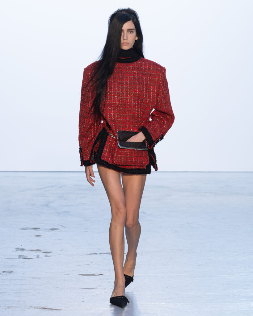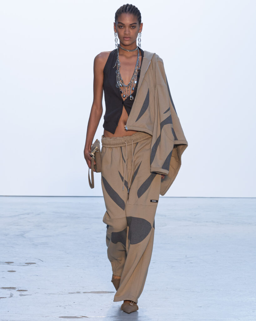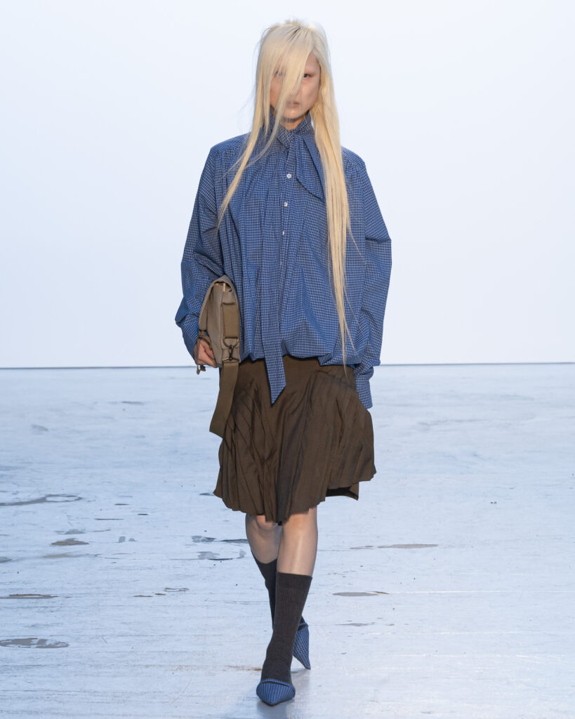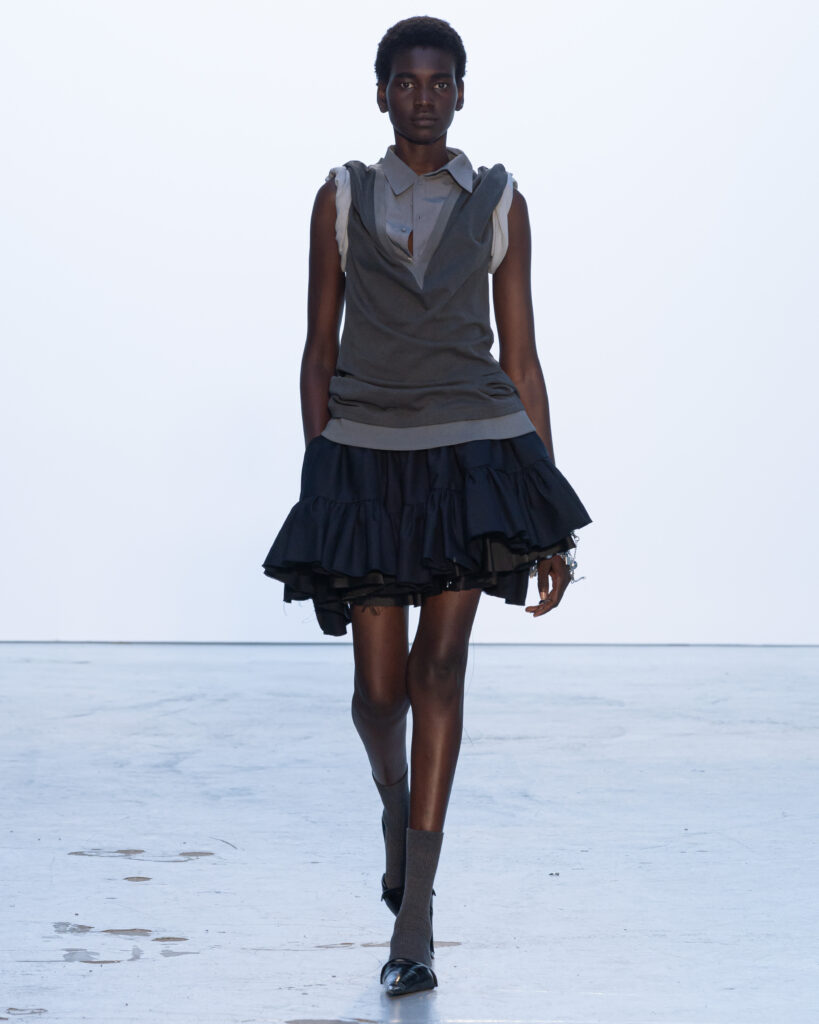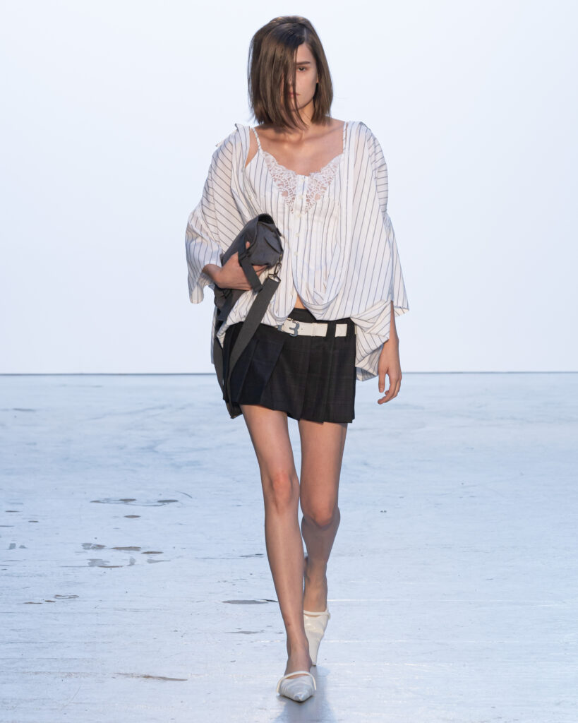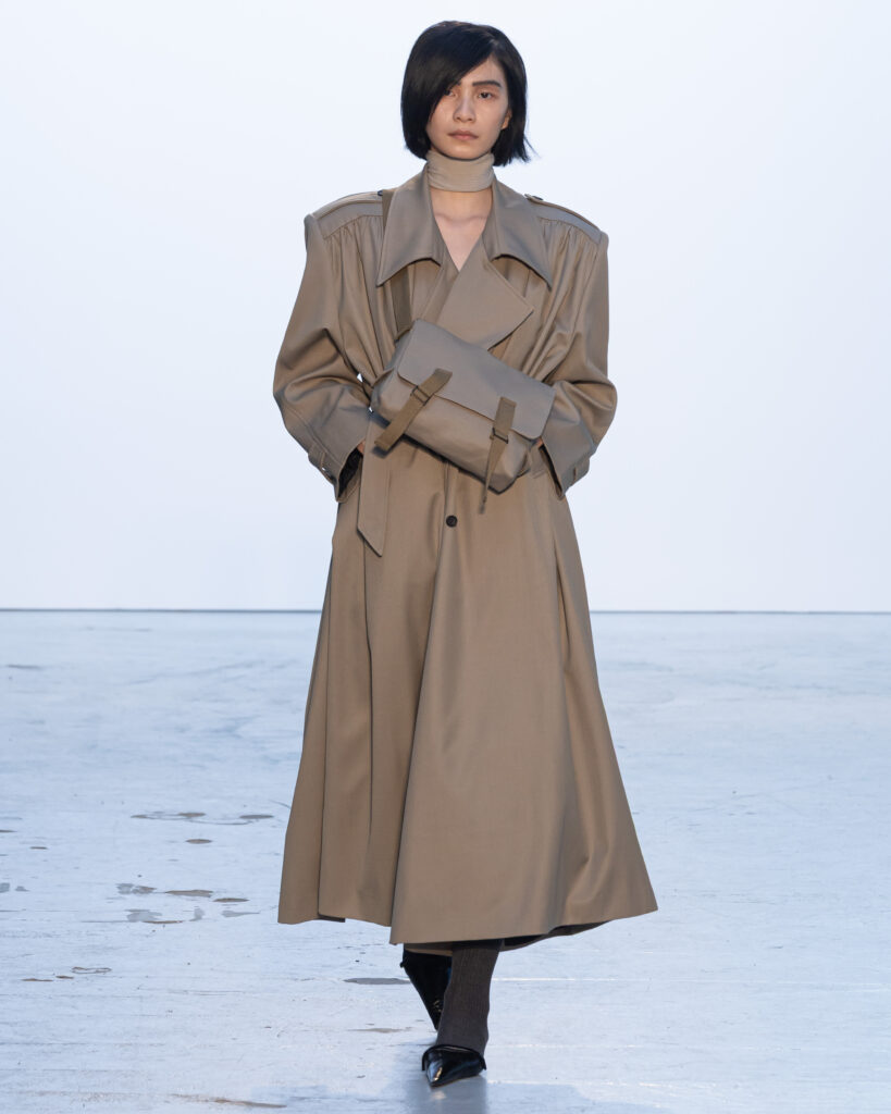 Certaines questions, posées presque naïvement par le créateur, traversent la collection comme des murmures : sortir acheter de l’eau en manteau ample, sans autre protection que des sous-vêtements. Imaginer une tenue parfaitement sage dissimulant jarretelles ou piercings. Ce ne sont pas des provocations. Ce sont des scènes de vie. Des instants où le vêtement révèle ce que l’on choisit habituellement de cacher.