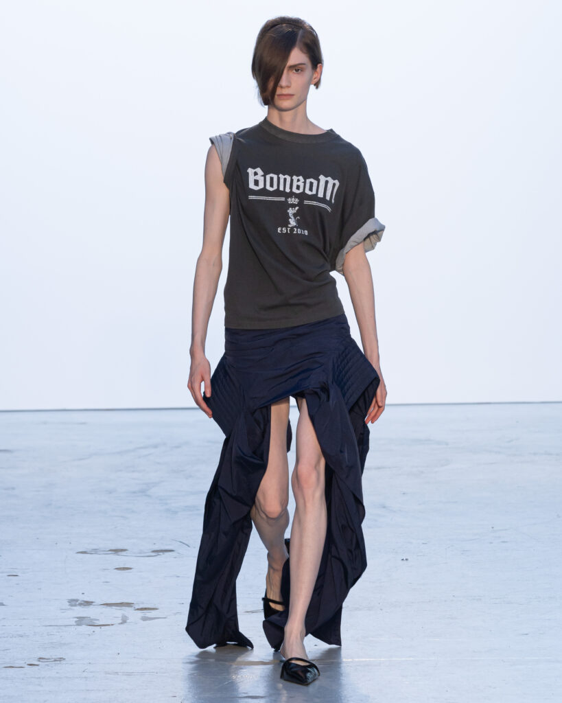 La collection s’organise autour d’une tension volontaire. Entre ce qui tient et ce qui déborde. Le vestiaire dit « de madame » — jupes midi, tweed, perles, broches, blouses fleuries — se charge soudain d’une attitude déplacée. Quelque chose de plus frontal, parfois presque insolent. À l’inverse, des silhouettes marquées par l’imaginaire punk, tatouées, corsetées, exposées, laissent apparaître une forme de retenue morale, presque conservatrice. BONBOM ne joue pas sur le choc, mais sur le glissement. Sur ce moment précis où l’on ne sait plus très bien ce qui relève de la bienséance ou du désir.