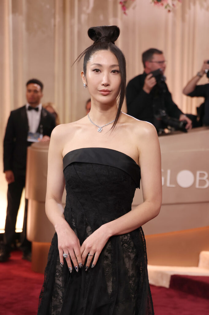 Jennifer Lopez, absente du palmarès mais présente sur le tapis rouge, rappelait son propre héritage stylistique. Sa robe moulante parcourue de motifs bronze serpentant sur le corps se terminait en queue de sirène. Référence évidente à cette robe Versace verte des Grammys 2000 qui demeure étalon de la provocation maîtrisée.