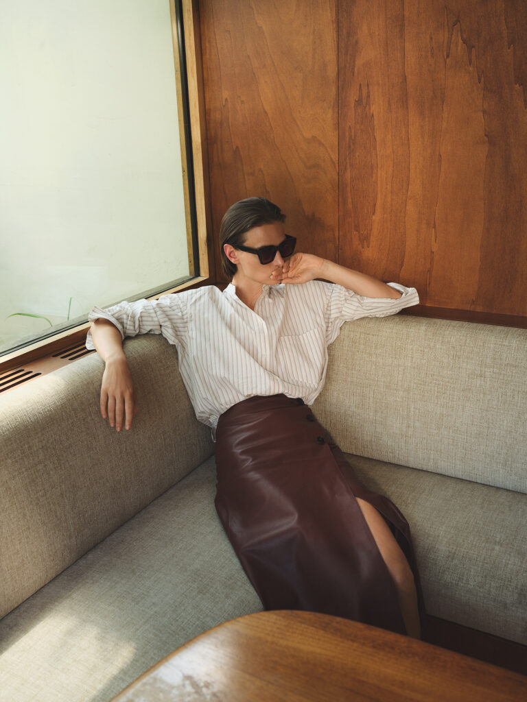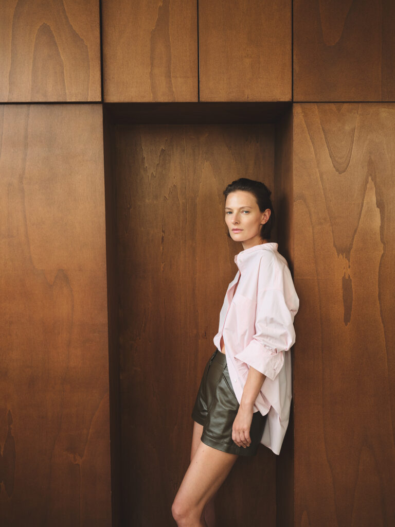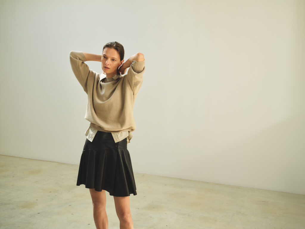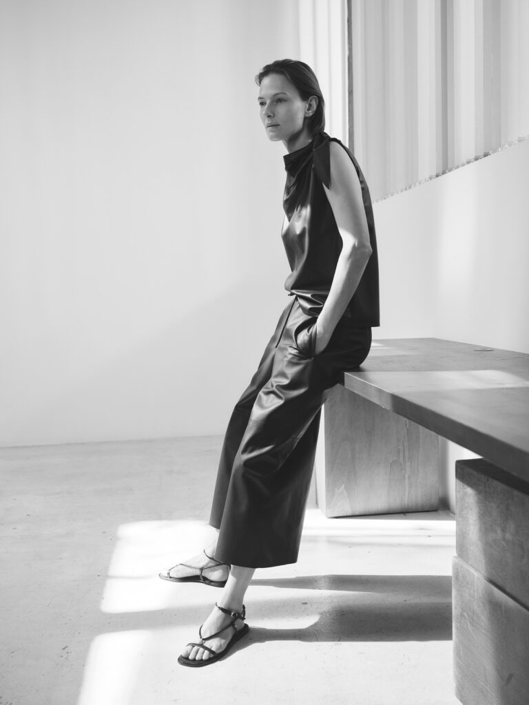La silhouette de la saison se construit sur une contradiction apparente : structurer le mouvement sans le contraindre. Les coupes sont amples, nettes, souvent monochromes, dessinant une allure que la maison qualifie de « sobre et sensuelle ». L’approche technique se concentre sur l’allègement de la matière. Le lin, le coton, la soie et le cachemire dialoguent avec le cuir, traité ici avec une souplesse qui lui permet de glisser sur le corps plutôt que de l’armer. Cette recherche de confort s’inscrit dans une vision contemporaine du « slow luxury », où le vêtement doit offrir une liberté de mouvement absolue.