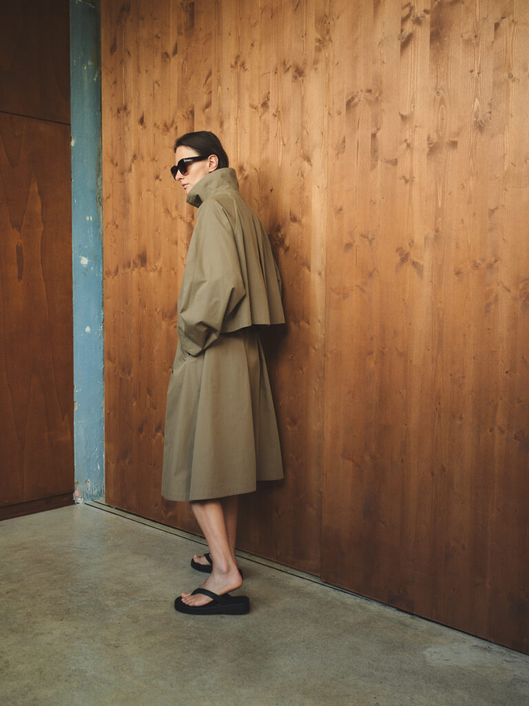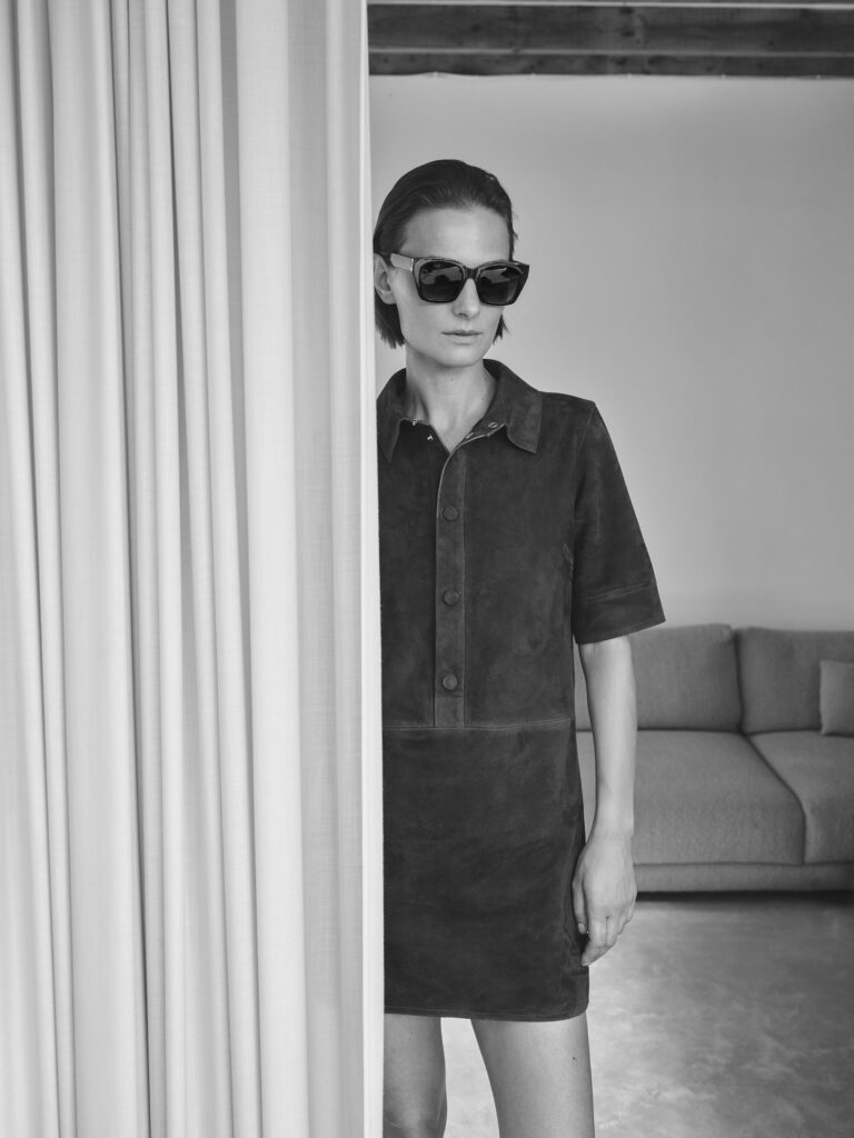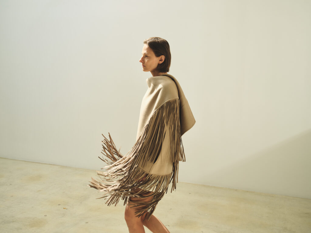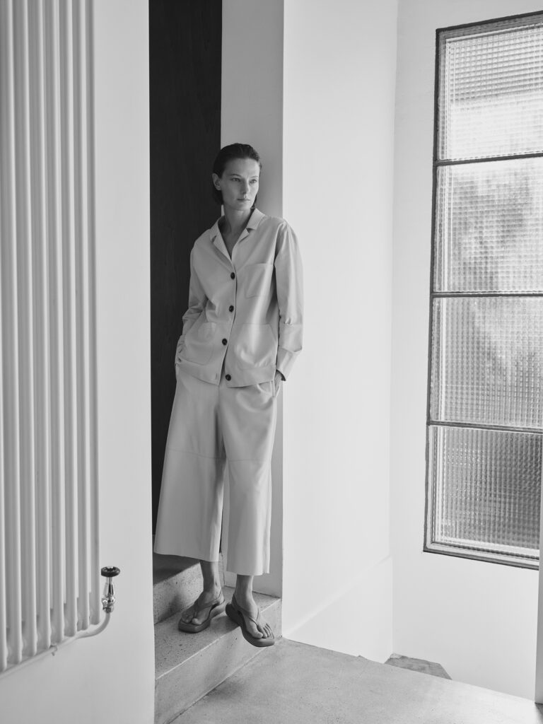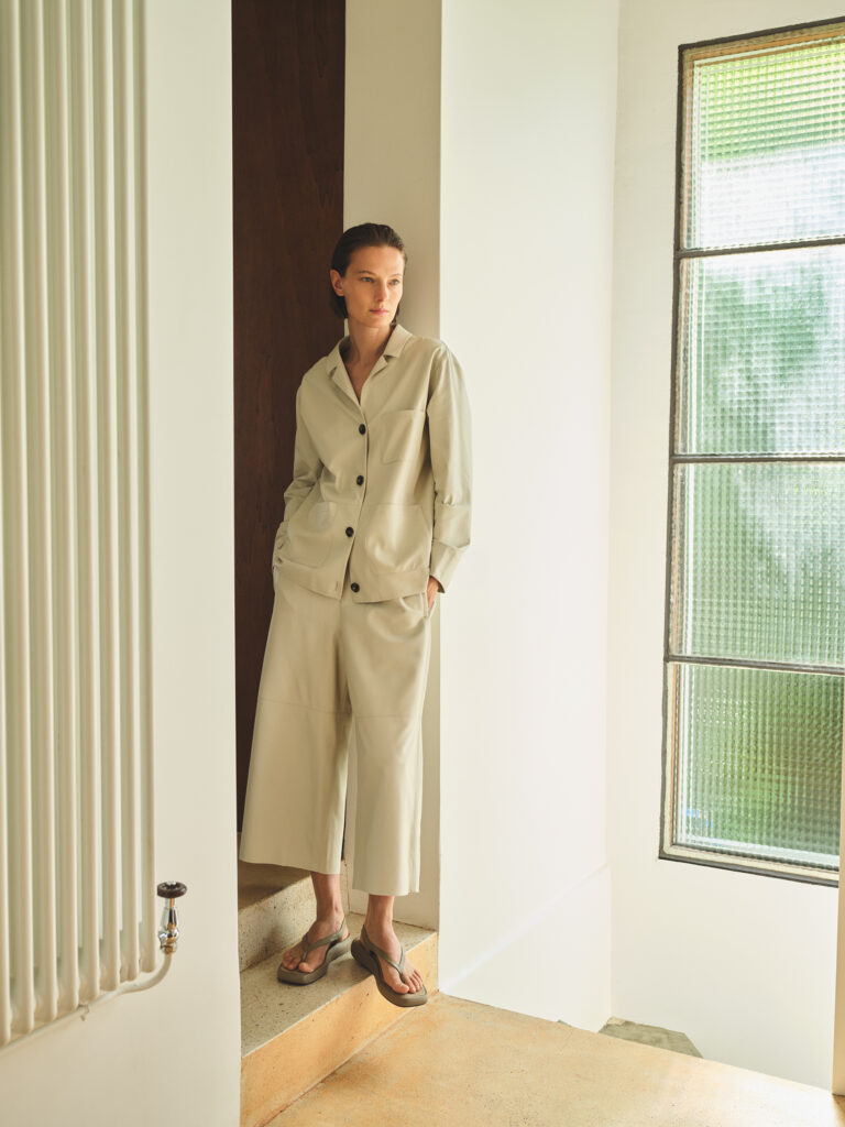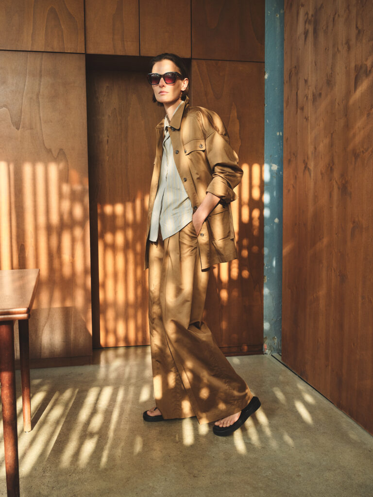 Sur le plan chromatique, la direction artistique s’éloigne des teintes purement naturalistes pour explorer une dimension plus perceptuelle, inspirée par les travaux sur la lumière de l’artiste James Turrell. La palette privilégie des tons minéraux, jouant sur des contrastes de profondeur et de luminosité pour créer une osmose entre la couleur et la matière. Ce travail sur la lumière met en relief les pièces phares du vestiaire : des tailleurs aux lignes strictes, des ensembles fluides, et notamment des sahariennes modernisées, pièces maîtresses d’une élégance que l’on devine nonchalante.