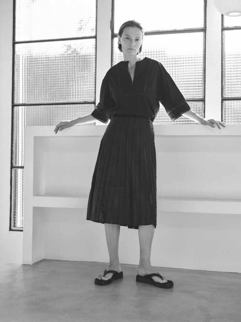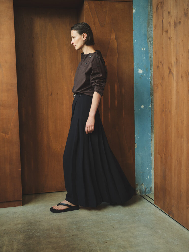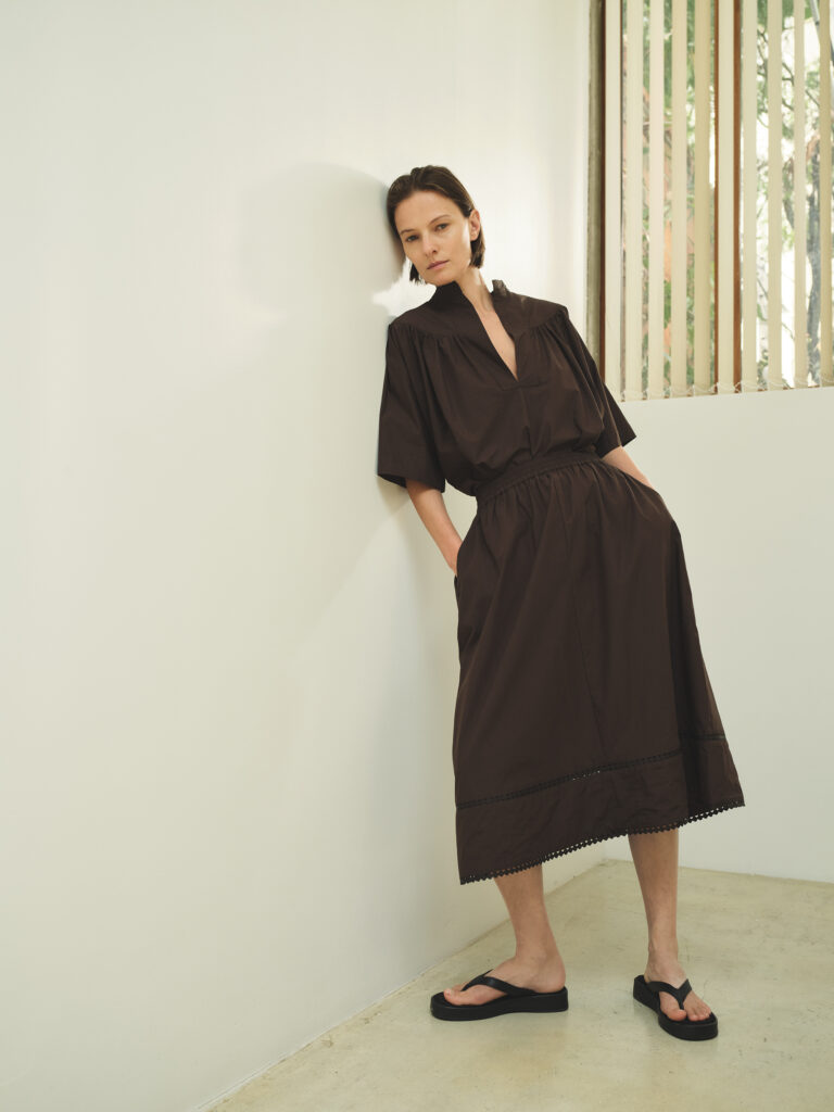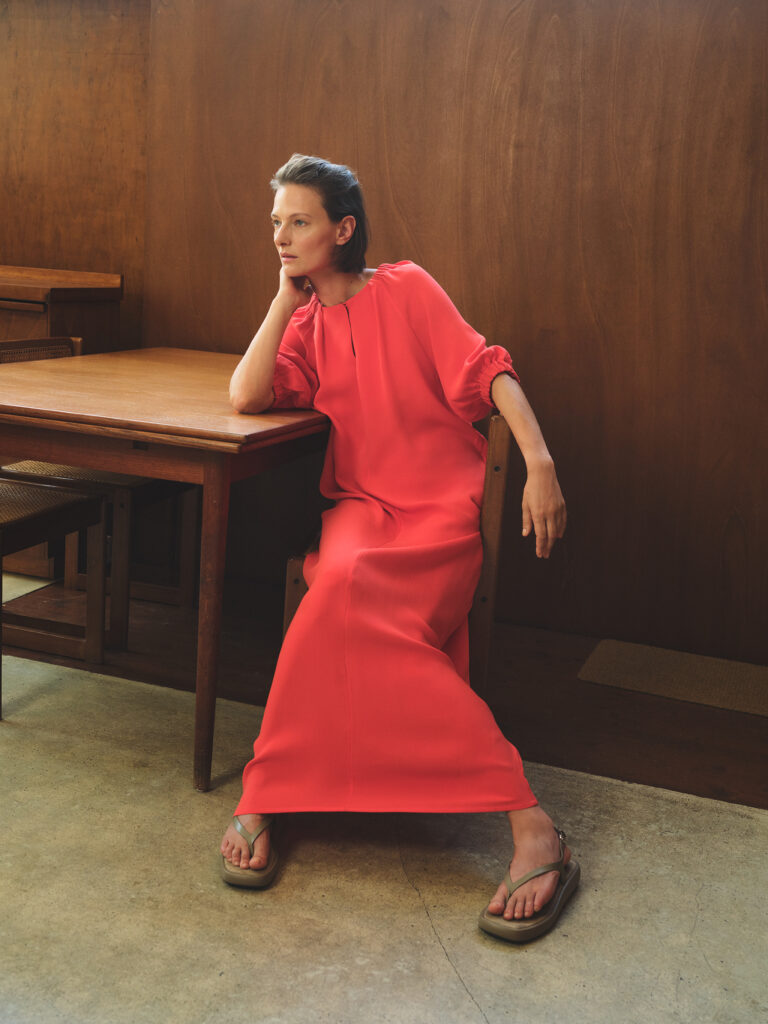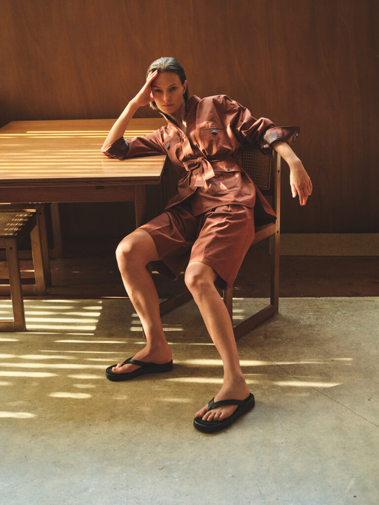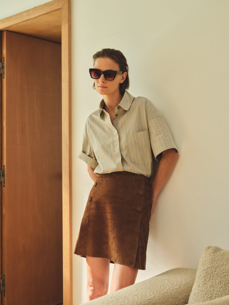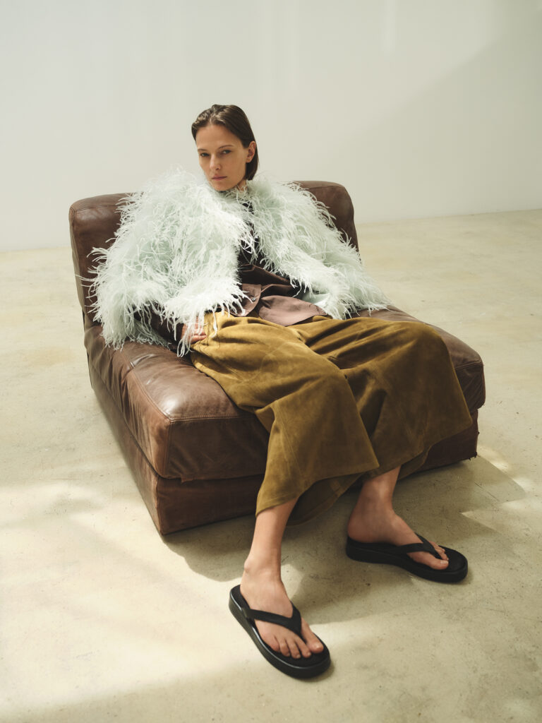 Sur le plan chromatique, la direction artistique s’éloigne des teintes purement naturalistes pour explorer une dimension plus perceptuelle, inspirée par les travaux sur la lumière de l’artiste James Turrell. La palette privilégie des tons minéraux, jouant sur des contrastes de profondeur et de luminosité pour créer une osmose entre la couleur et la matière. Ce travail sur la lumière met en relief les pièces phares du vestiaire : des tailleurs aux lignes strictes, des ensembles fluides, et notamment des sahariennes modernisées, pièces maîtresses d’une élégance que l’on devine nonchalante.