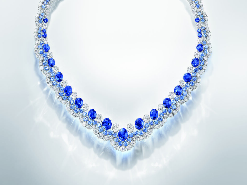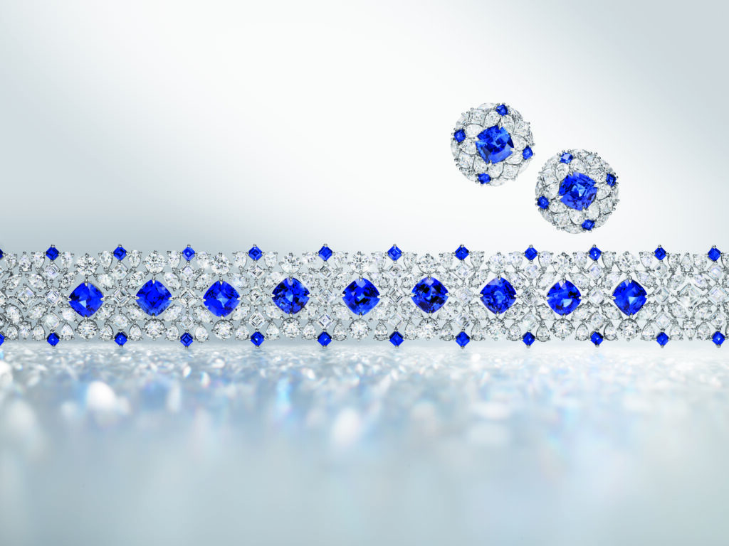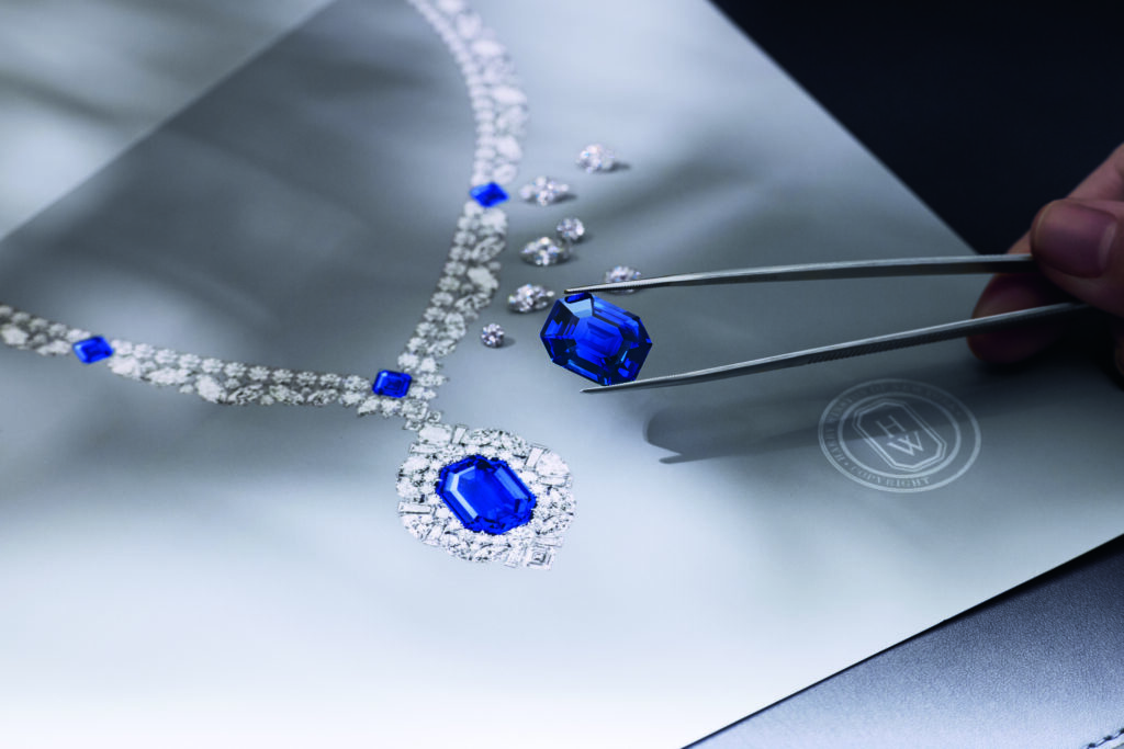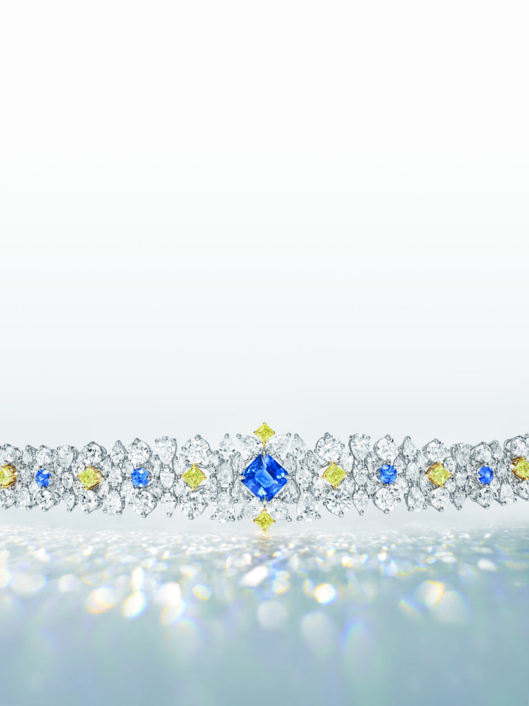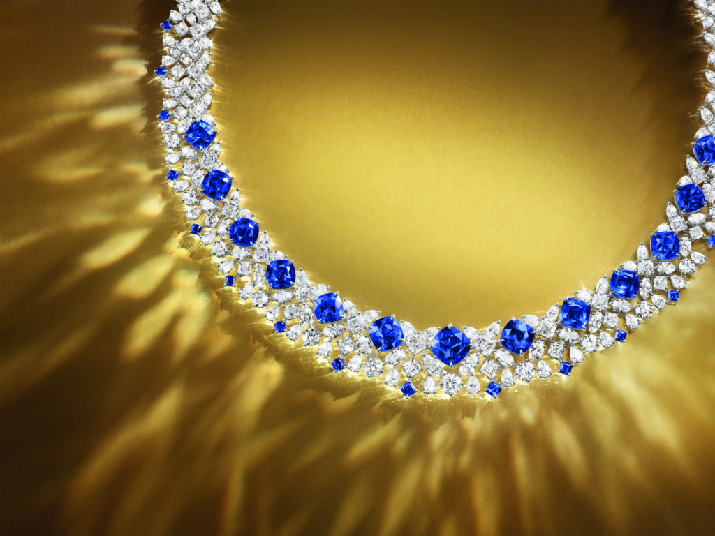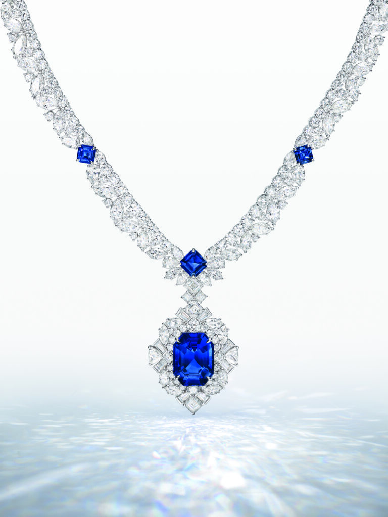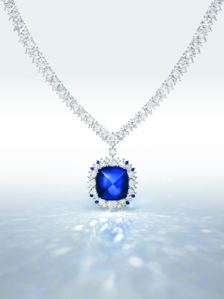 Cette philosophie culmine dans le volet « Rare Jeweler of the World », qui rend hommage à une pratique singulière du fondateur : l’acquisition de collections d’État ou privées pour en libérer les pierres. Winston n’hésitait pas à dessertir des joyaux historiques pour les retailler, les débarrassant de montures désuètes pour révéler leur éclat moderne. Cette approche radicale se matérialise dans le collier Cabochon Sapphire, dominé par un saphir pain de sucre de 65,61 carats. La pureté géométrique du cabochon, encadrée de diamants taillés sur mesure pour en épouser les flancs pyramidaux, illustre une maîtrise du volume où le luxe réside dans la soustraction du superflu.