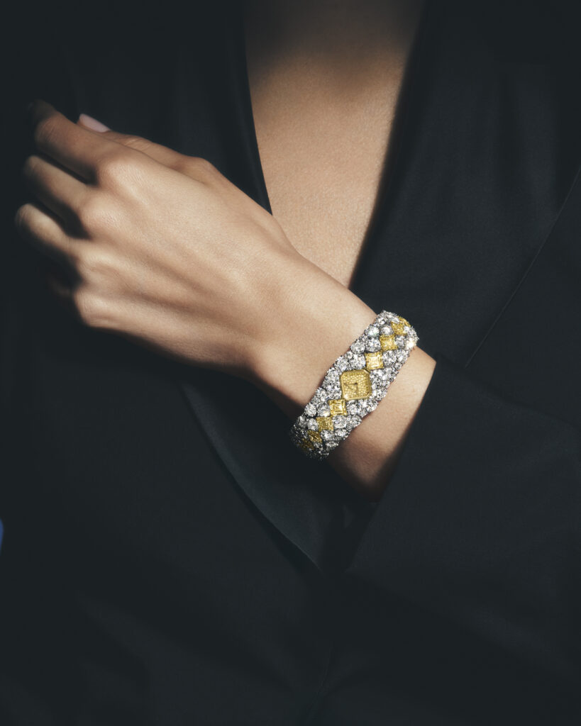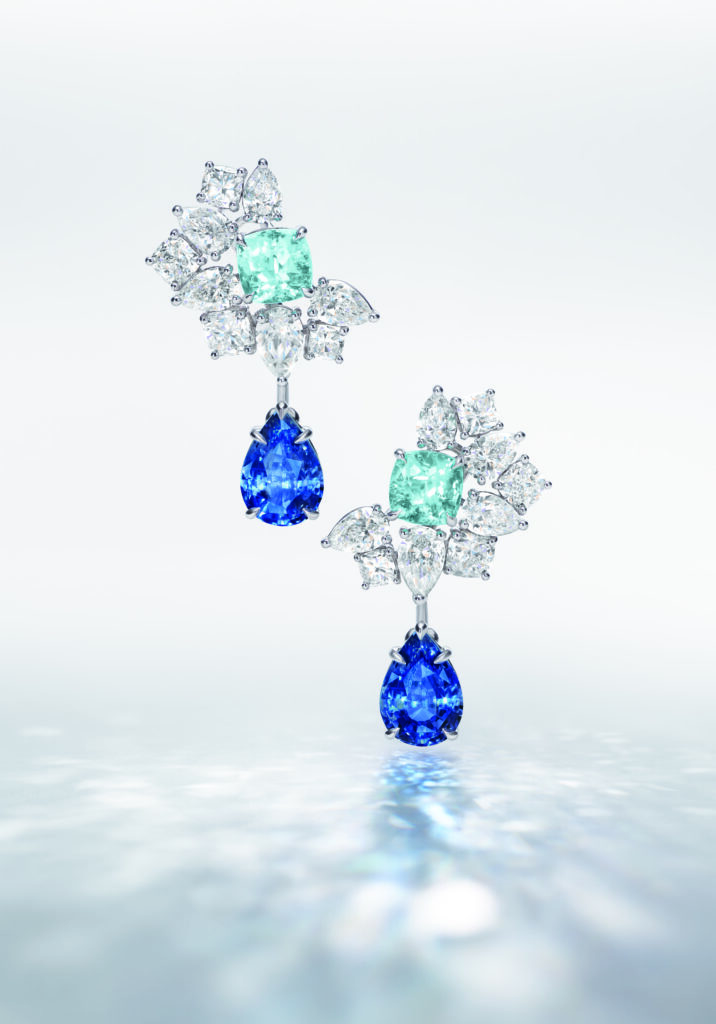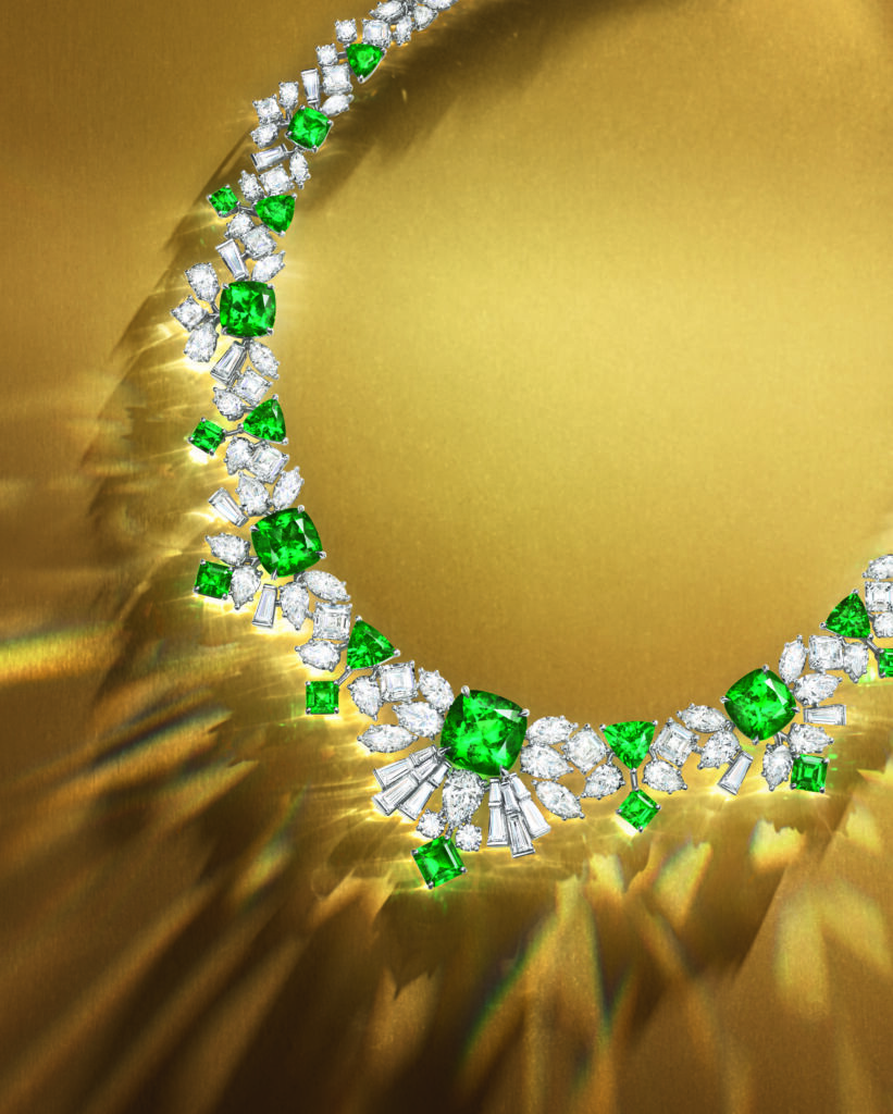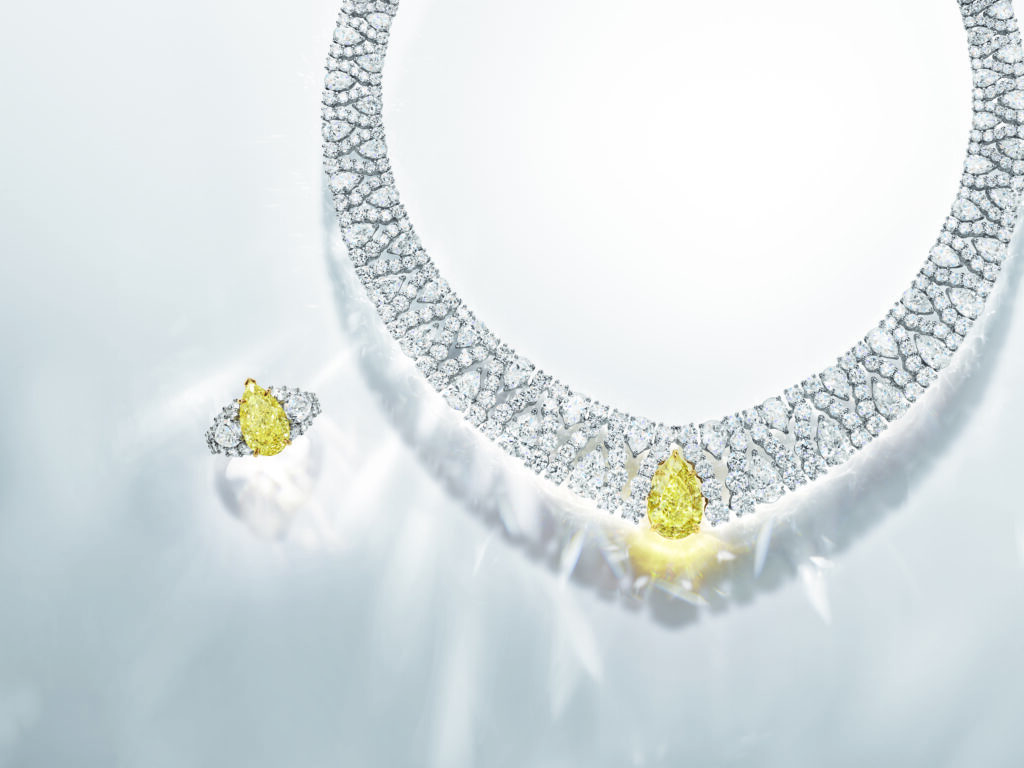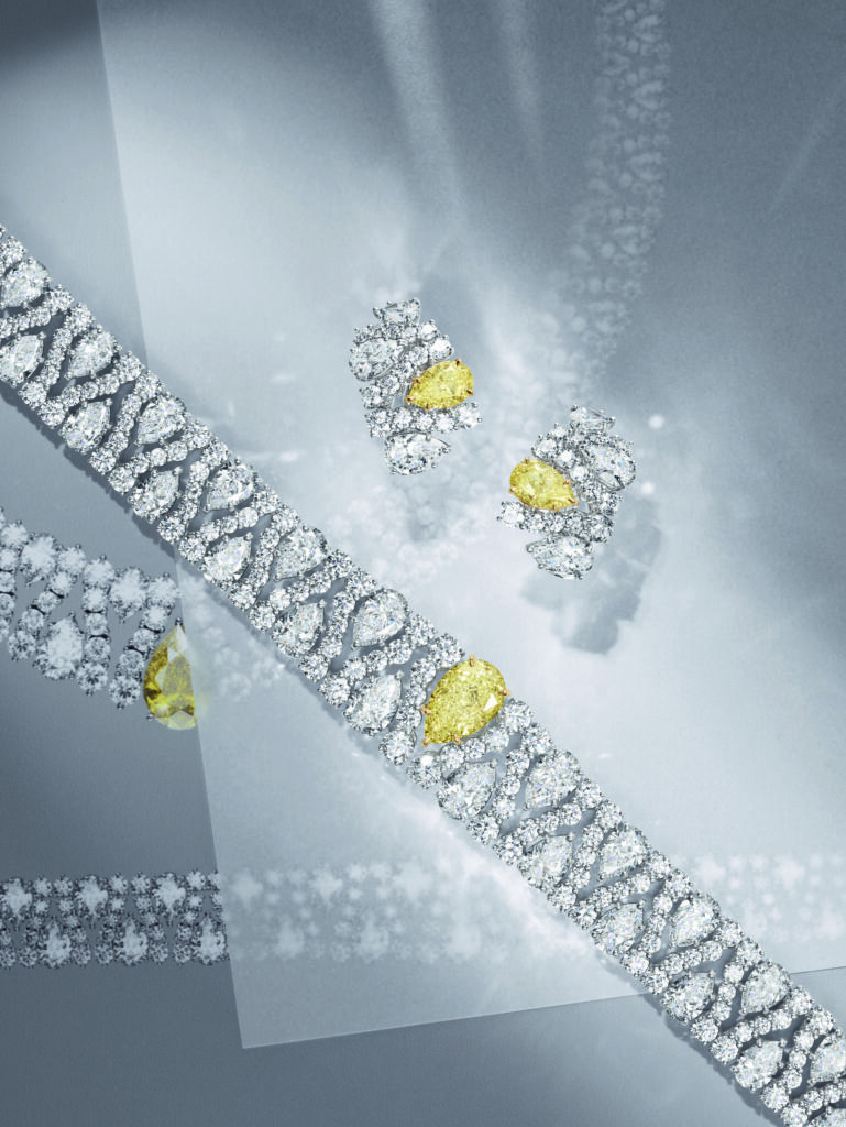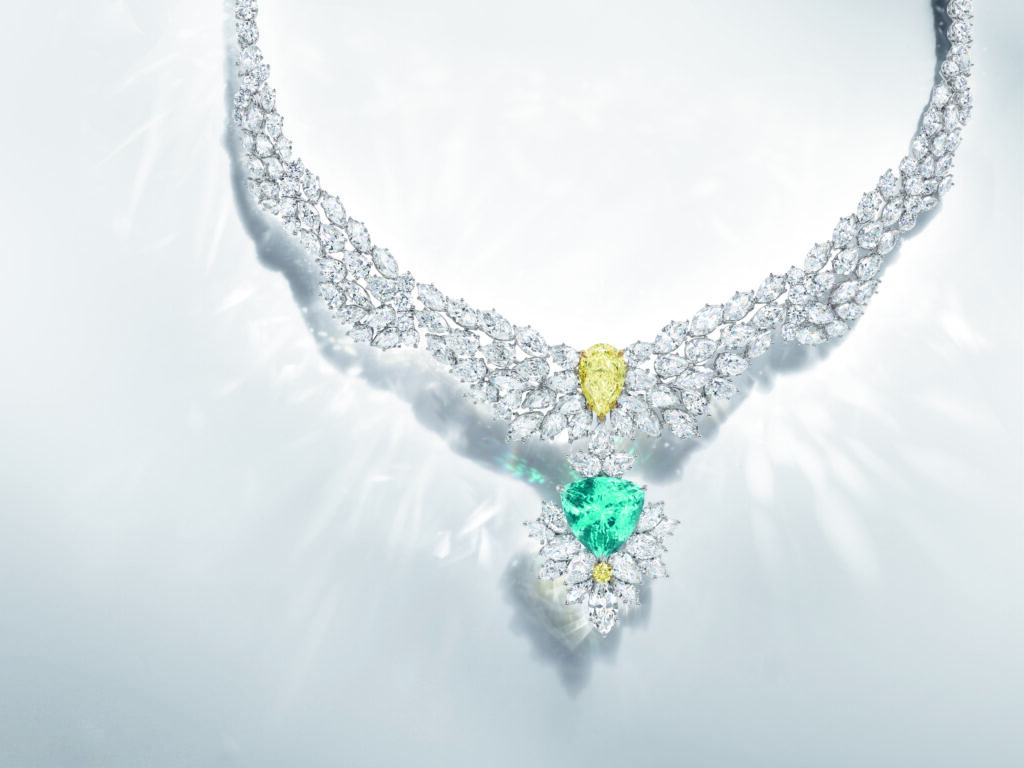 Le premier chapitre, « King of Diamonds », rappelle que l’audace d’Harry Winston résidait d’abord dans son instinct de chasseur de pierres brutes. Cette traque de l’exceptionnel trouve aujourd’hui son écho dans un collier défiant la gravité, où une tourmaline Paraíba triangulaire de 16,10 carats semble flotter au sein d’un cluster de diamants. L’architecture du bijou s’efface pour laisser la pierre dicter sa loi chromatique, un bleu électrique soutenu par un diamant jaune poire de plus de 5 carats. Ici, le sertissage n’est pas une contrainte technique, mais une ponctuation silencieuse qui laisse la gemme s’exprimer seule.