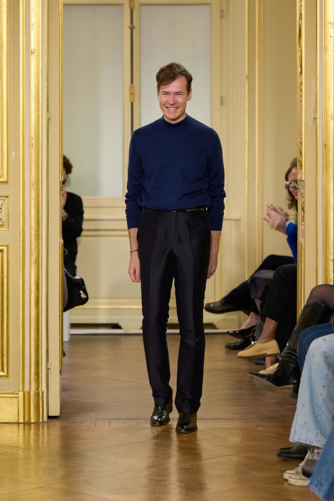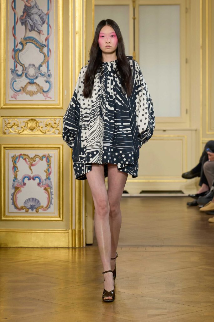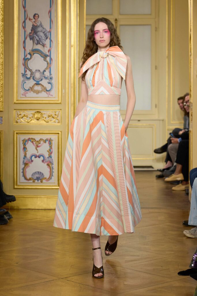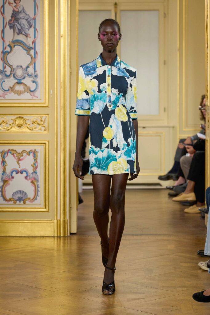 Chez Leonard, la matière reste un langage central. Le crépon de soie presque transparent joue avec la lumière comme une pellicule surexposée. Le twill grège, brodé à la main de sequins et de strass dorés, introduit une densité tactile, jamais ostentatoire. Les jacquards de coton à rayures « cricket club », les popelines nettes, les voiles brodés de fleurs pastel composent un vestiaire qui assume la pluralité, sans chercher l’uniformité.