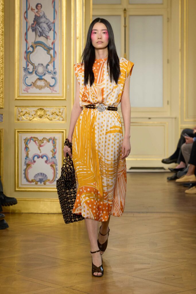 Les silhouettes traduisent cette tension. Robes fluides, drapées avec une aisance étudiée, évoquent le vestiaire des actrices de l’âge d’or hollywoodien sans jamais tomber dans la reconstitution. À leurs côtés, des caftans aériens, presque suspendus, rappellent une élégance de bord de piscine, où le vêtement accompagne le corps plutôt qu’il ne le contraint. Les volumes se permettent parfois l’exagération — formes « bonbon », proportions amplifiées — avant de se confronter à des tailleurs d’inspiration masculine, revisités tantôt avec douceur, tantôt avec une rigueur plus preppy.