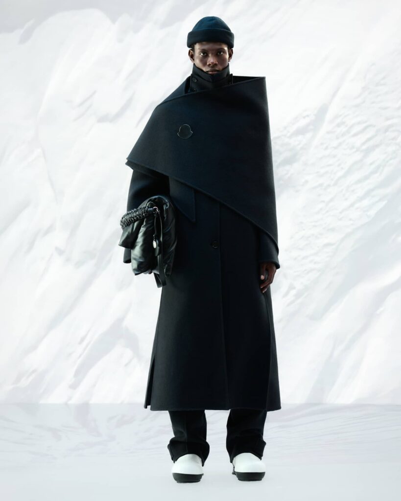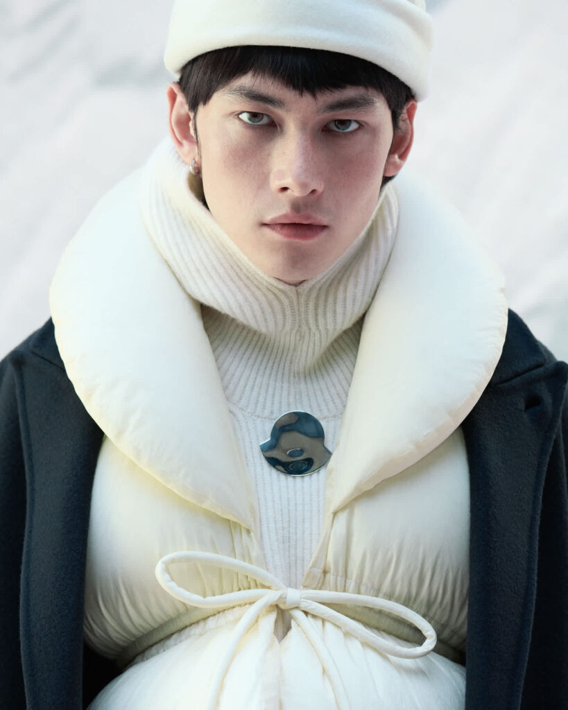 La collection Moncler + Jil Sander illustre parfaitement ce mécanisme. Jil Sander — référence absolue du minimalisme sophistiqué allemand depuis les années 1980, maison connue pour sa « précision sophistiquée » et son refus de tout ornement superflu — apporte son langage formel à l’expertise technique de Moncler. Le résultat : des vestes bulbeuses en nylon garni de duvet superposées à des cardigans matelassés en laine douce, des jupes en forme de dôme, des manteaux duveteux en laine innovante à longs poils. Le communiqué parle d’« inspiration dans l’élégance tranquille du monde naturel », de « formes courbes inspirées par sommets enneigés et collines ondulantes », de « fibres naturelles renforçant la sensibilité raffinée ». C’est le vocabulaire du luxe créatif appliqué à ce qui reste, techniquement, une doudoune d’hiver.