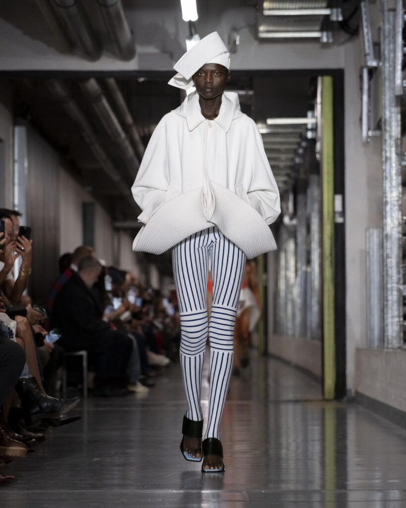 Diplômé de la Gerrit Rietveld Academie et du Sandberg Instituut d’Amsterdam, lauréat du prix spécial ANDAM en 2023 puis du prix Karl Lagerfeld au concours LVMH en 2024, Lantink s’est fait connaître par des silhouettes qui manipulent le corps : rembourrages, découpes hasardeuses, volumes gonflés à l’hélium. Son approche, fondée sur l’upcycling et le collage, trouve chez Gaultier un terrain de résonance évident. Les deux créateurs partagent un même goût pour la distorsion des classiques, une même célébration de la surprise.