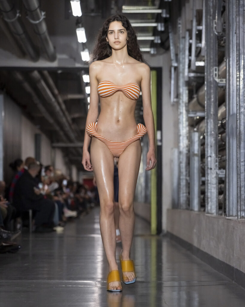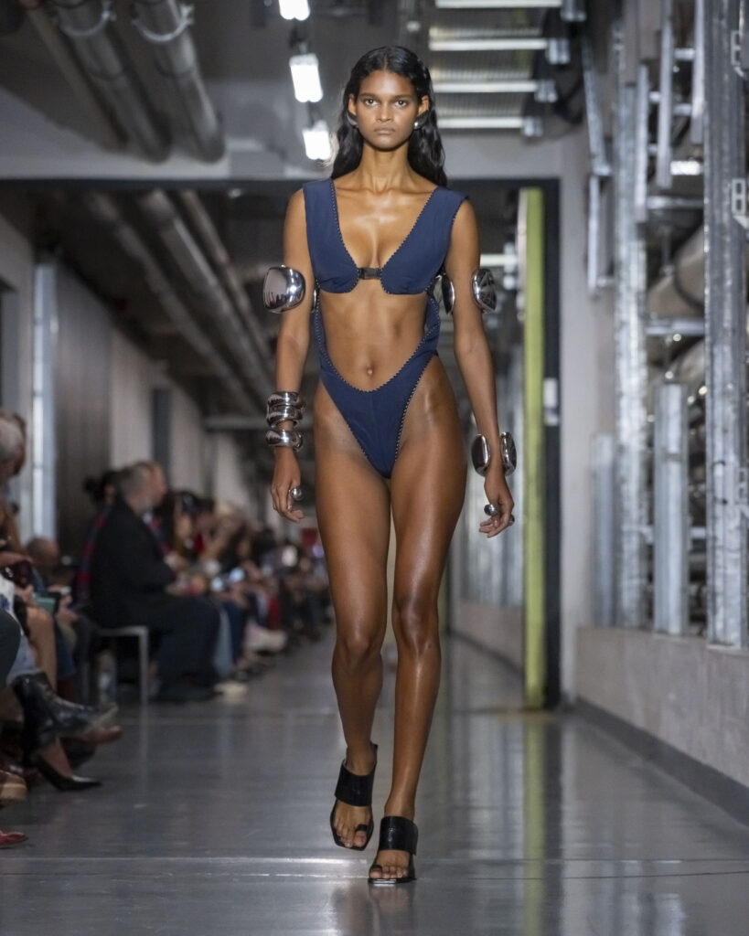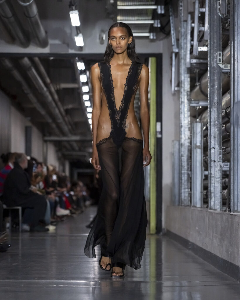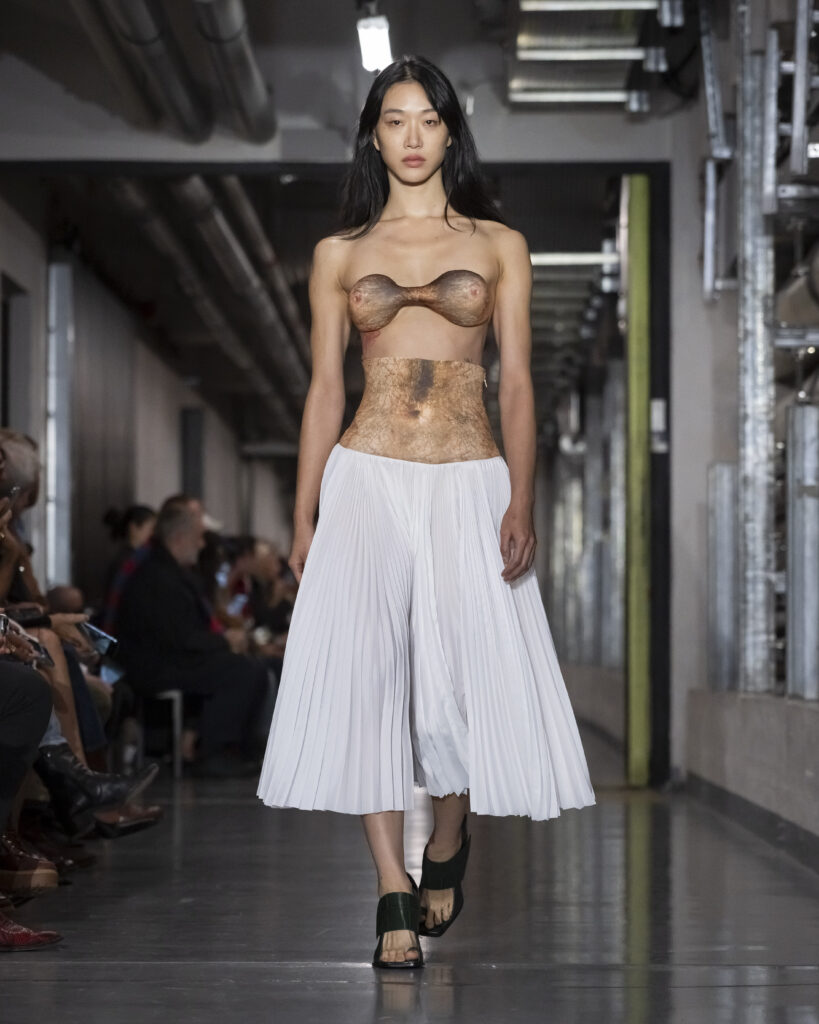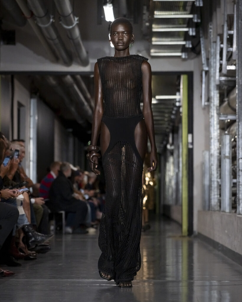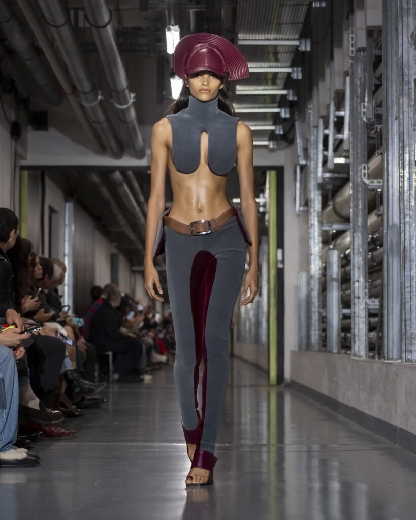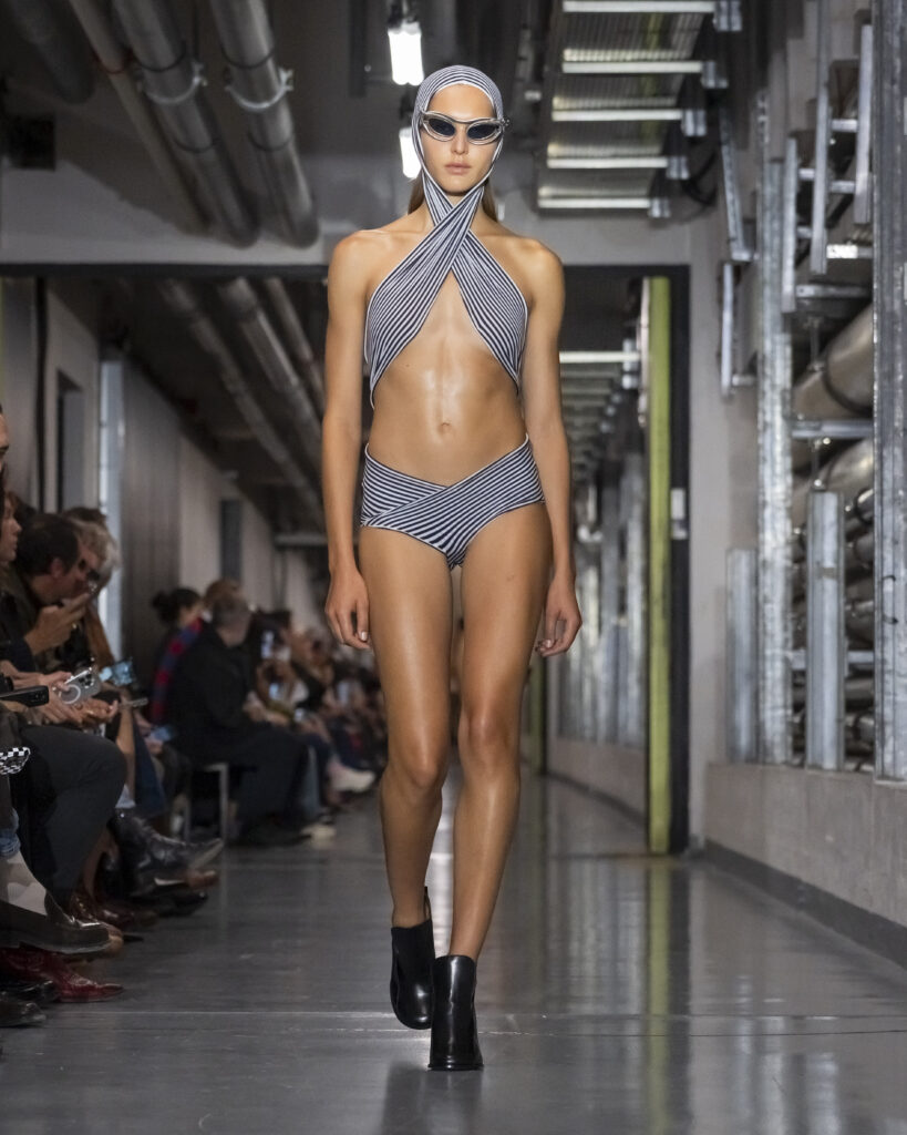 Pour sa première collection de prêt-à-porter printemps-été 2026, présentée dans les sous-sols du Musée du Quai Branly, le nouveau directeur artistique de Gaultier déploie ce qu’il nomme un processus de « Duranification ». Les pièces se tordent, se transforment, surgissent ou disparaissent. Les rayures marinières deviennent illusions d’optique. L’imprimé tattoo sur tulle — signature historique de la maison — s’élève en relief. Des trompe-l’œil scintillants dessinent l’anatomie humaine à même les torses. Bordeaux, moutarde, bleu électrique : une palette qui évoque autant les années quatre-vingt-dix que l’Amsterdam des clubs clandestins.