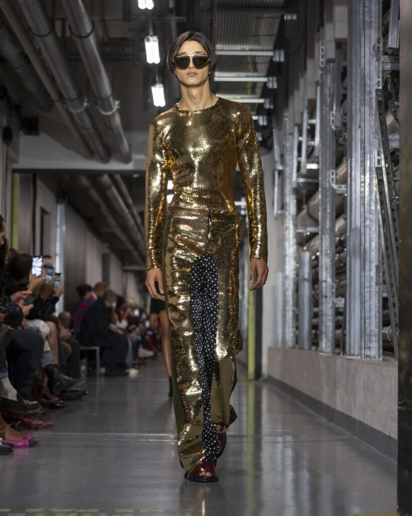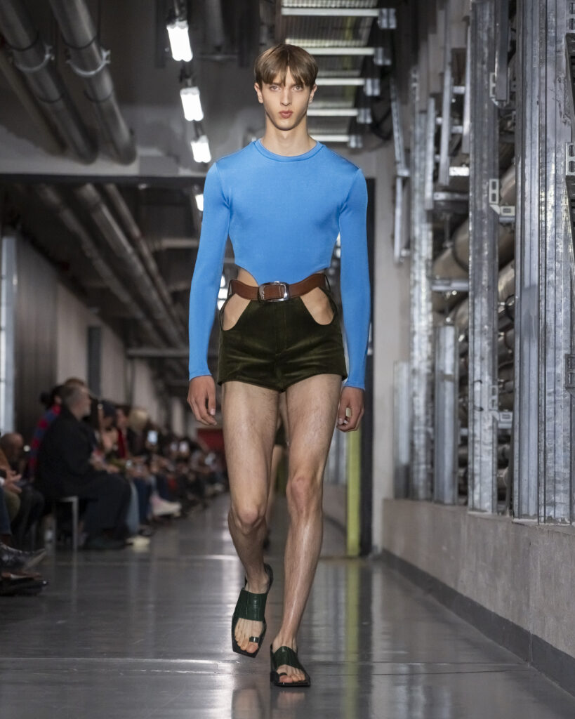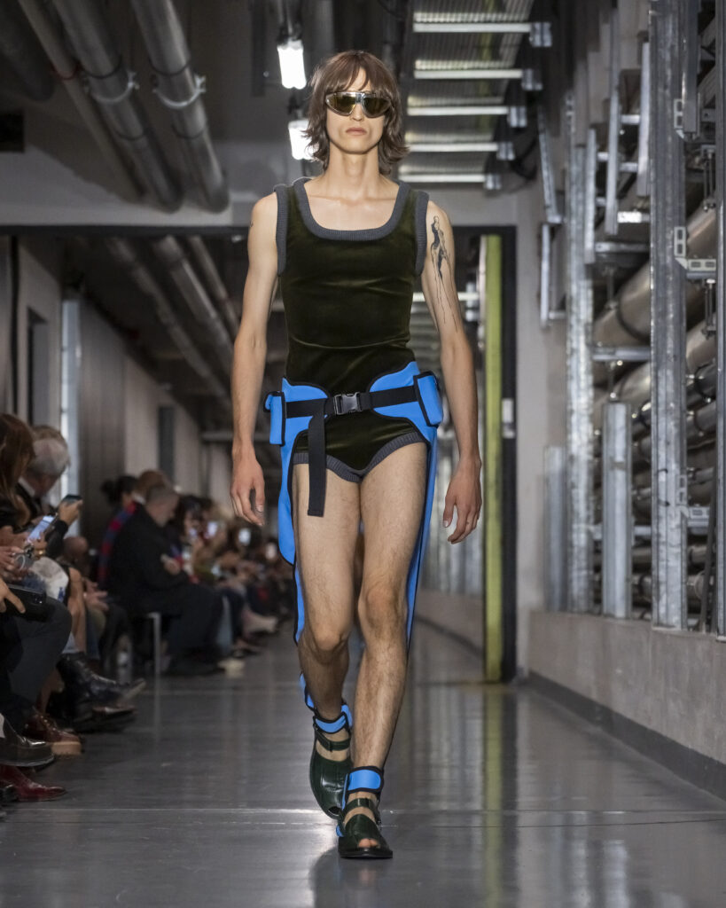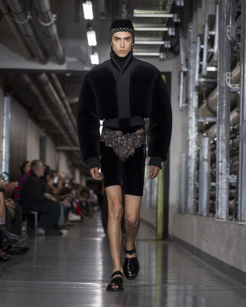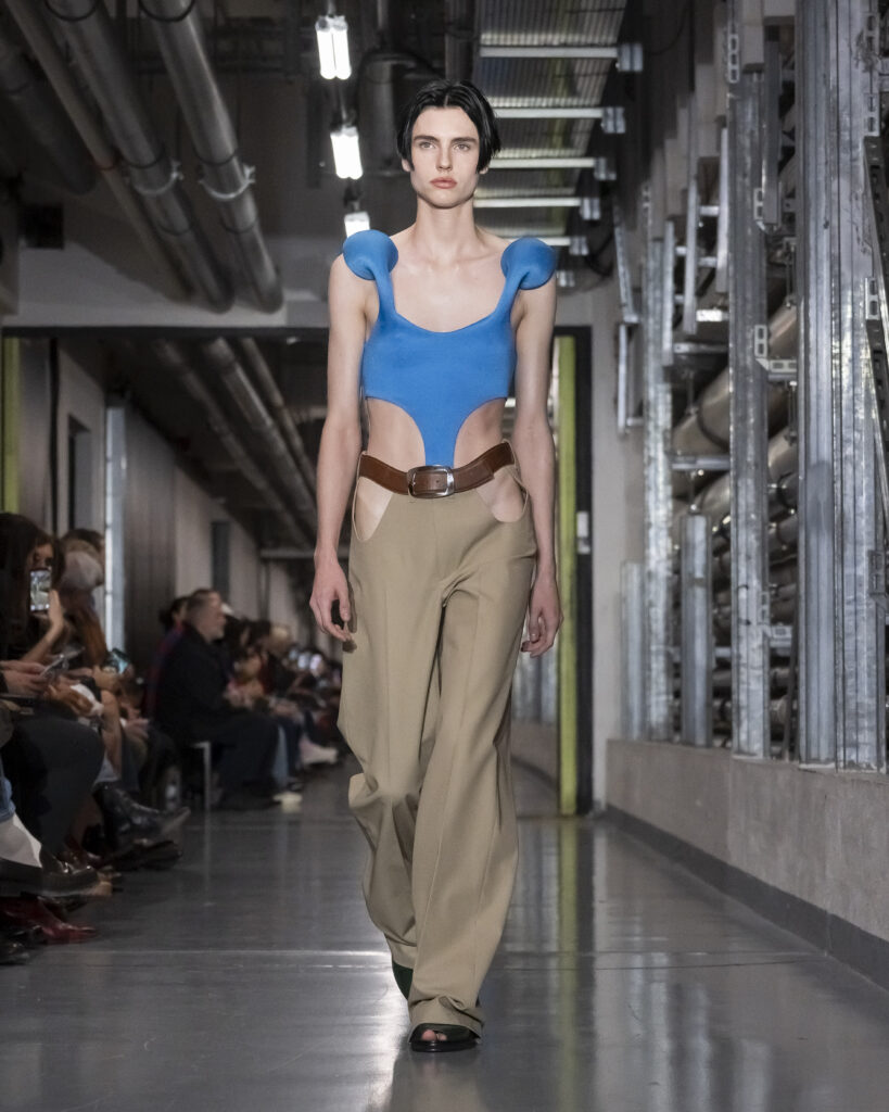 Cette collection procède ainsi par couches mémorielles. Elle convoque également John Giorno, poète et artiste américain disparu en 2019, dont les enregistrements hypnotiques accompagnent le travail de Lantink. Giorno, figure de l’avant-garde new-yorkaise, fondateur de Dial-a-Poem dès 1968, incarne une certaine idée de la transmission : la poésie comme flux continu, accessible à quiconque décroche le téléphone. La bande-son du défilé lui rend hommage, inscrivant la collection dans une filiation qui dépasse le vestiaire.
