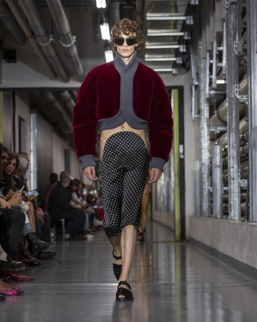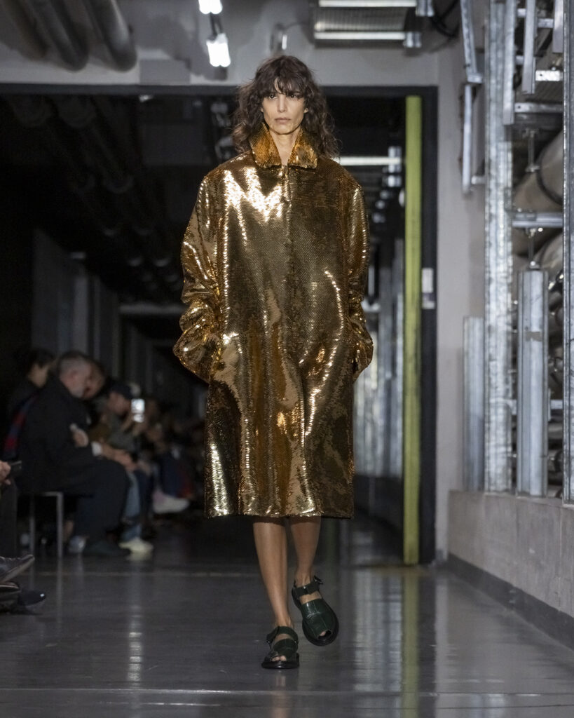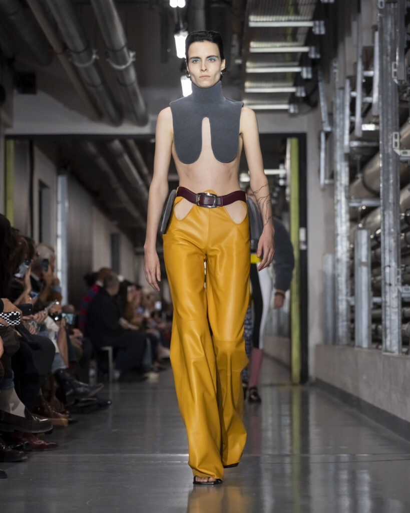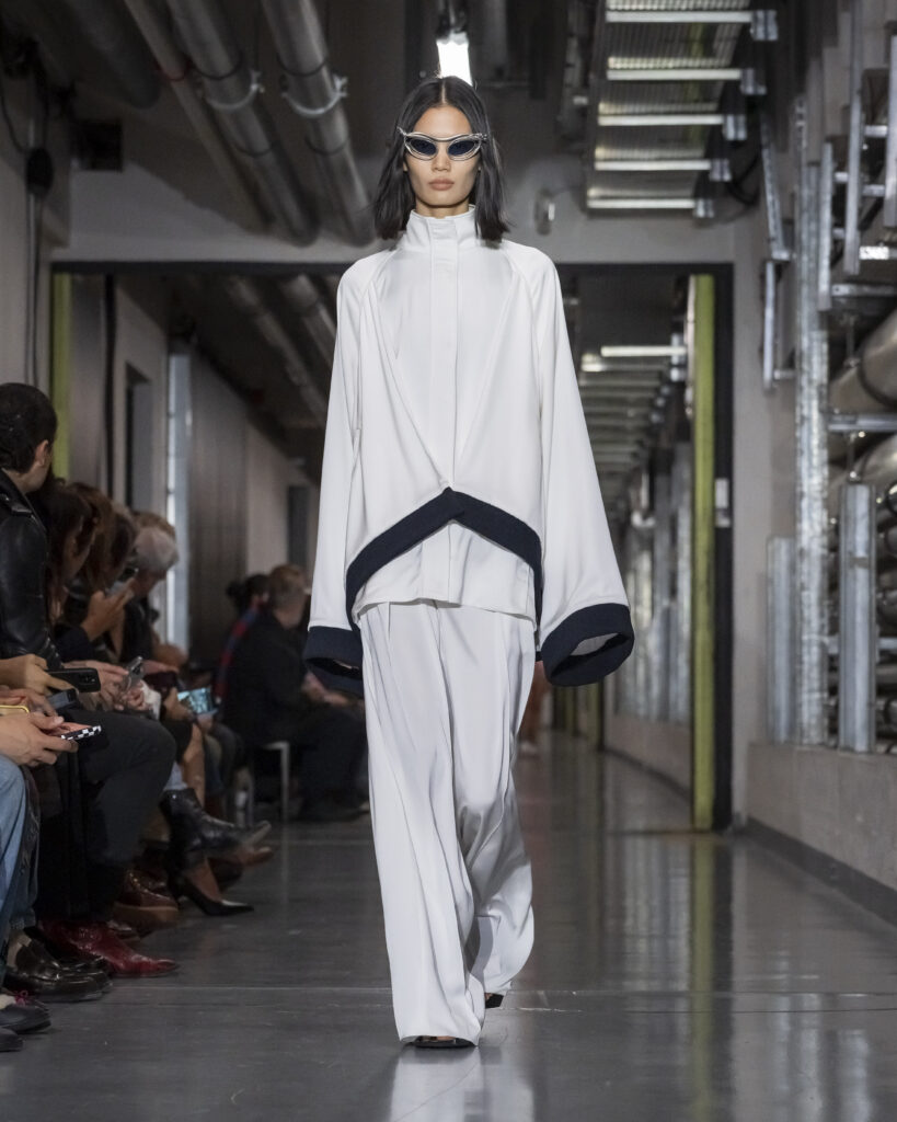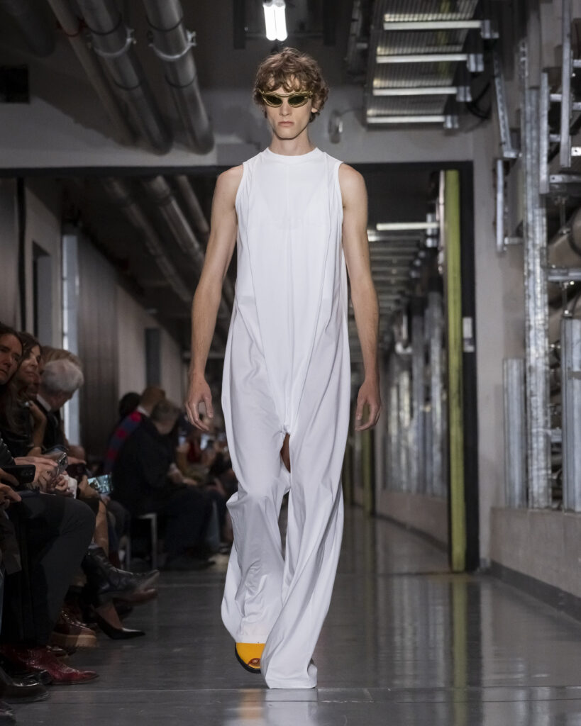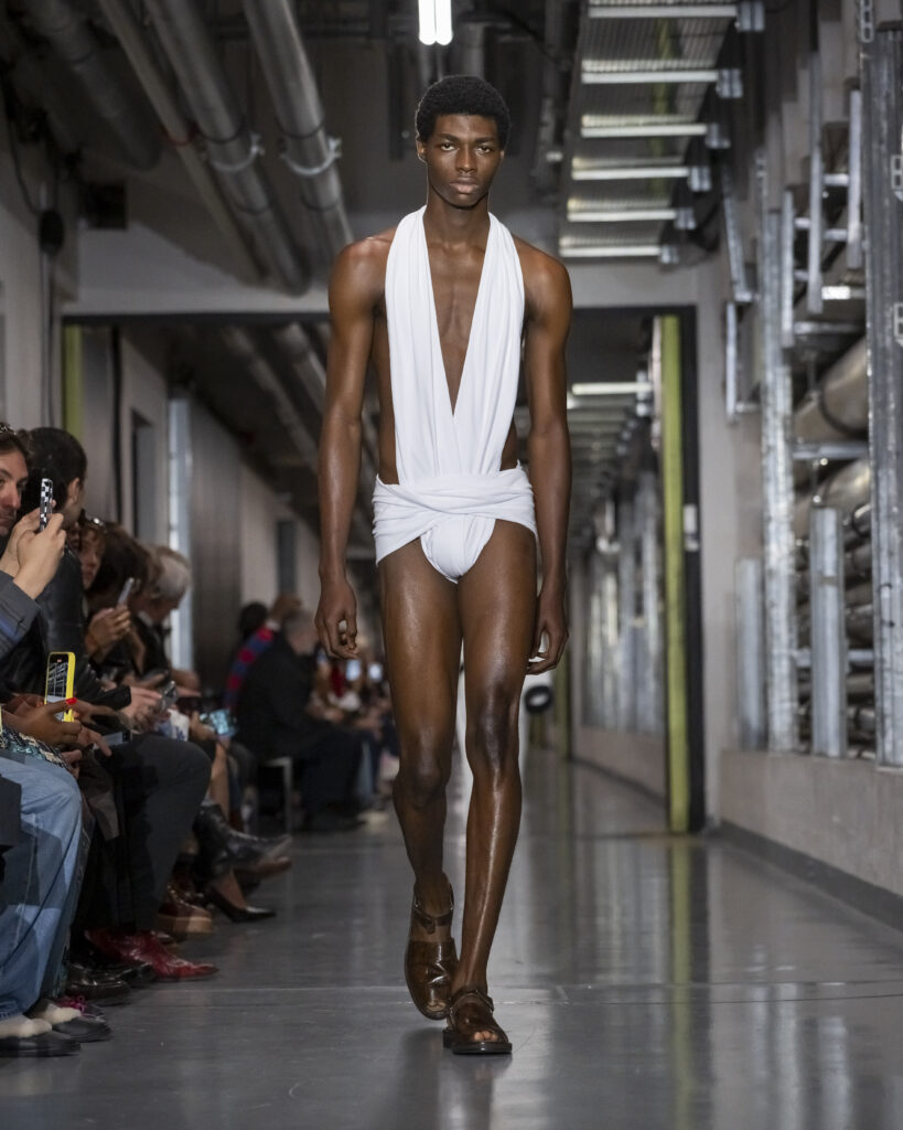 Cette collection procède ainsi par couches mémorielles. Elle convoque également John Giorno, poète et artiste américain disparu en 2019, dont les enregistrements hypnotiques accompagnent le travail de Lantink. Giorno, figure de l’avant-garde new-yorkaise, fondateur de Dial-a-Poem dès 1968, incarne une certaine idée de la transmission : la poésie comme flux continu, accessible à quiconque décroche le téléphone. La bande-son du défilé lui rend hommage, inscrivant la collection dans une filiation qui dépasse le vestiaire.