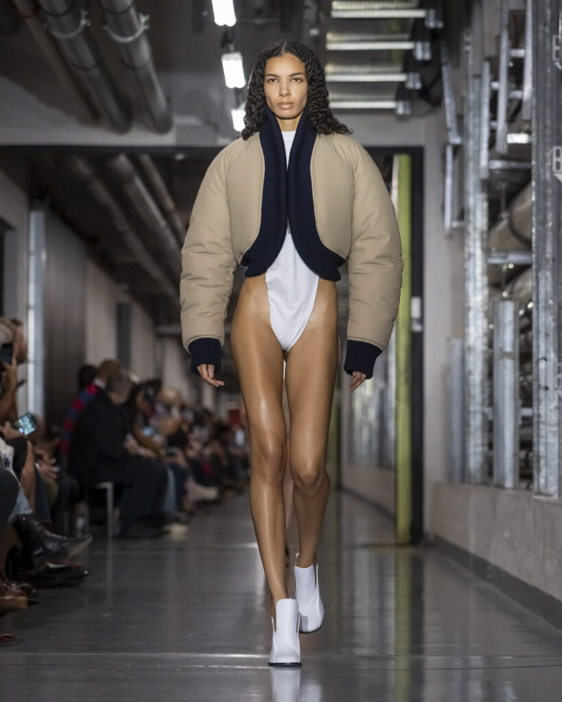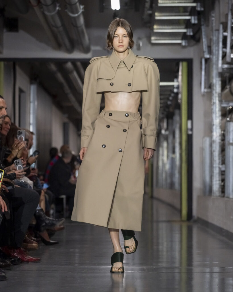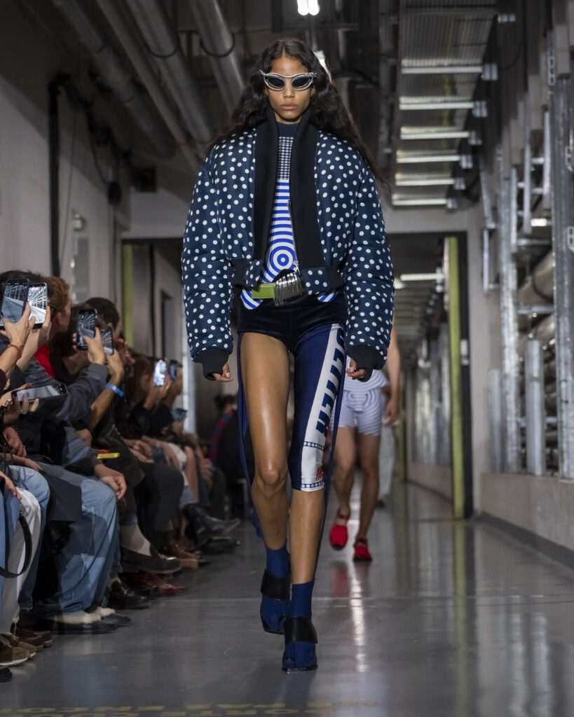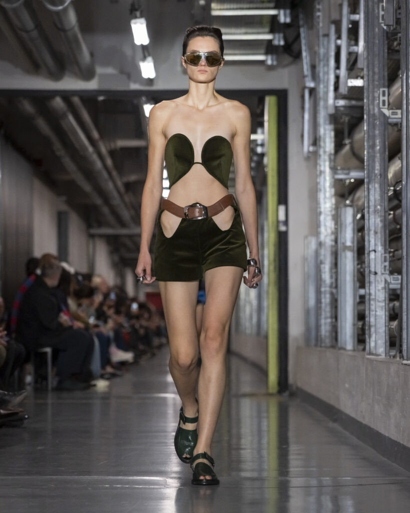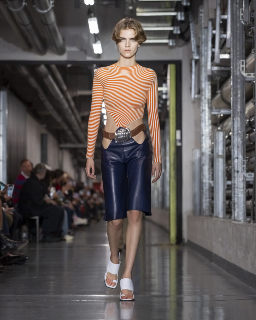 Cette collection procède ainsi par couches mémorielles. Elle convoque également John Giorno, poète et artiste américain disparu en 2019, dont les enregistrements hypnotiques accompagnent le travail de Lantink. Giorno, figure de l’avant-garde new-yorkaise, fondateur de Dial-a-Poem dès 1968, incarne une certaine idée de la transmission : la poésie comme flux continu, accessible à quiconque décroche le téléphone. La bande-son du défilé lui rend hommage, inscrivant la collection dans une filiation qui dépasse le vestiaire.