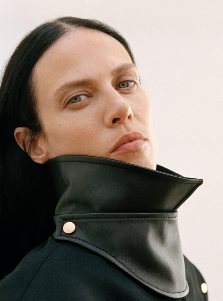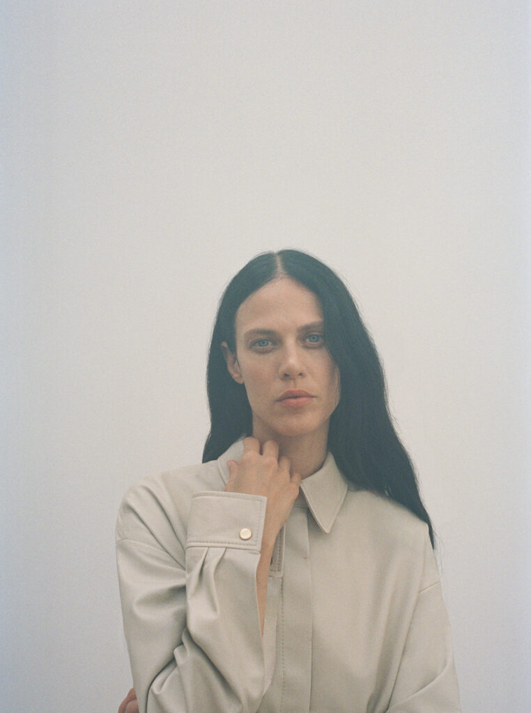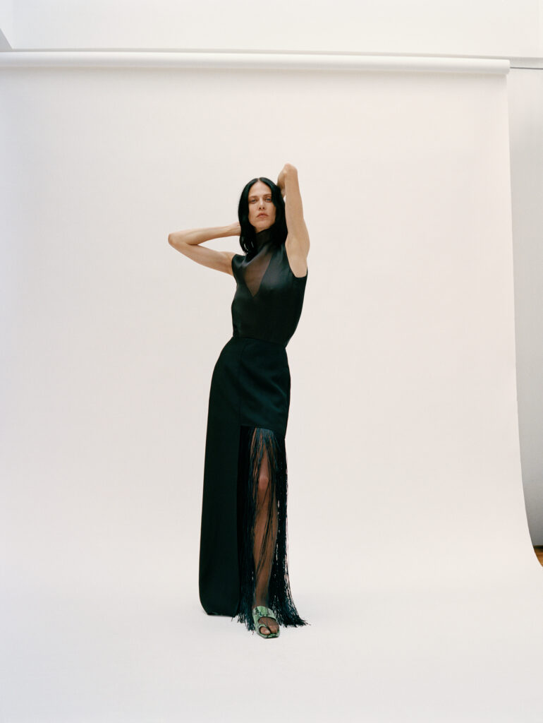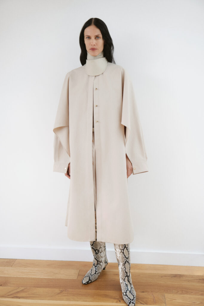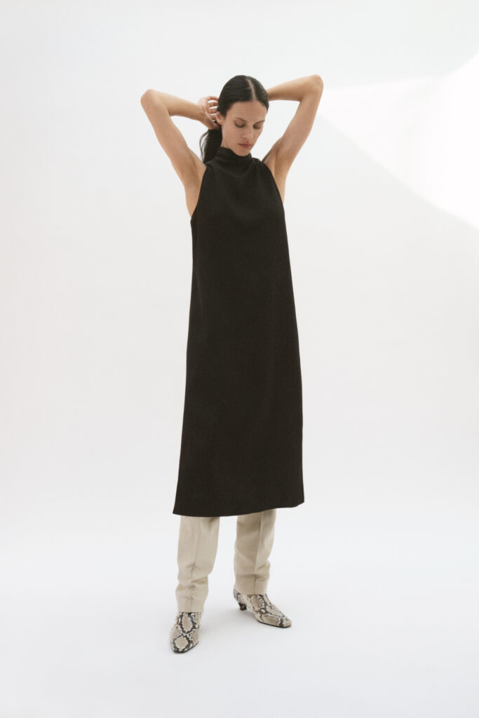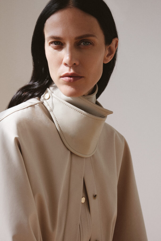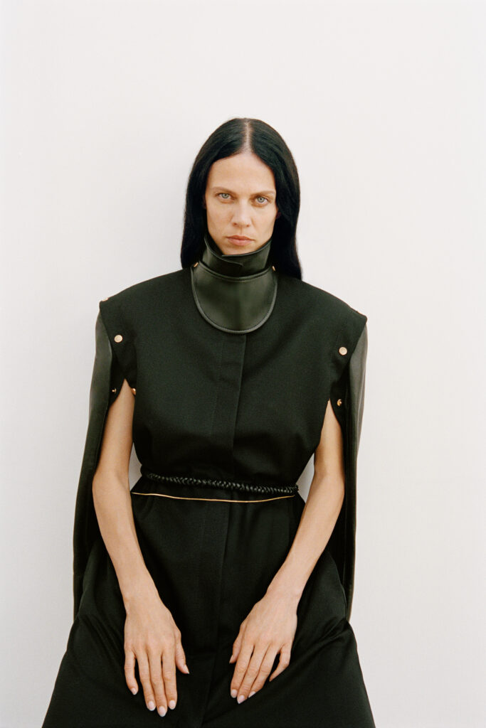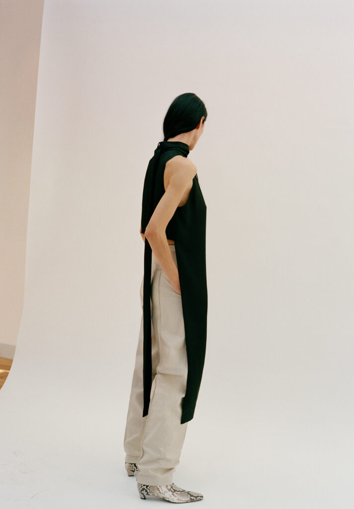 La construction des pièces oscille entre fluidité et architecture. Les chemises, pièces maîtresses de ce vestiaire, mutent pour évoquer des capes drapées, ouvertes sous les manches, libérant ainsi le geste. En contrepoint, les vestes affirment une structure plus autoritaire avec des épaules marquées. Cette dualité dessine une figure féminine consciente d’elle-même, naviguant dans une palette de couleurs majoritairement neutres, seulement rythmée par l’intensité du noir.