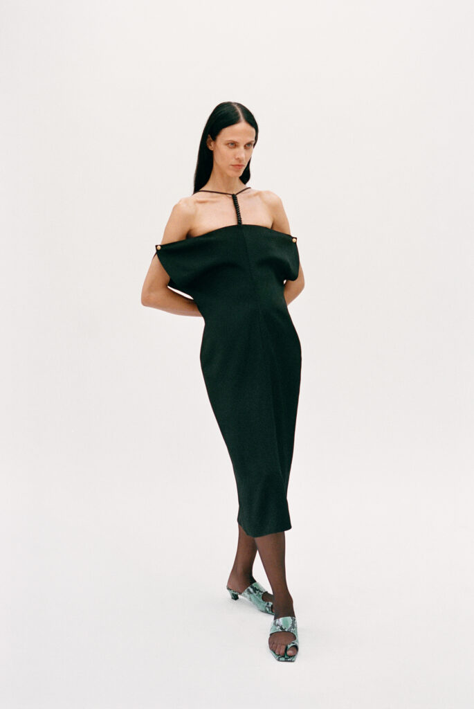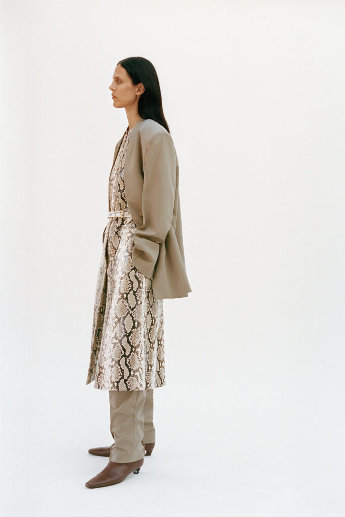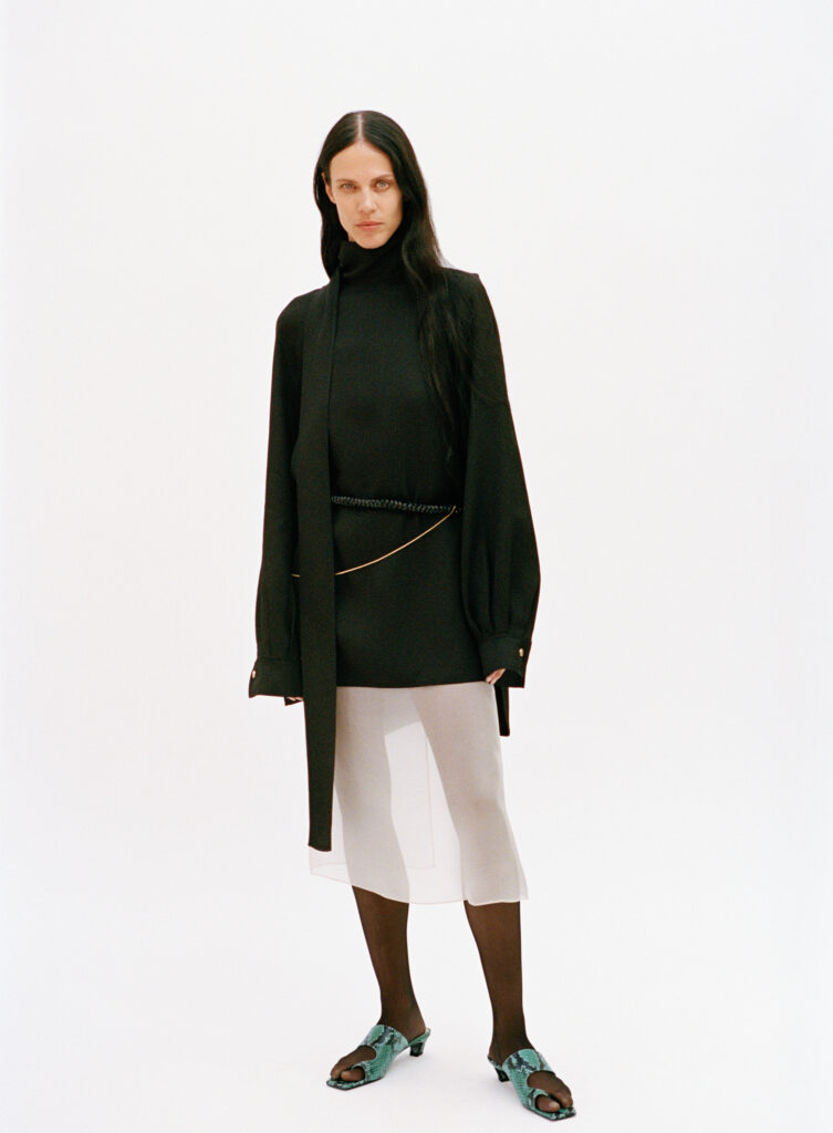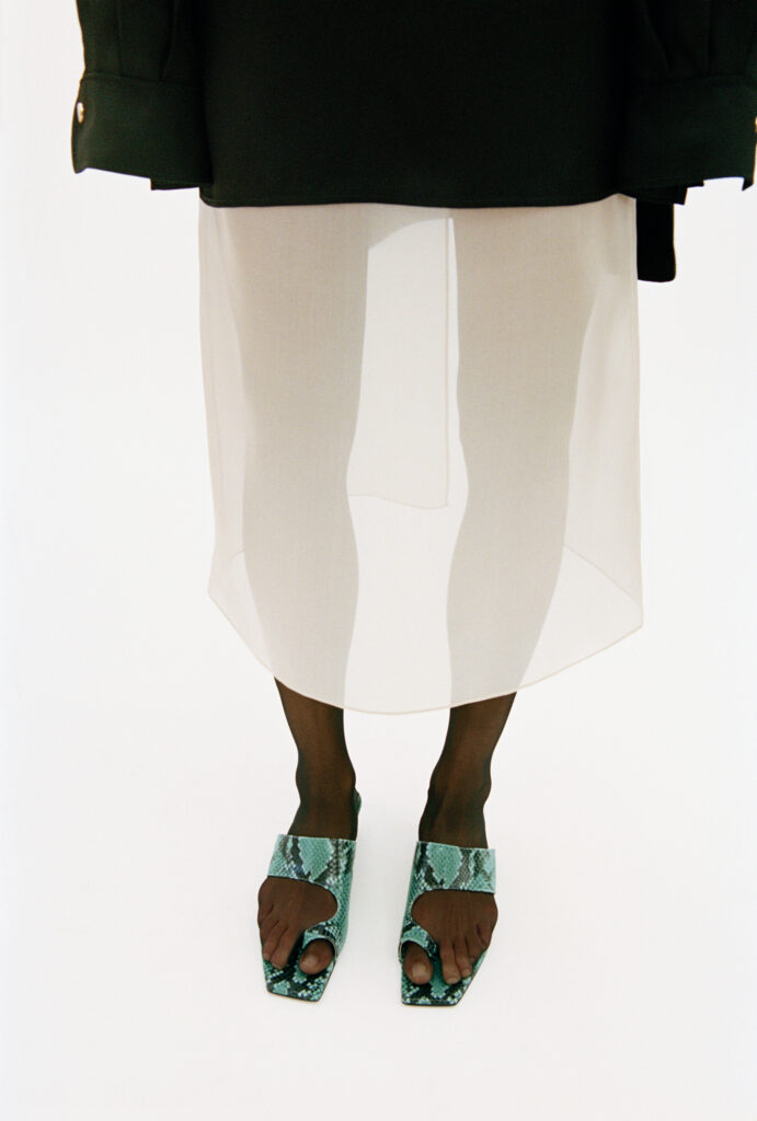 L’accessoire, chez Colangelo, s’intègre à la structure même du vêtement. Des cordons de cuir doublés de chaînes dorées assument une fonction polyvalente : tour à tour colliers se dévoilant sous un col, ceintures marquant la taille ou bretelles soutenant les robes. Enfin, la rigueur de l’ensemble est ponctuellement bousculée par des chaussures aux bouts allongés, notamment des sandales type tongs réalisées dans un python vert éclatant, seule concession vibrante à une esthétique de la retenue.