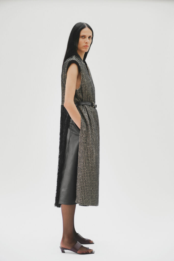 Au cœur de cette proposition vestimentaire réside un travail textile complexe : le tissage du raphia. Gabriele Colangelo élève cette matière naturelle en un jacquard sophistiqué, composé de fils de raphia bicolores. La structure du tissu suit un motif géométrique rigoureux, délibérément interrompu par de longues franges onduleuses qui apportent un mouvement cinétique à la silhouette. Cette alternance entre fixité et mouvement définit la ligne directrice de la saison, qualifiée d’essentielle par la Maison.