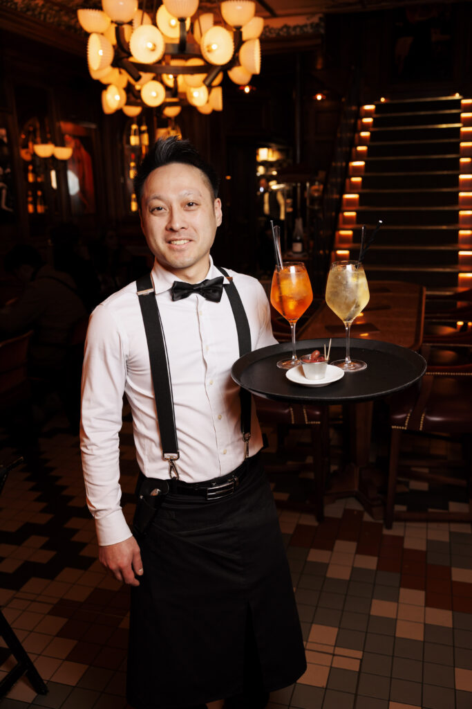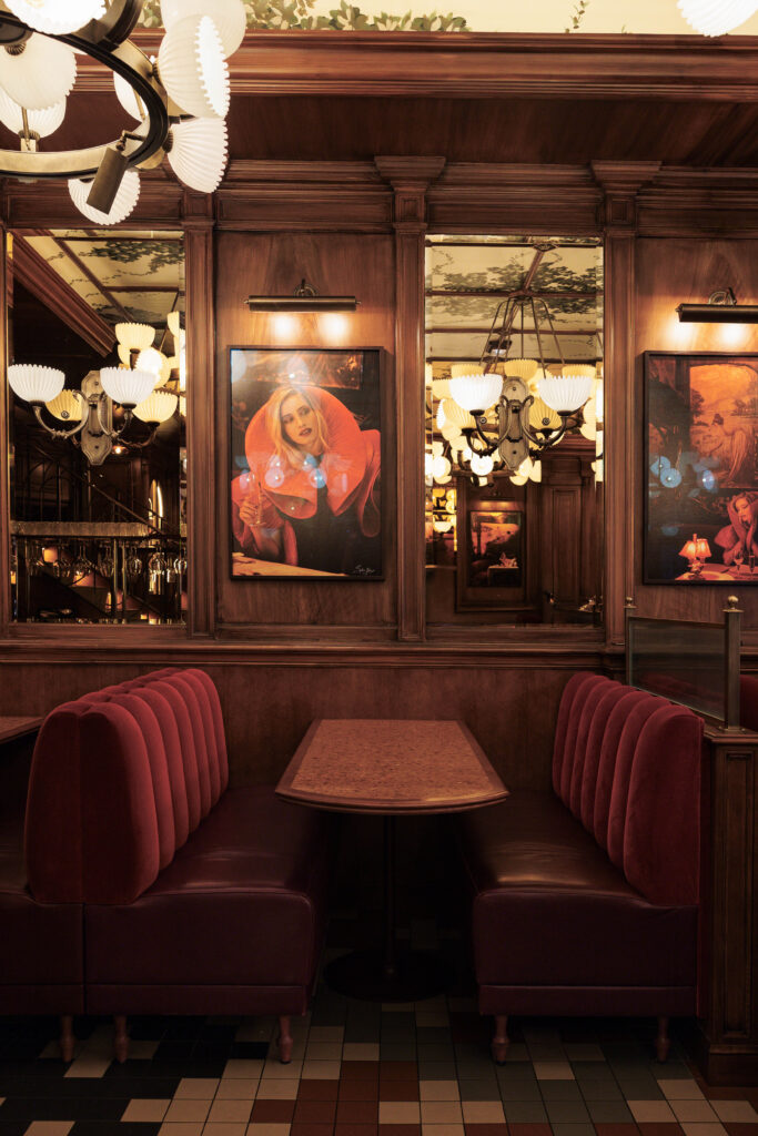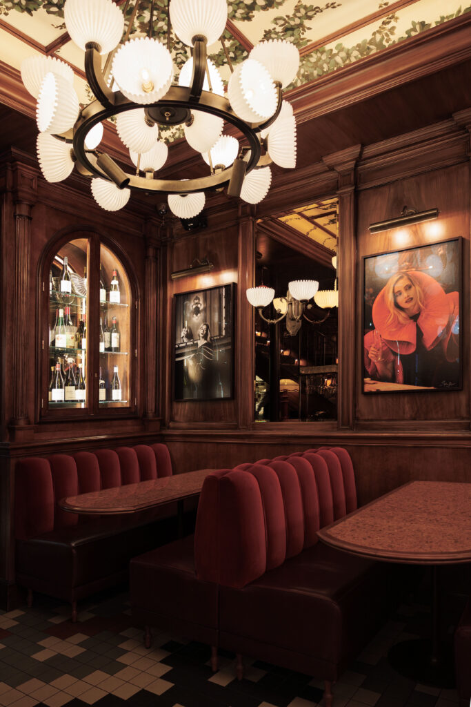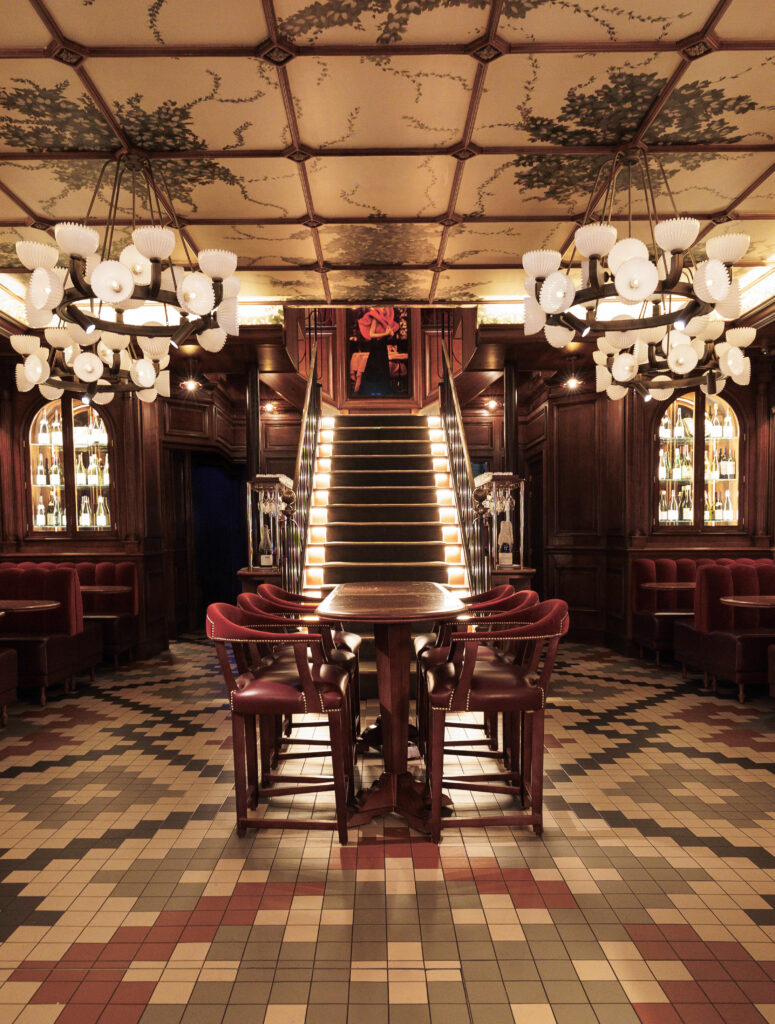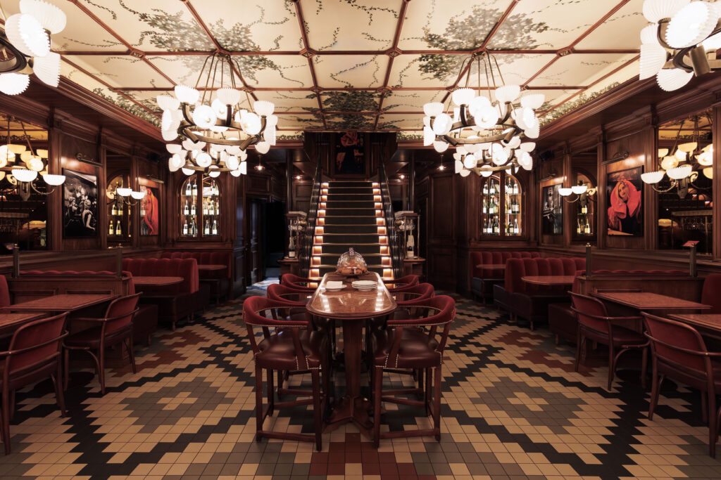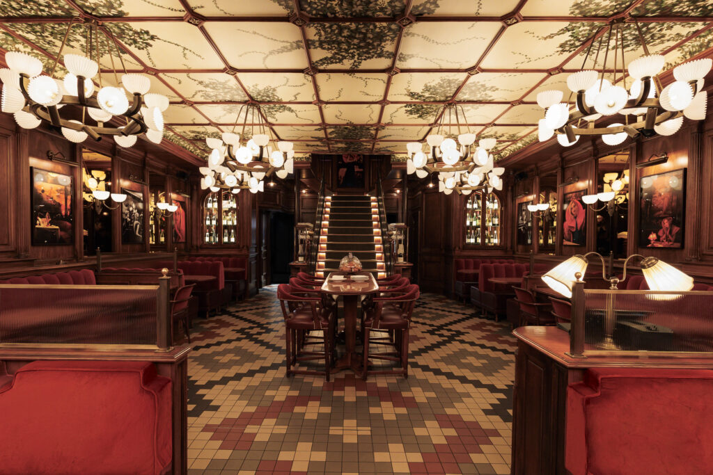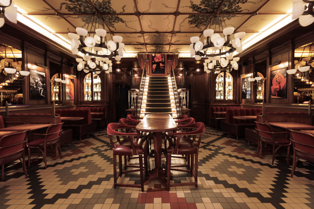 Pénétrer aux Capucines, c’est accepter de devenir l’acteur d’un film qui se jouerait dans le Paris des années 30. La métamorphose, orchestrée par le cabinet Richard Lafond, rend un hommage vibrant au monde du spectacle qui imprègne le quartier. Dès l’entrée, le regard est happé par un plafond constellé d’ampoules, écho direct aux cinémas d’antan, surplombant un sol en carreaux de couleurs et des boiseries nobles.
