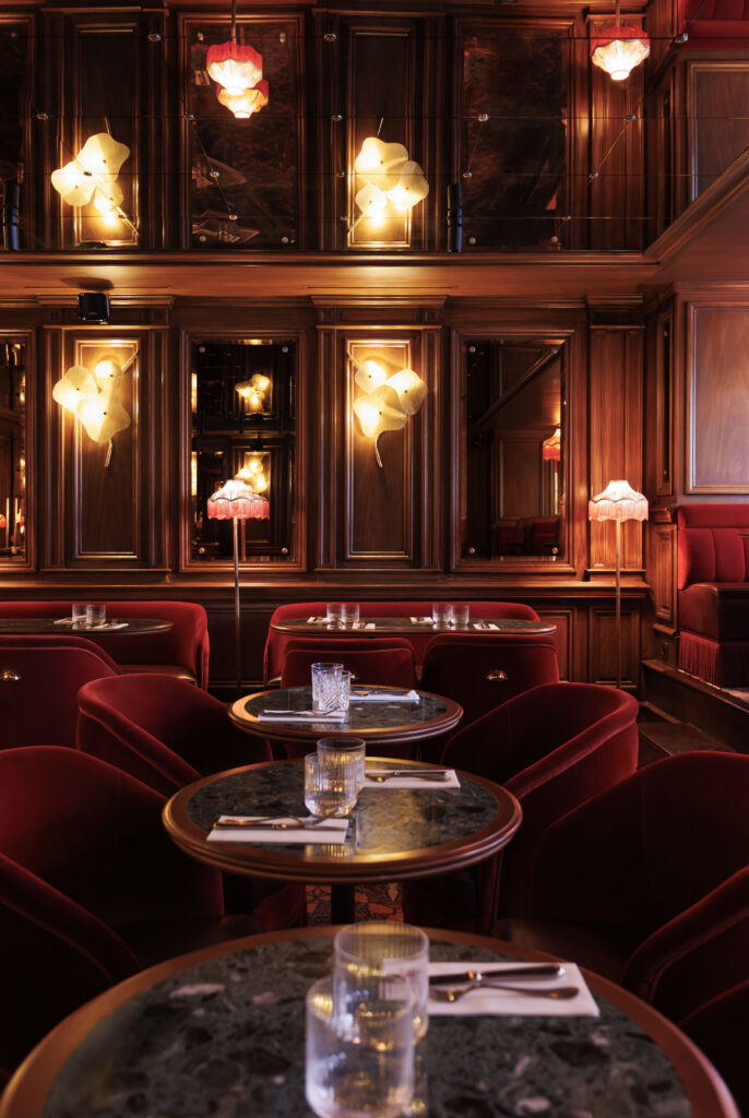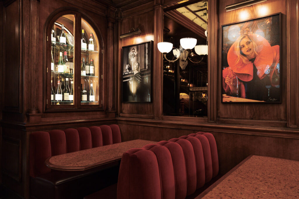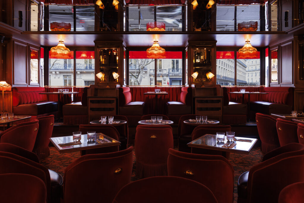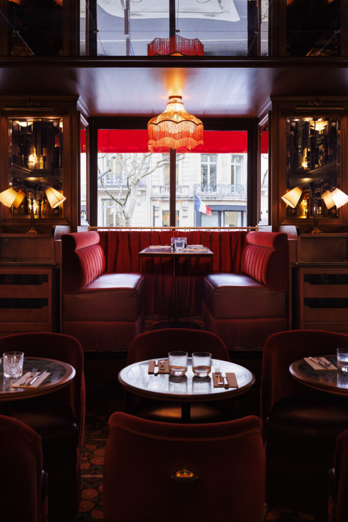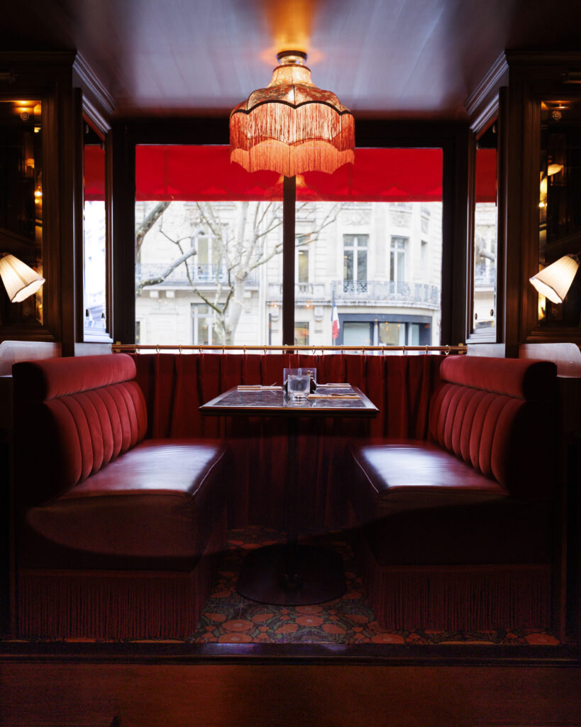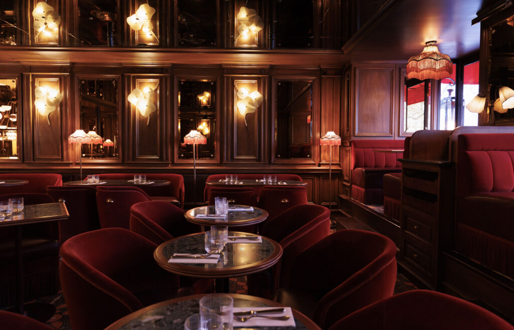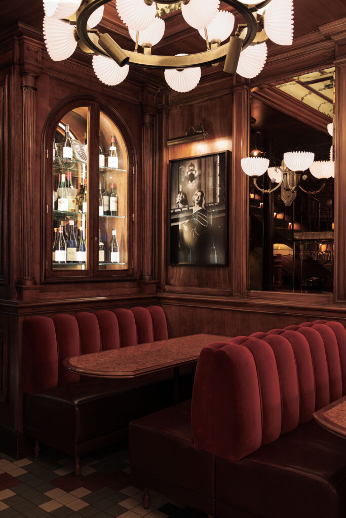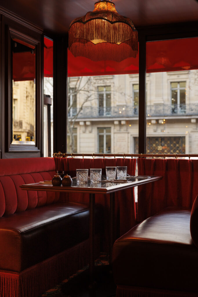 L’expérience se scinde en deux temps : l’effervescence de la brasserie au rez-de-chaussée, et l’intimité feutrée de l’étage. Là-haut, l’atmosphère se fait plus confidentielle, presque tactile. Les banquettes de velours et de cuir, déclinées dans des nuances de rouge bordeaux profond, invitent à la confidence, baignées par une lumière dorée et tamisée qui flatte les teints et les conversations.