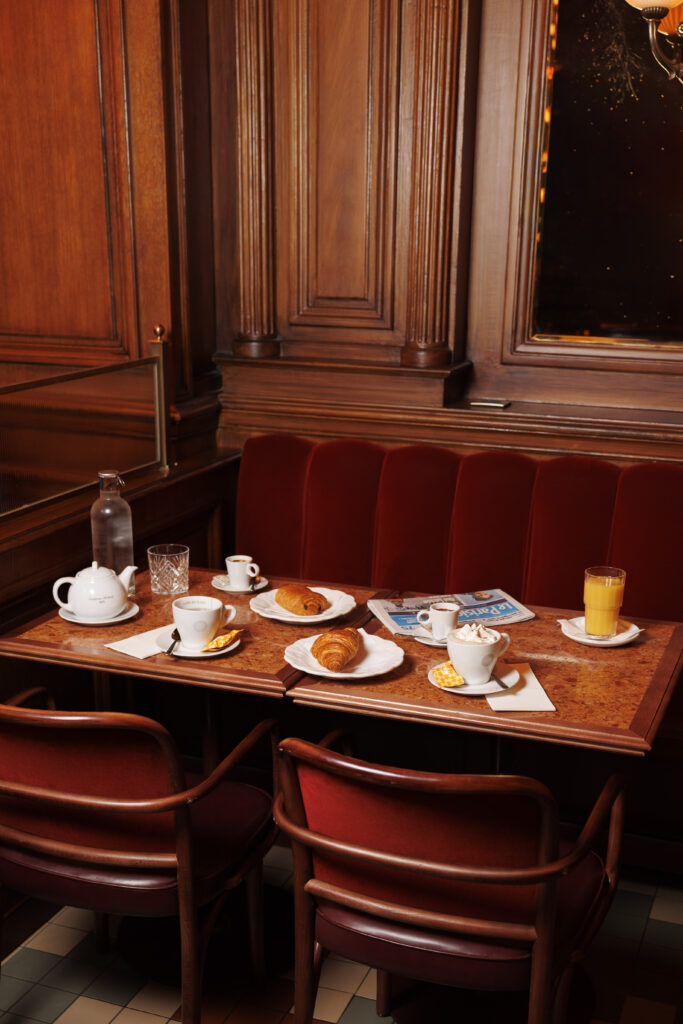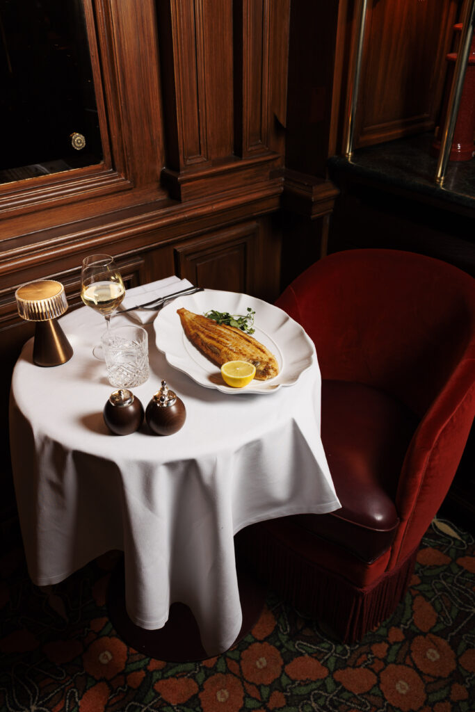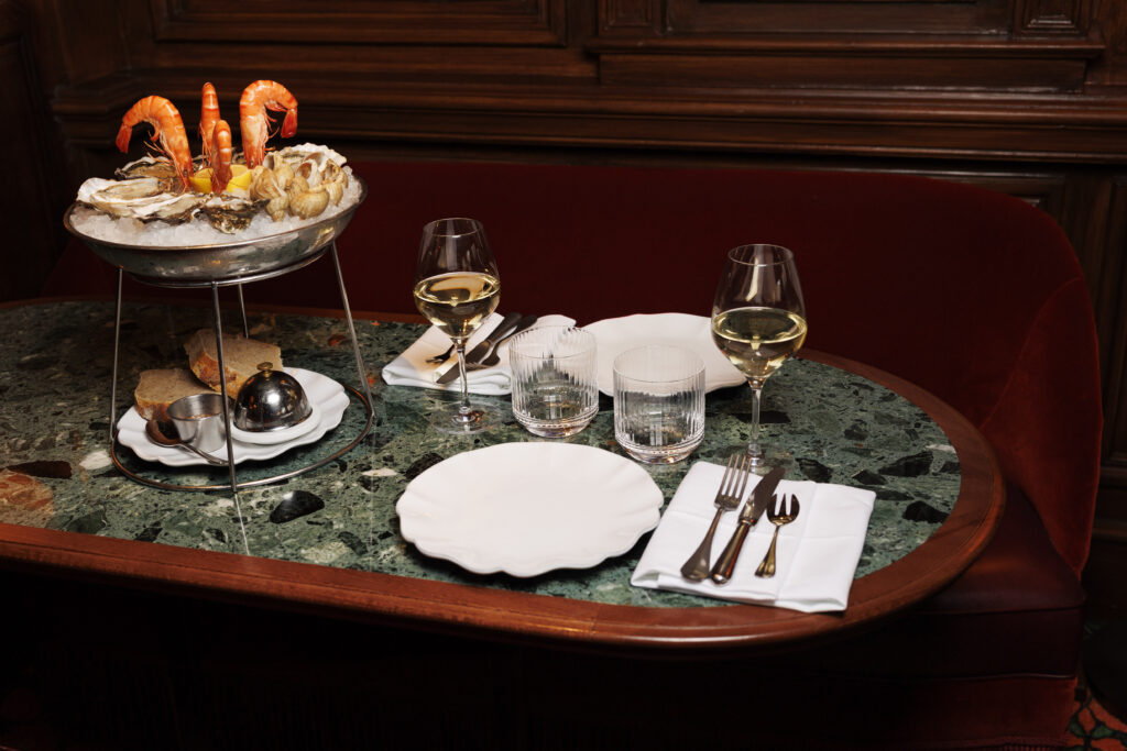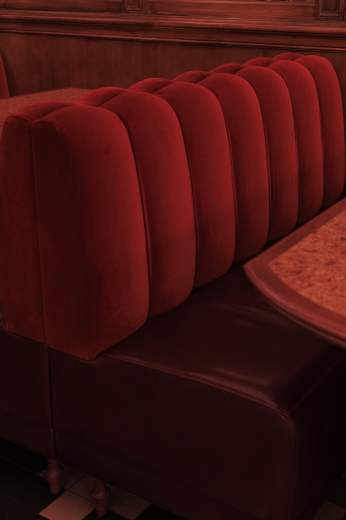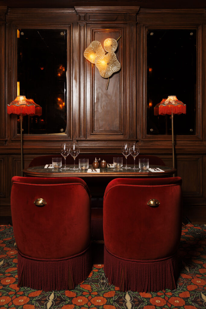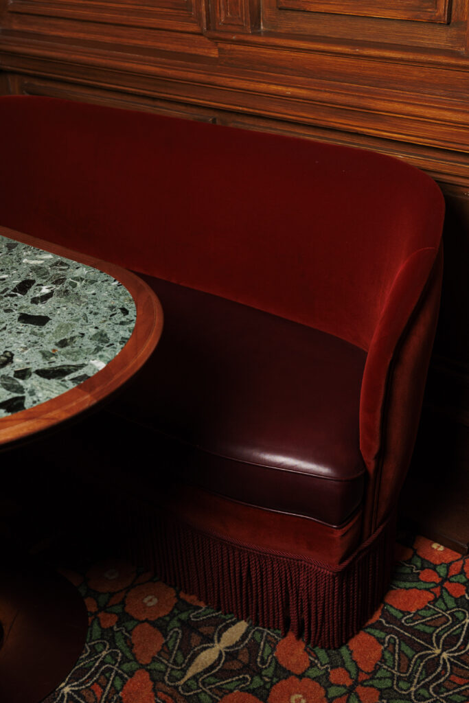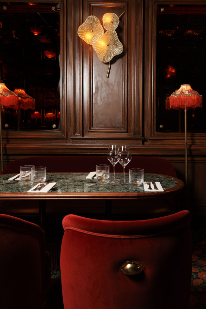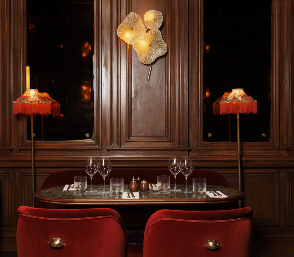 L’expérience se scinde en deux temps : l’effervescence de la brasserie au rez-de-chaussée, et l’intimité feutrée de l’étage. Là-haut, l’atmosphère se fait plus confidentielle, presque tactile. Les banquettes de velours et de cuir, déclinées dans des nuances de rouge bordeaux profond, invitent à la confidence, baignées par une lumière dorée et tamisée qui flatte les teints et les conversations.