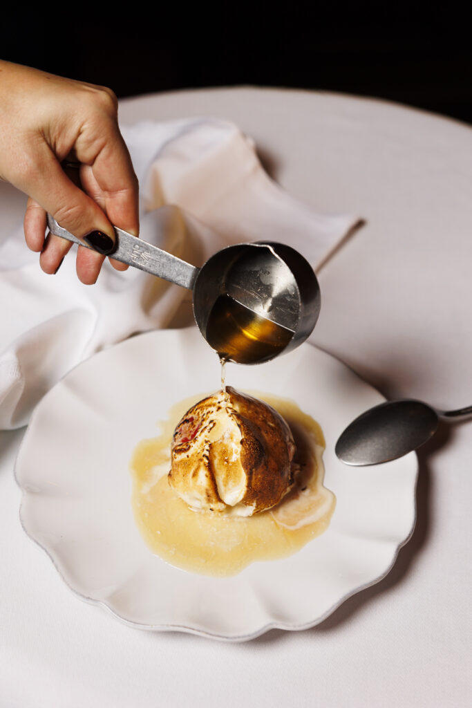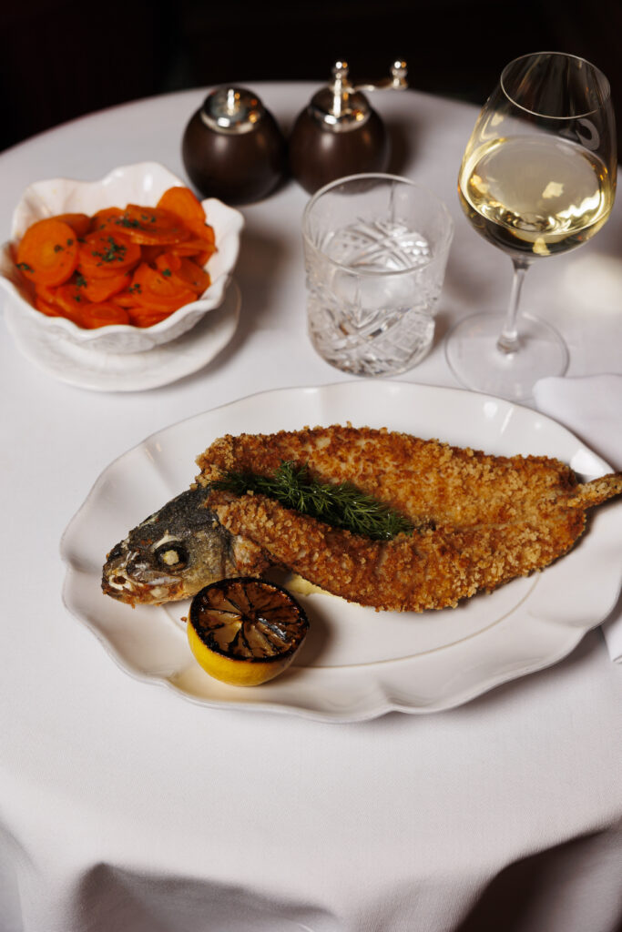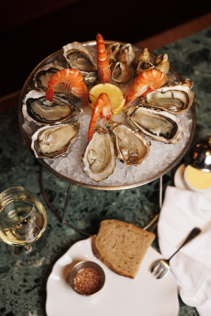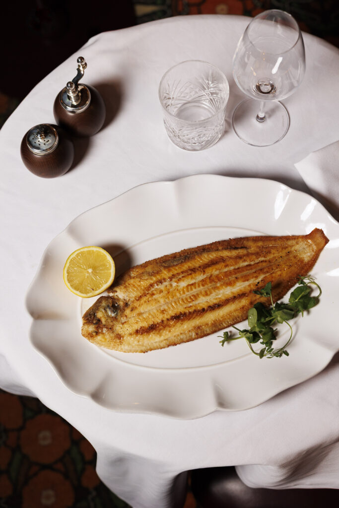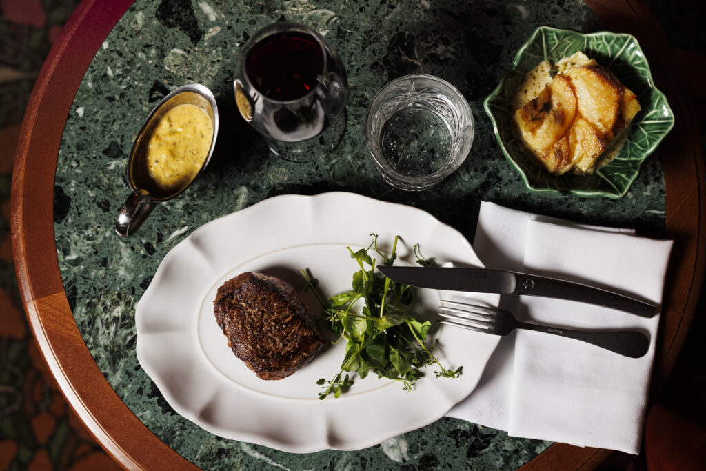 La carte célèbre les grands classiques avec une générosité assumée : la gratinée à l’oignon côtoie le plateau de l’écailler, tandis que le tartare de bœuf est préparé minute, au gré des envies du convive. Le point d’orgue ? Le service au guéridon, rituel presque oublié, où la sole meunière est préparée devant vous. En dessert, la nostalgie est de mise avec des profiteroles maison ou la spectaculaire omelette norvégienne flambée à table.