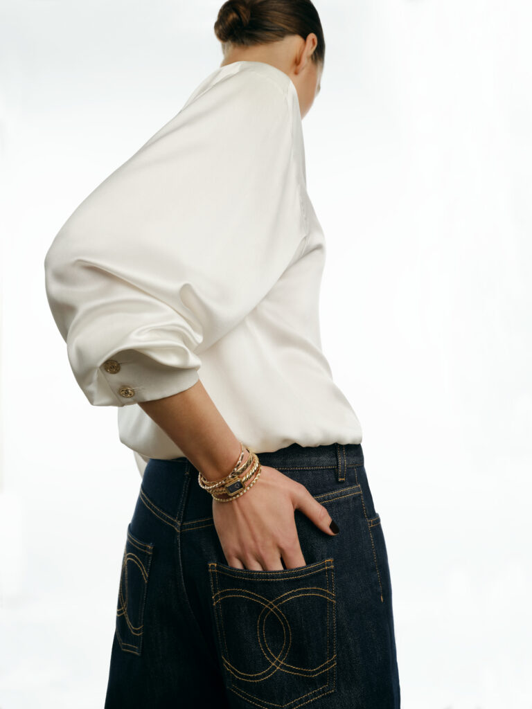 L’objet s’inscrit dans une filiation claire. Lancée en 1987, la montre Première marquait l’entrée de la Maison dans l’horlogerie avec une volonté d’émancipation des codes masculins, empruntant sa géométrie octogonale au bouchon du parfum N°5. Si le modèle originel jouait sur la fluidité d’une chaîne entrelacée de cuir, cette itération 2025 fige le mouvement dans un bracelet jonc rigide. Le métal précieux est travaillé pour imiter la texture torsadée, tricotée ou tissée du galon, créant une tension tactile entre l’aspect fibreux du motif et la froideur lisse de l’or jaune.