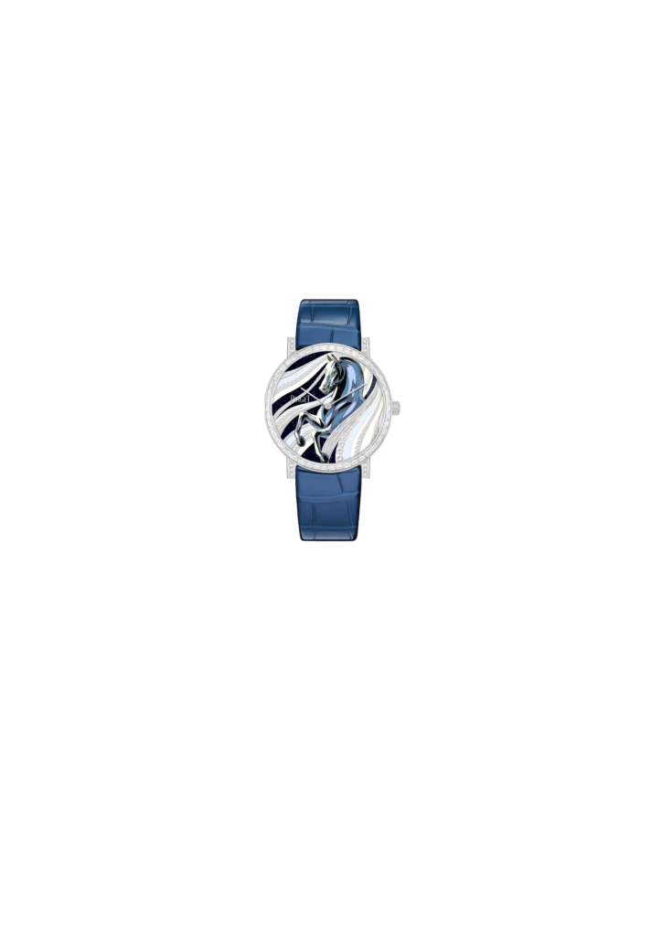 Cette sculpture vivante utilise la technique de l’émail cloisonné — une spécialité de l’artiste — où des fils d’or délimitent les zones de couleur, capturant des dégradés de bleu, de gris et de blanc. Le fond du cadran, travaillé au burin pour créer un drapé en relief, accueille également le célèbre « décor Palace », cette gravure signature de Piaget depuis les années 1960, ici rehaussée de diamants taille brillant. Le résultat est onirique : la tension musculaire de l’équidé et les reflets de sa robe semblent vibrer sous la lumière, transformant le garde-temps en une fresque miniature en perpétuel mouvement.