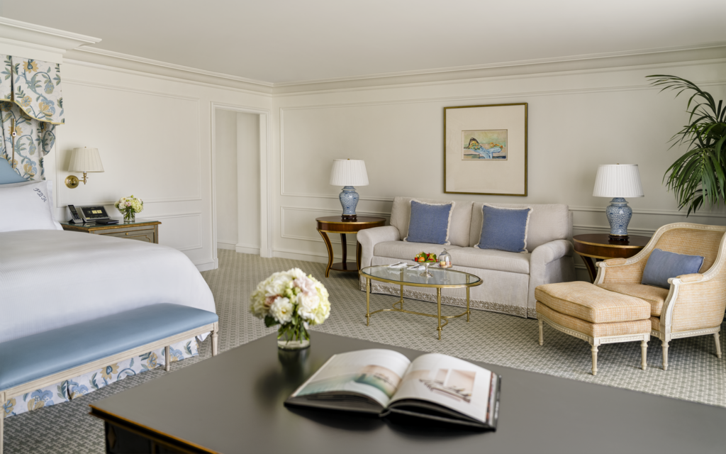 Chaque chambre a été repensée dans ses moindres détails afin de concilier beauté et fonctionnalité. Nouveaux bureaux, surfaces en quartz marbré, étoffes d’inspiration française et mobilier sur mesure composent un décor où le confort s’exprime sans ostentation. L’introduction de bergères et de canapés élégants illustre l’attachement de l’hôtel au savoir-faire artisanal, tandis que l’optimisation de la circulation et de la lumière naturelle renforce la sensation d’espace et de fluidité.