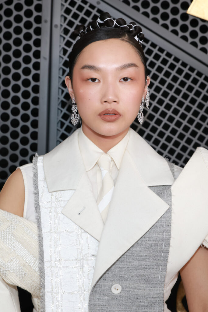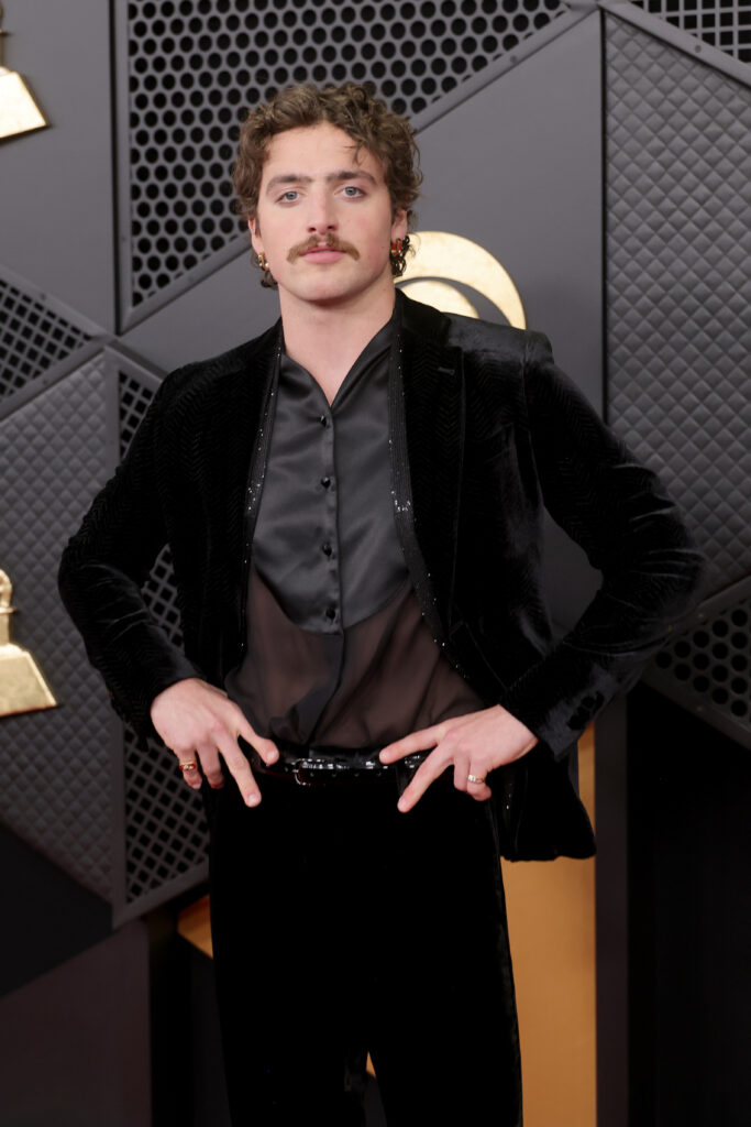 Harry Styles, présentateur de l’Album of the Year remis à Bad Bunny, choisit Dior : veste de bar à revers en pointe en laine et soie grise, jean denim bleu, chaussures Dior. Une sobriété calculée qui contraste avec les tenues de scène habituelles du chanteur — rappel que le Grammy n’est pas un concert, mais une cérémonie.