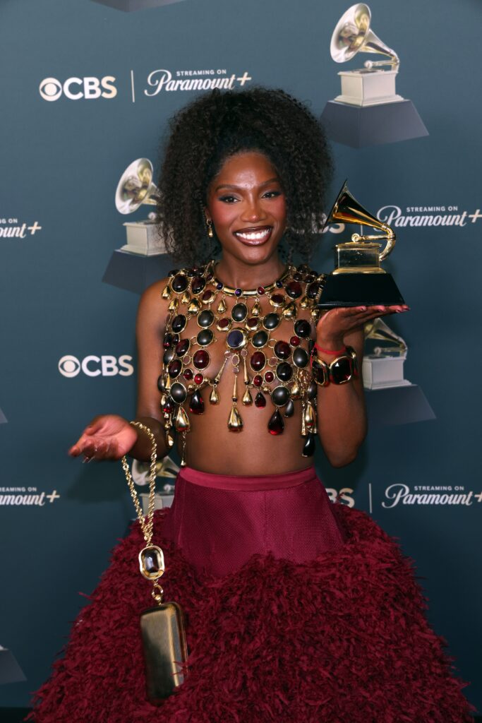 La maison Givenchy habille également Doechii, lauréate du Best Music Video, dans une création sur mesure de Sarah Burton : haut bijou accompagné d’une jupe en organza brodé bordeaux à taille basse, châle assorti, sandales Boudoir et pochette métallique dorée ornée de pierreries.