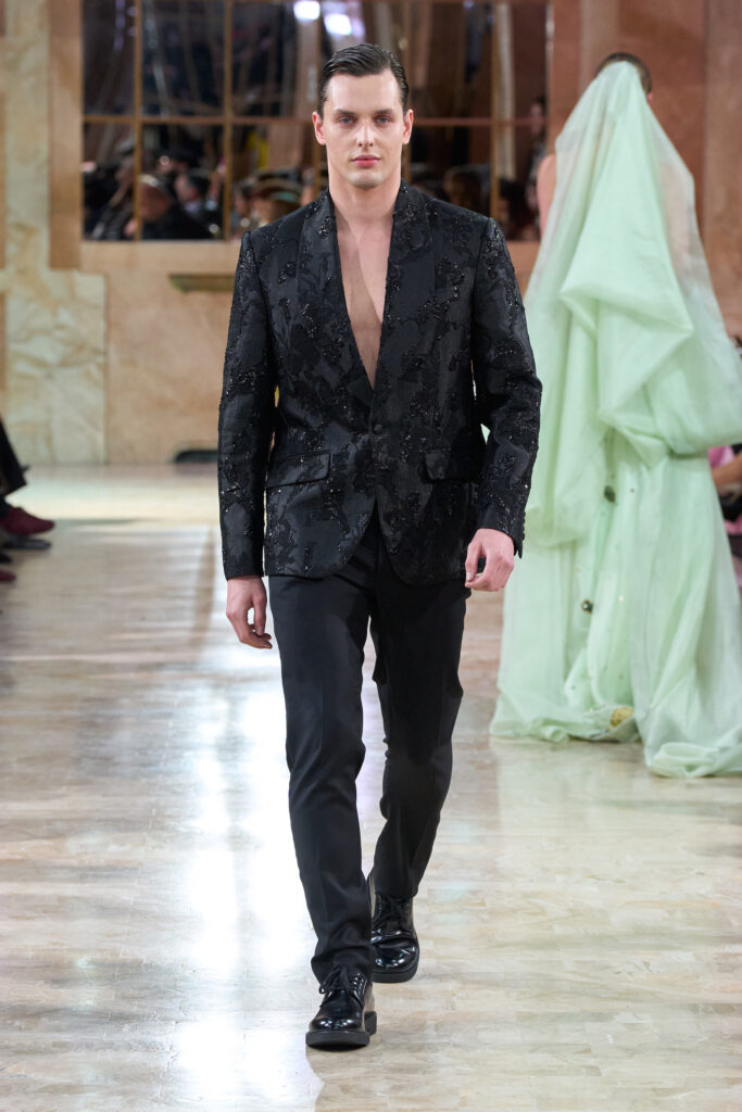 Les silhouettes féminines se construisent sur le contraste entre force et délicatesse, sublimé par un haut niveau de savoir-faire artisanal. Taffetas, satin de soie duchesse, chiffon aérien et crêpe de soie fluide composent une plasticité complexe mais légère. Les broderies de sequins réalisées à la main, les incrustations baroques et les corsets métalliques sculpturaux confèrent aux ensembles une dimension architecturale et lumineuse. La ligne masculine s’inscrit dans la même dynamique, proposant des capes majestueuses richement brodées, où la puissance s’allie à une légèreté visuelle.