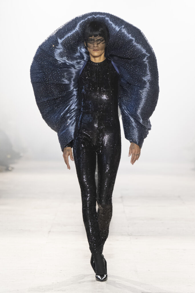 Sur le podium, un dialogue silencieux s’établit entre l’homme, la nature et le temps, capturé dans le tissu et la pierre. Cette œuvre poursuit le dialogue de la maison avec la haute couture, transformant chaque mouvement en métaphore du cycle cosmique.