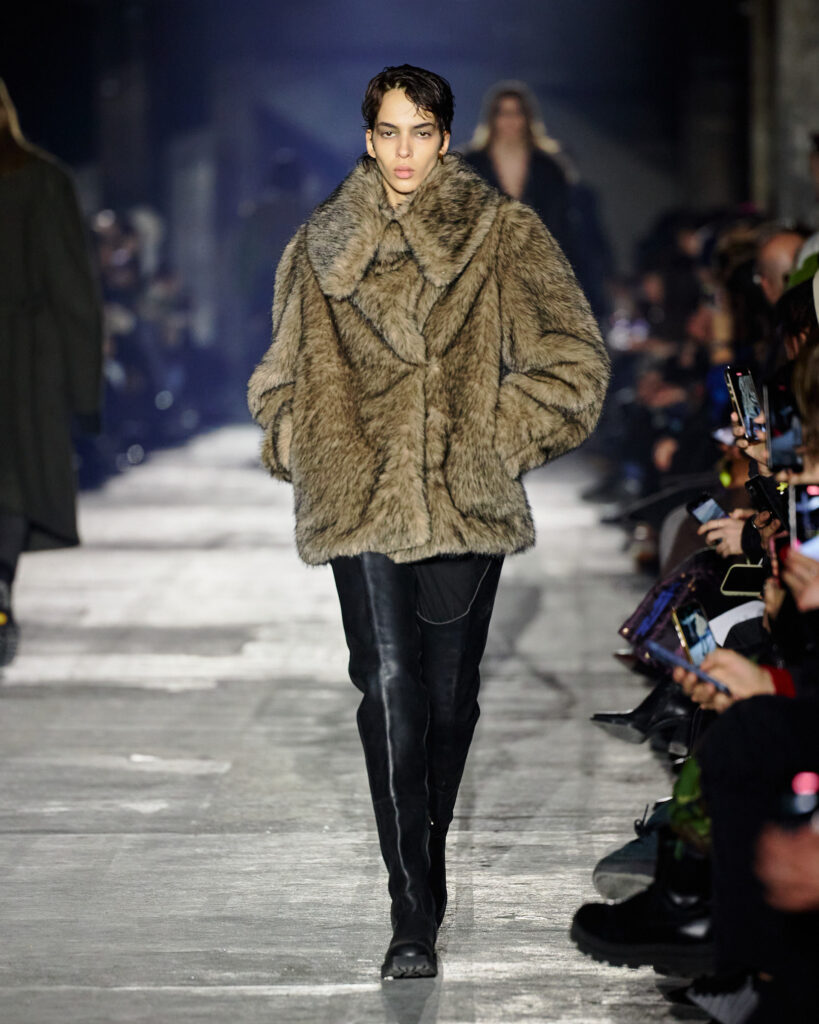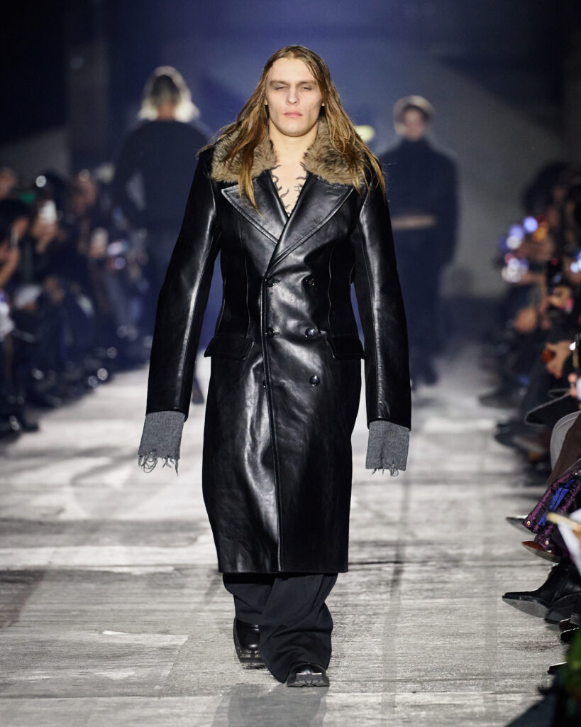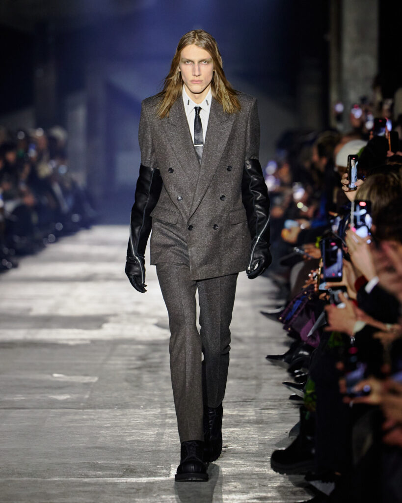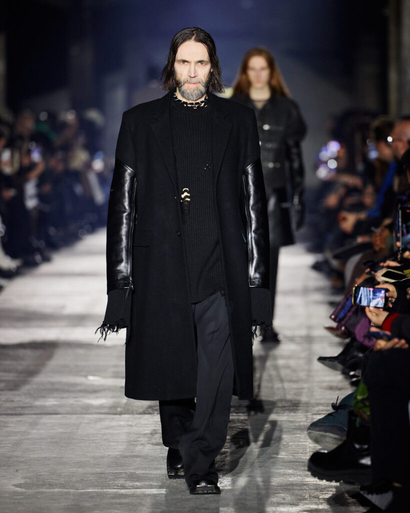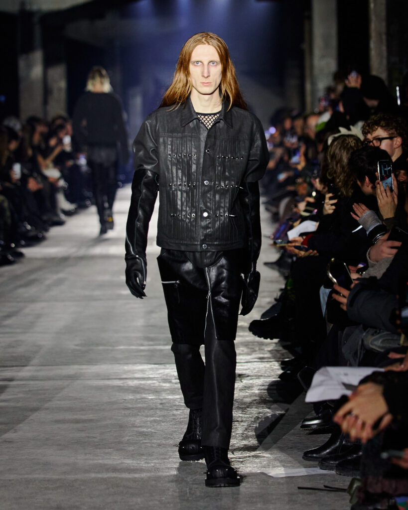 La silhouette de cette saison ne se contente pas d’habiller ; elle impose une attitude. Puisant dans son passé de boxeur professionnel, Arashi Yanagawa a construit des pièces qui forcent le corps à adopter une garde. Les manches, radicalement déportées vers l’avant, et les lignes d’épaules projetées créent un dos voûté, évocation directe de la tension qui précède l’affrontement. Cette ingénierie textile, dépourvue de tout ornement superflu, transforme le manteau long et le blouson de cuir en dispositifs de protection psychologique.