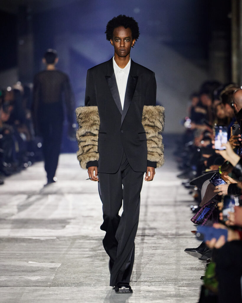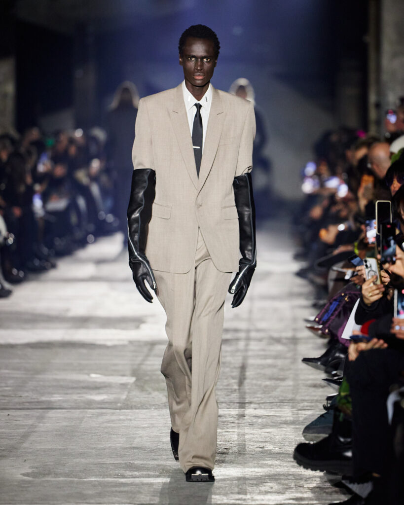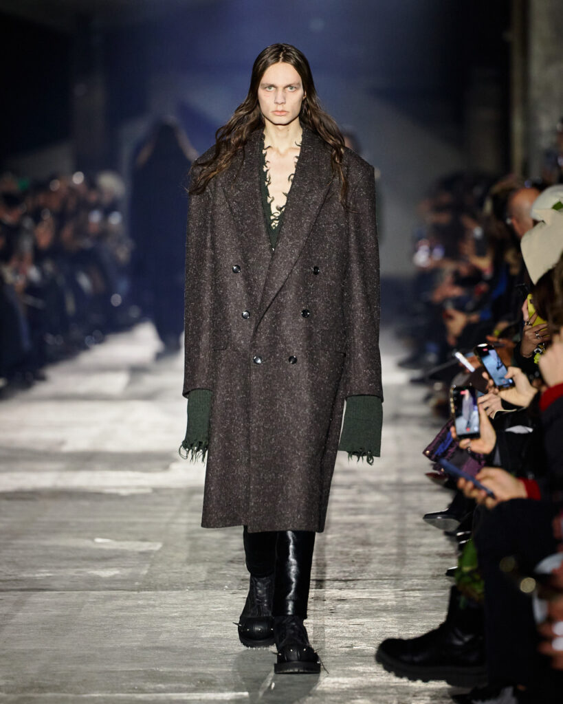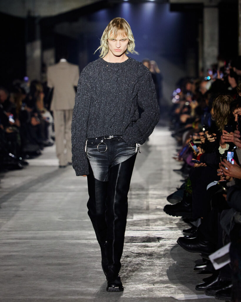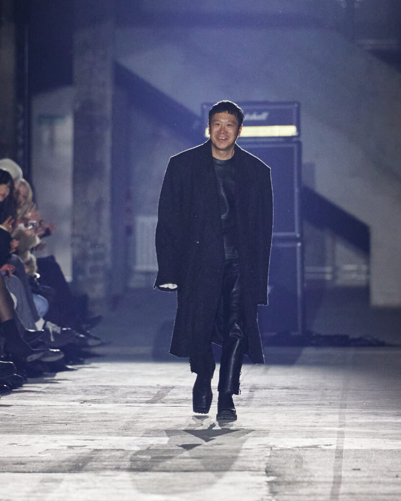 La silhouette de cette saison ne se contente pas d’habiller ; elle impose une attitude. Puisant dans son passé de boxeur professionnel, Arashi Yanagawa a construit des pièces qui forcent le corps à adopter une garde. Les manches, radicalement déportées vers l’avant, et les lignes d’épaules projetées créent un dos voûté, évocation directe de la tension qui précède l’affrontement. Cette ingénierie textile, dépourvue de tout ornement superflu, transforme le manteau long et le blouson de cuir en dispositifs de protection psychologique.