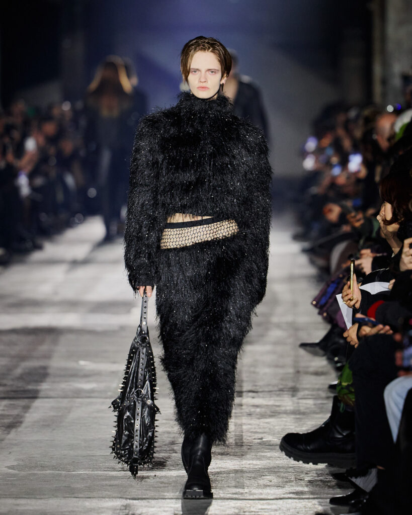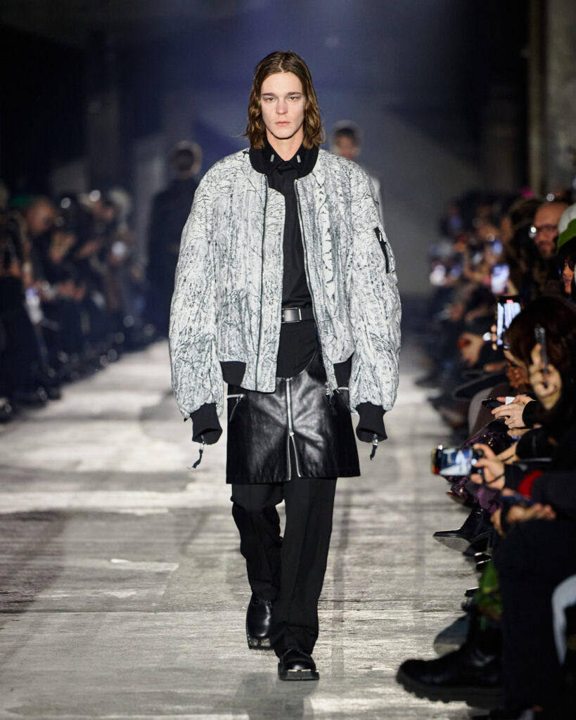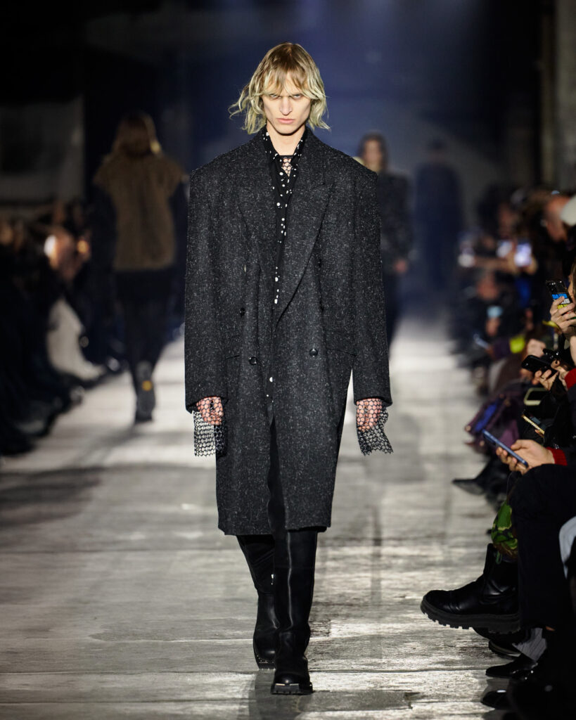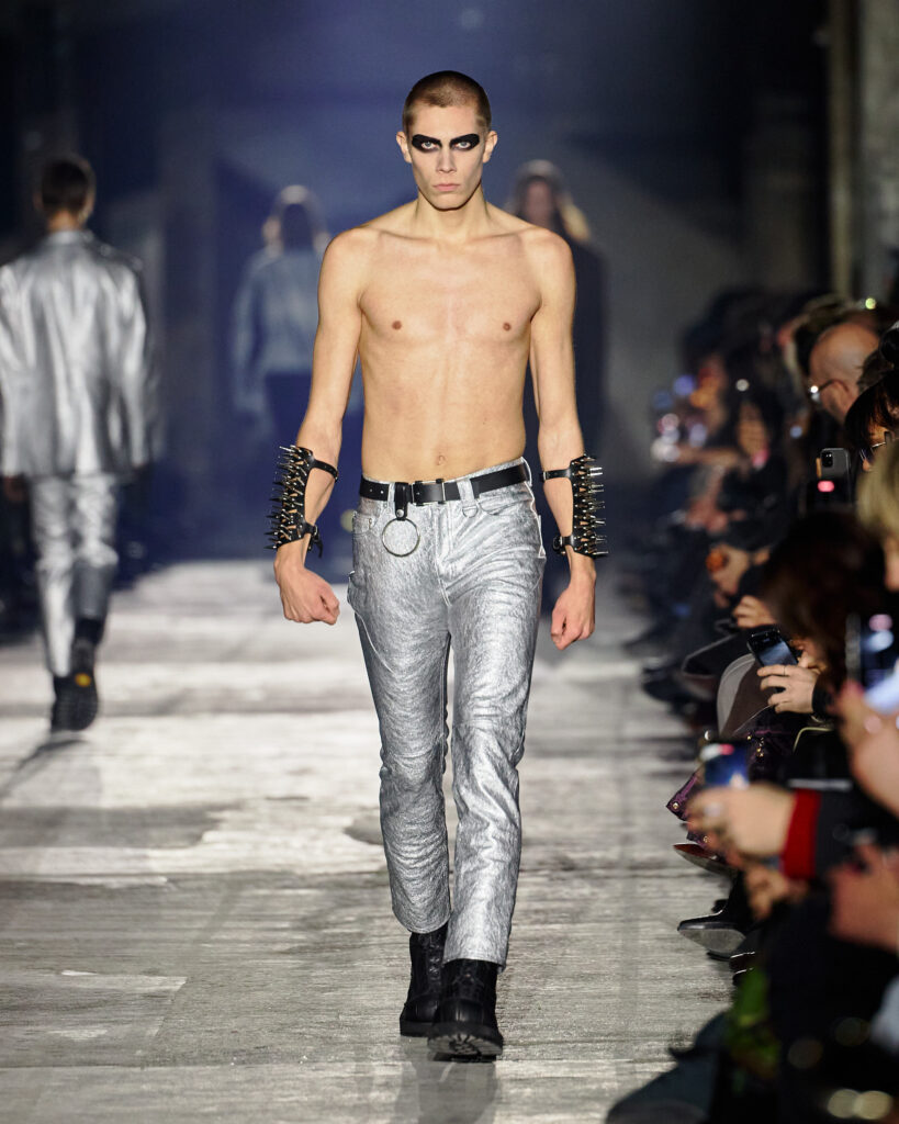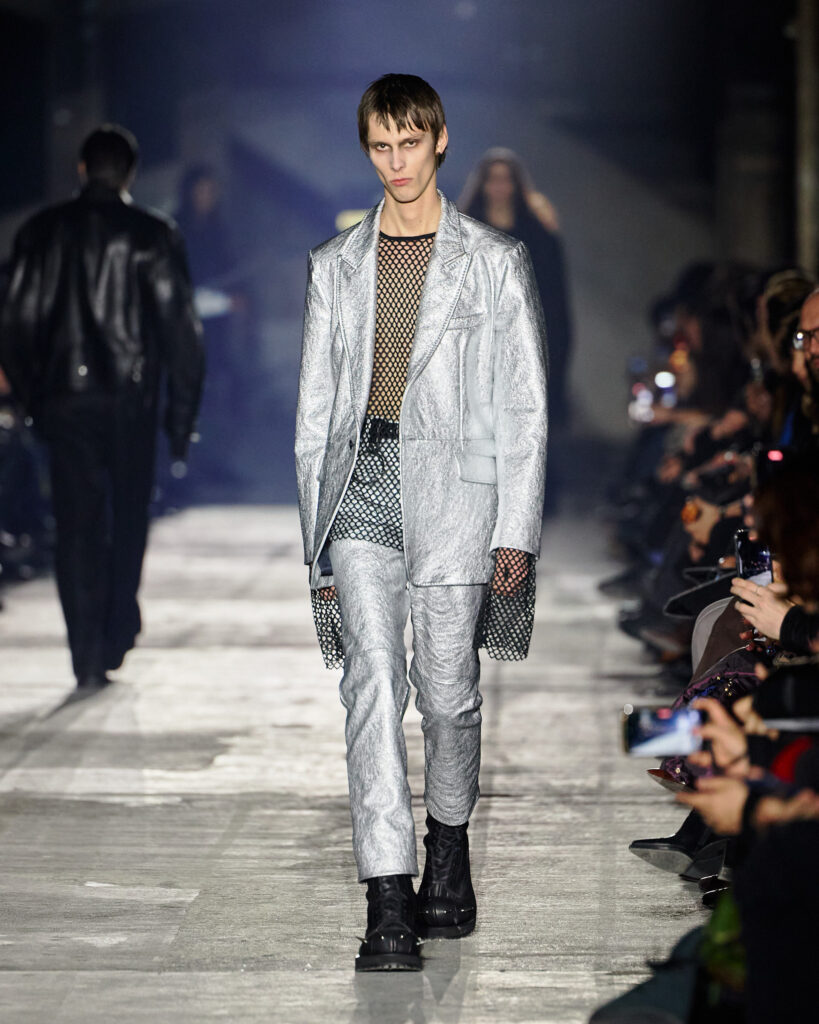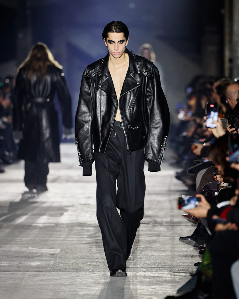 Le lexique sensoriel de la collection puise sa force dans une esthétique empruntée au black metal scandinave. Le noir profond des nuits nordiques dialogue avec des gris argentés et des blancs immaculés, rappelant la morsure du froid. Les textiles sont choisis pour leur densité : la laine melton, le flannel de soie et le cuir argenté agissent comme des barrières isolantes. L’accessoirisation, marquée par un cloutage régimenté, n’a aucune visée décorative ; elle fonctionne comme un signal de distance délibérée envers la société.