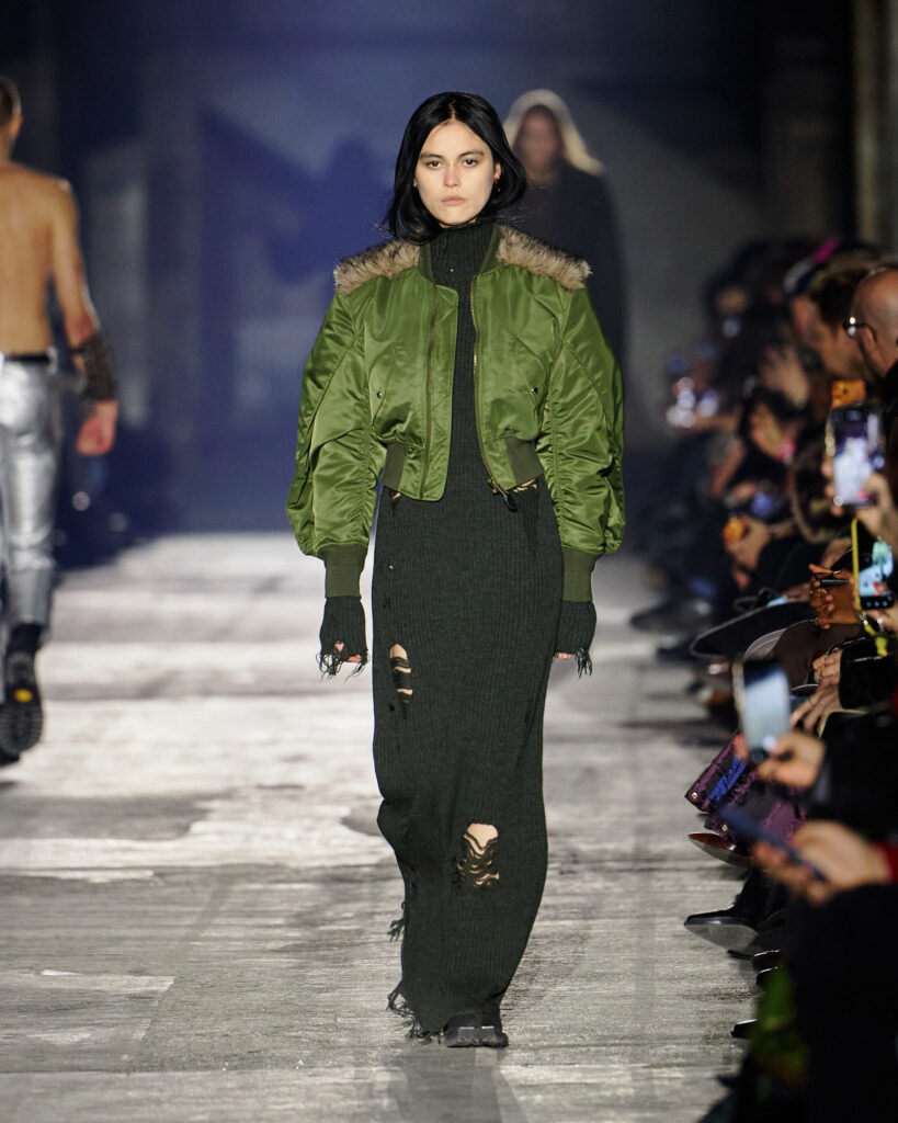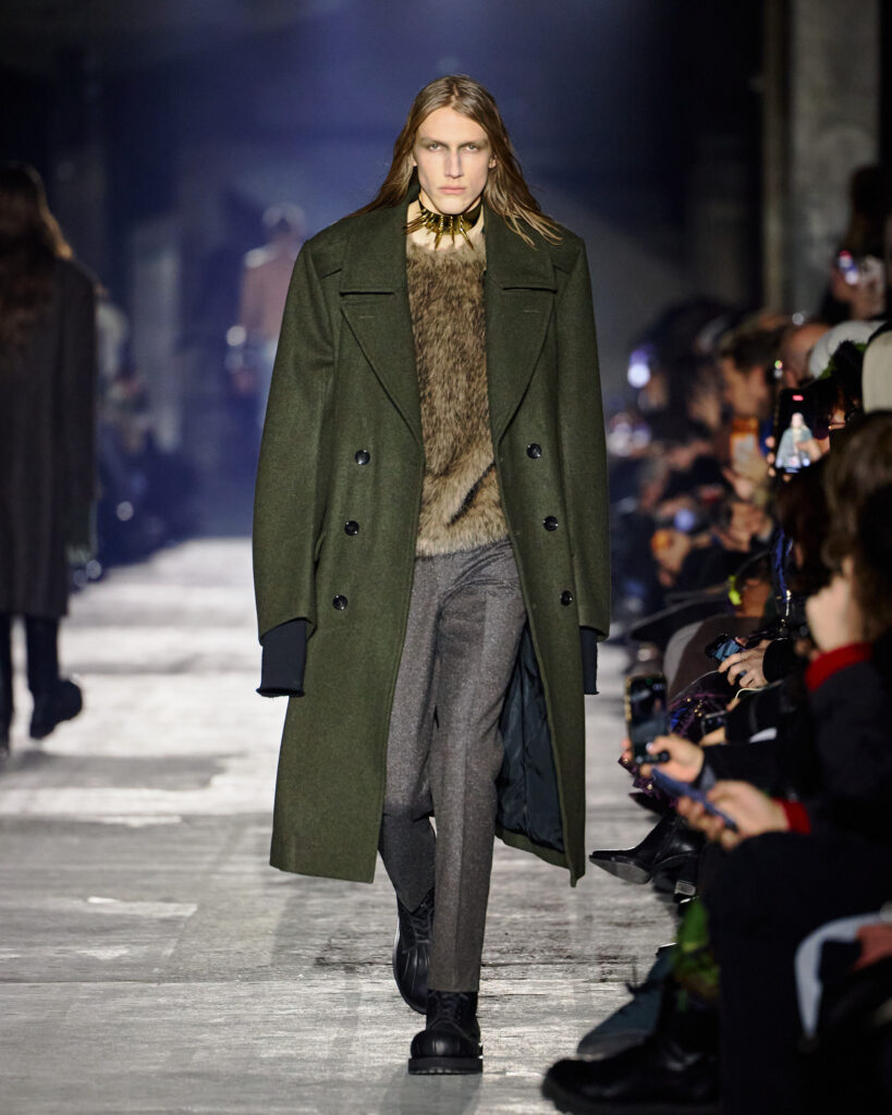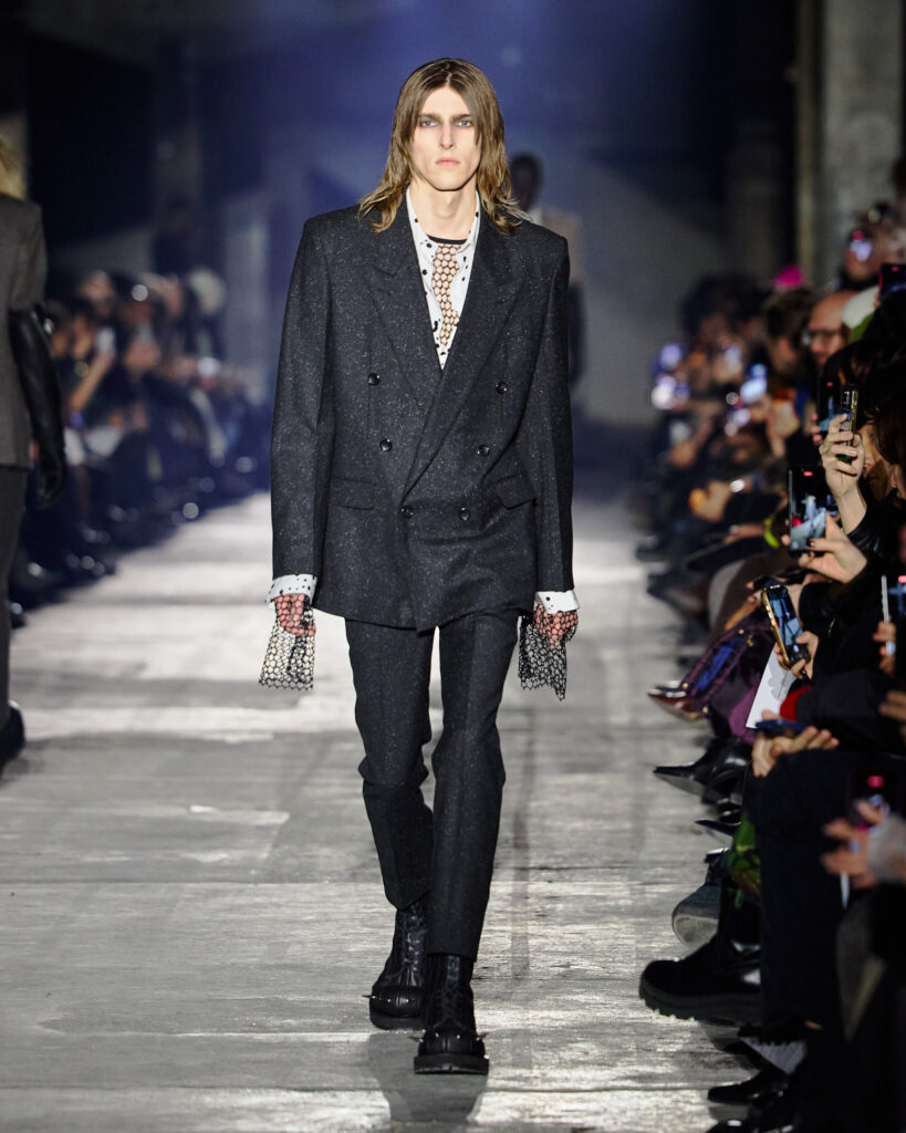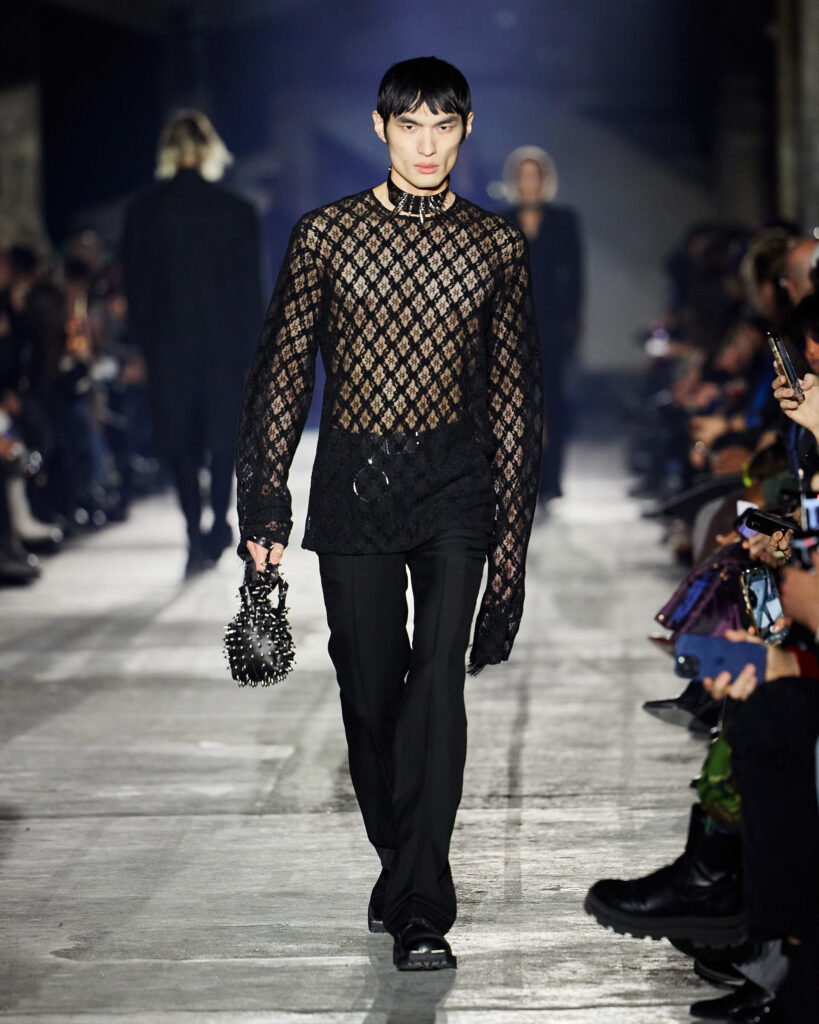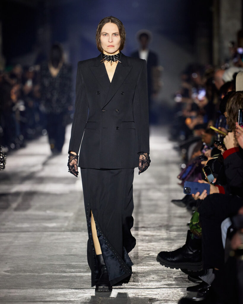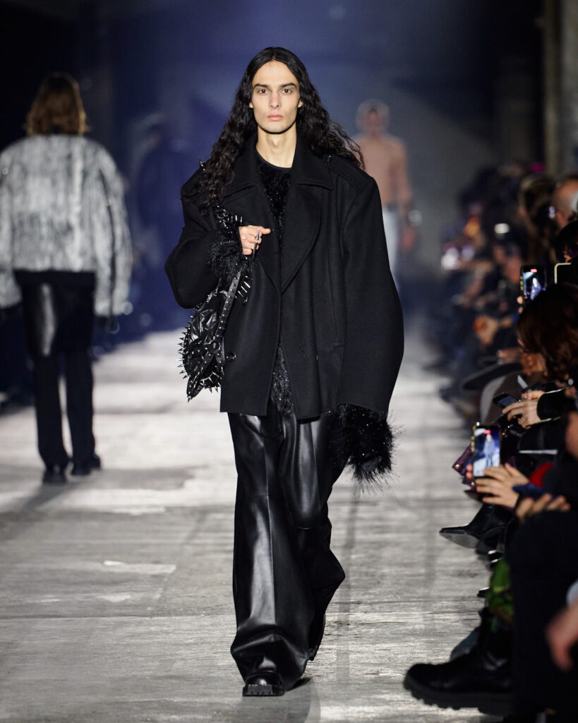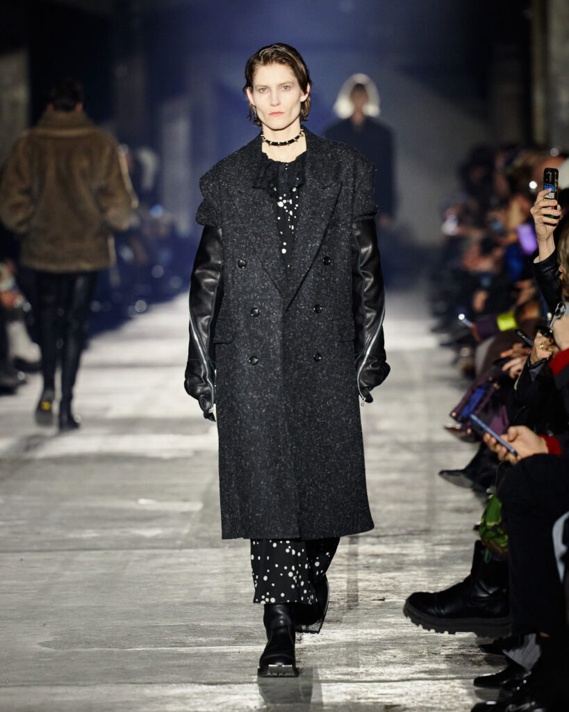 Le lexique sensoriel de la collection puise sa force dans une esthétique empruntée au black metal scandinave. Le noir profond des nuits nordiques dialogue avec des gris argentés et des blancs immaculés, rappelant la morsure du froid. Les textiles sont choisis pour leur densité : la laine melton, le flannel de soie et le cuir argenté agissent comme des barrières isolantes. L’accessoirisation, marquée par un cloutage régimenté, n’a aucune visée décorative ; elle fonctionne comme un signal de distance délibérée envers la société.