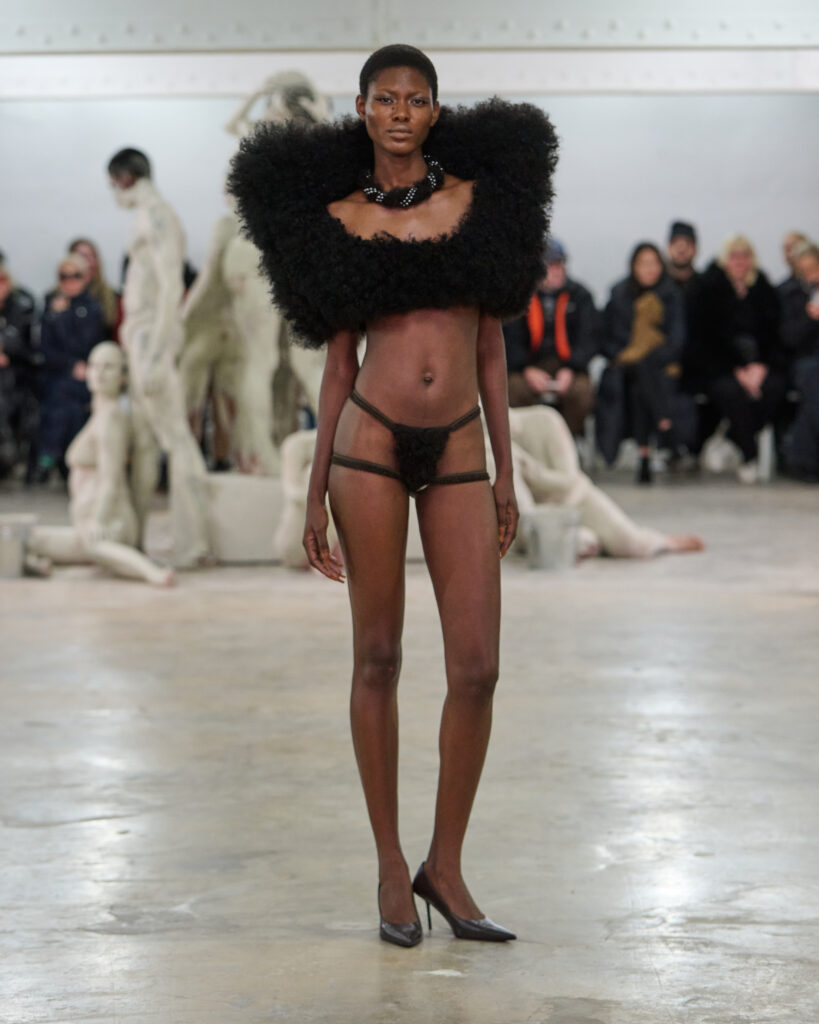 Le choix n’est pas accidentel. Charlie Le Mindu a exercé comme travailleur du sexe avant de se consacrer à la création. Cette trajectoire informe l’ensemble de son travail sur le corps, la visibilité et le consentement. La collection articule explicitement ces thèmes : le corps amplifié plutôt que corrigé, la sensualité habitée plutôt que performée pour autrui.