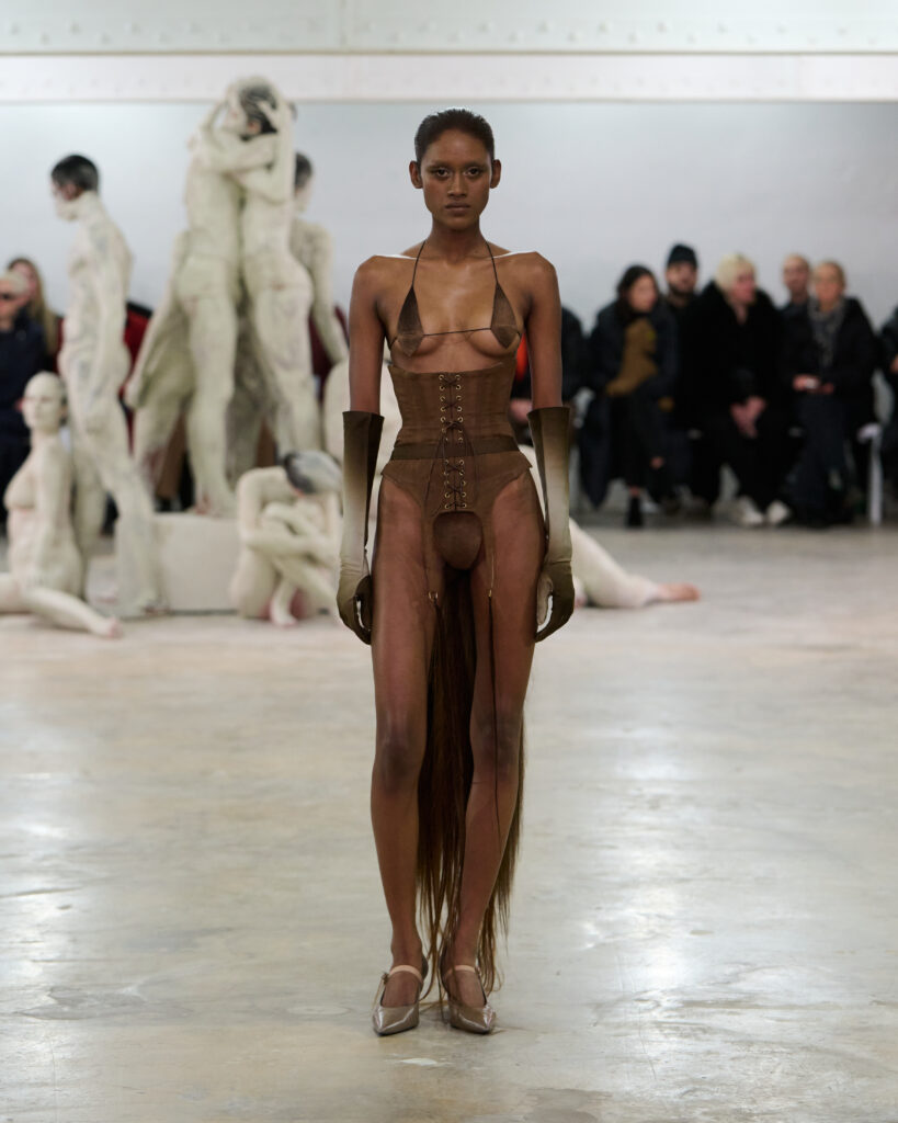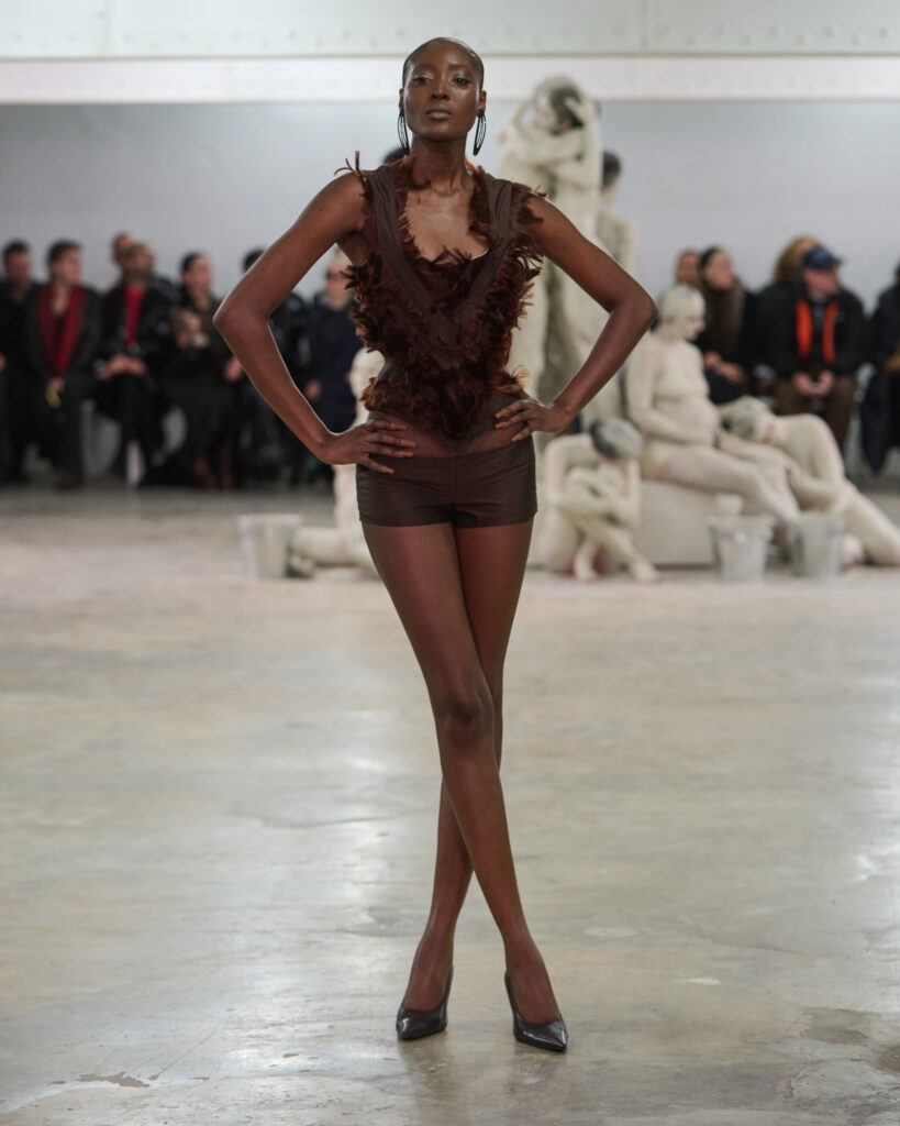 Les silhouettes présentées maintiennent une tension constante entre contrôle et abandon, force et vulnérabilité. Le casting, assuré par Conan Laurendot, mêle mannequins professionnels et performeurs live. La chorégraphie, signée Grace Lyell, intègre le mouvement au défilé : les corps ne se contentent pas de porter les vêtements, ils les activent.