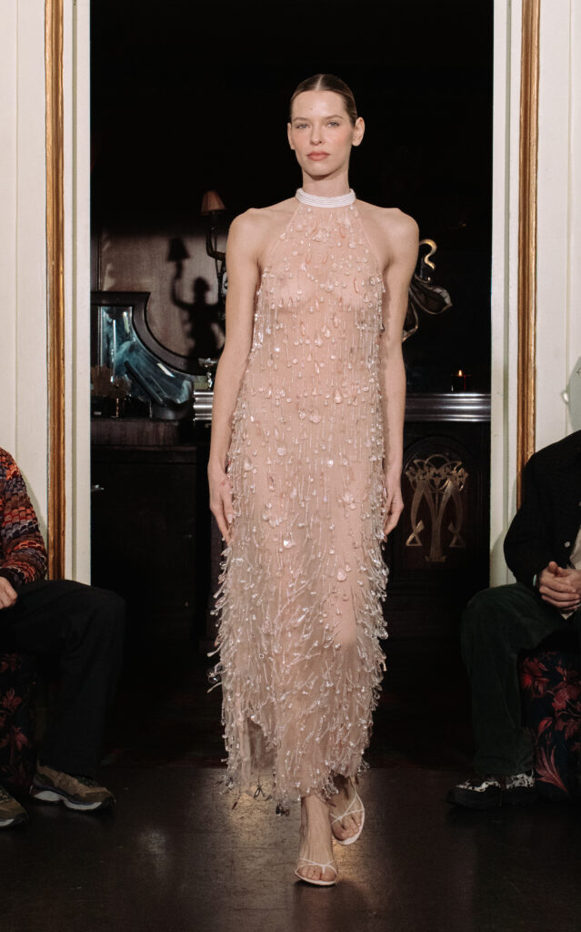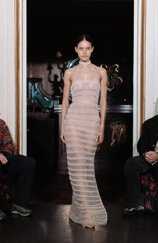 L’approche sculpturale se manifeste avec une clarté particulière dans les silhouettes emblématiques. Ainsi, plusieurs robes dessinent leurs lignes d’encolure en s’inspirant directement de l’agal. La transparence est également employée comme un véritable langage esthétique, adoucissant la rigueur architecturale et insufflant une dimension sensuelle à l’ensemble.