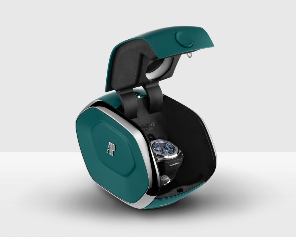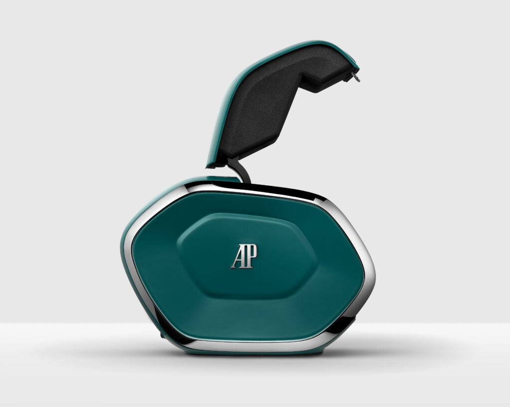 Cette innovation est aussi un objet de design à part entière. Conçu en collaboration avec les équipes internes d’Audemars Piguet et le designer Max Terio (Eight Inc.), l’écrin prolonge le langage esthétique de la Manufacture au-delà du poignet. Sa silhouette géométrique, ses surfaces douces au toucher contrastant avec des détails métalliques polis, traduisent une vision où la forme suit la fonction avec une élégance assumée. « Les proportions ont été soigneusement étudiées pour en faire un objet intuitif, améliorant ergonomie, harmonie visuelle et confort tactile », souligne Max Terio.