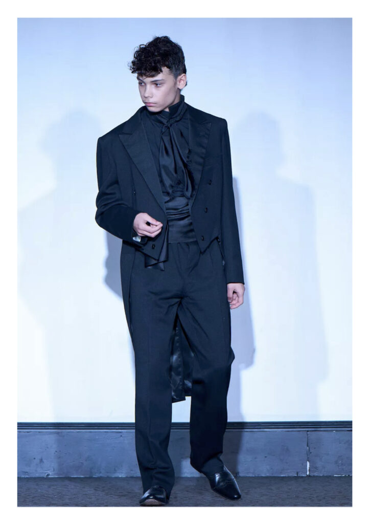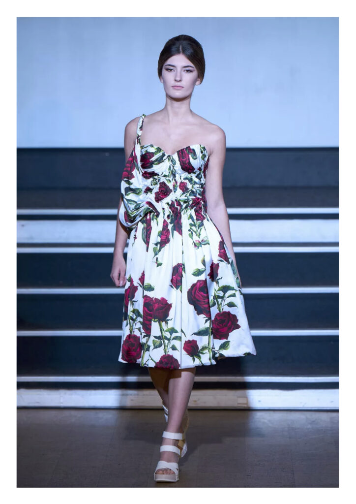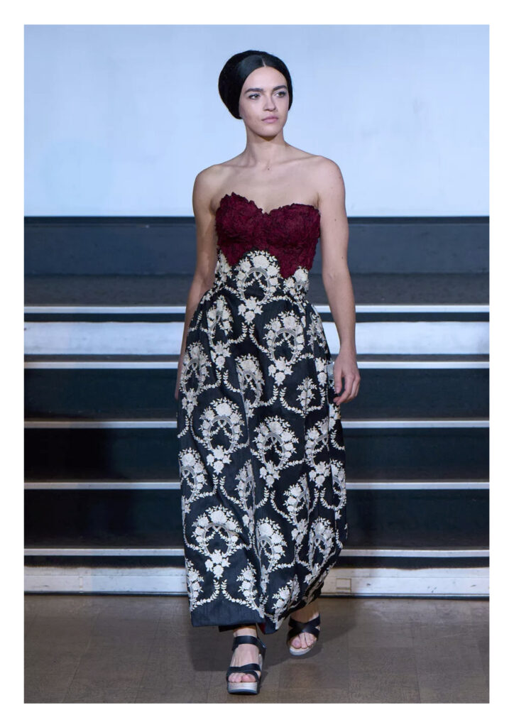 Au sein de l’Atelier, la soie règne sans partage, déclinée en twill, crêpe satin, raso shantung, saglione, organza et mousseline. L’objet central de cette saison est le bustier, omniprésent, qu’il soit intégré aux robes ou associé à des jupes. Le geste de la main se manifeste dans les drapés complexes destinés à accentuer le port de tête et la ligne des épaules, tandis que le noir et le blanc s’expriment à travers des motifs imprimés, brodés ou tissés.