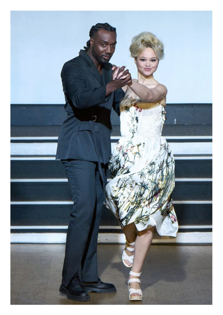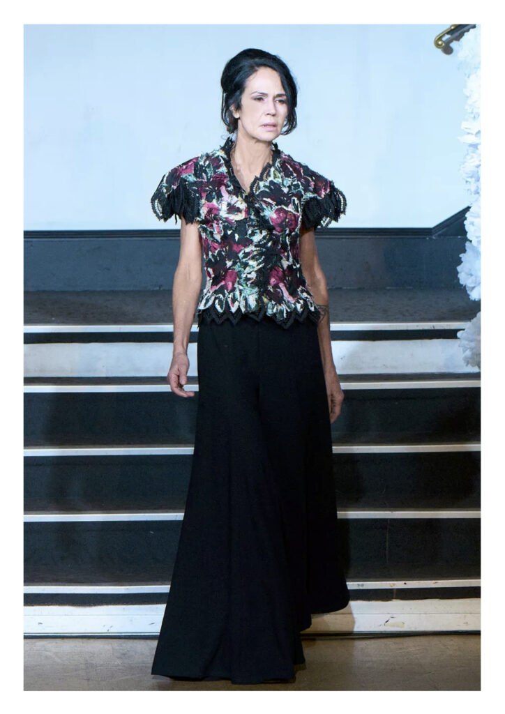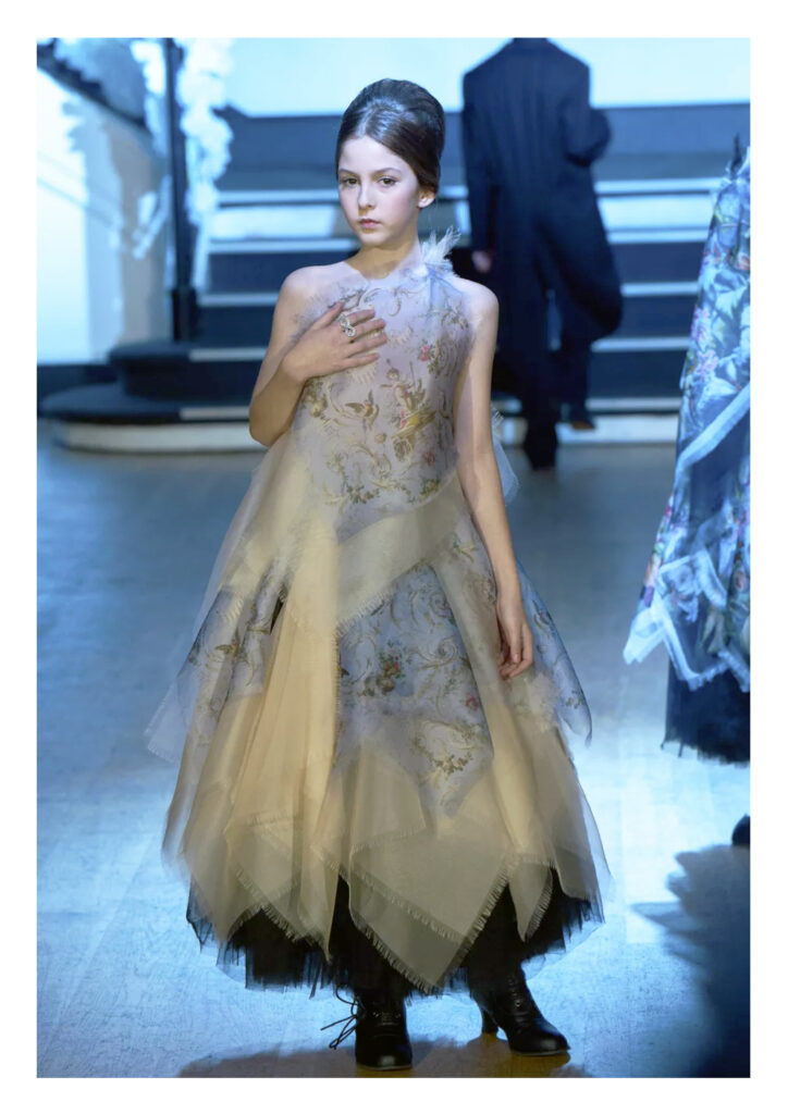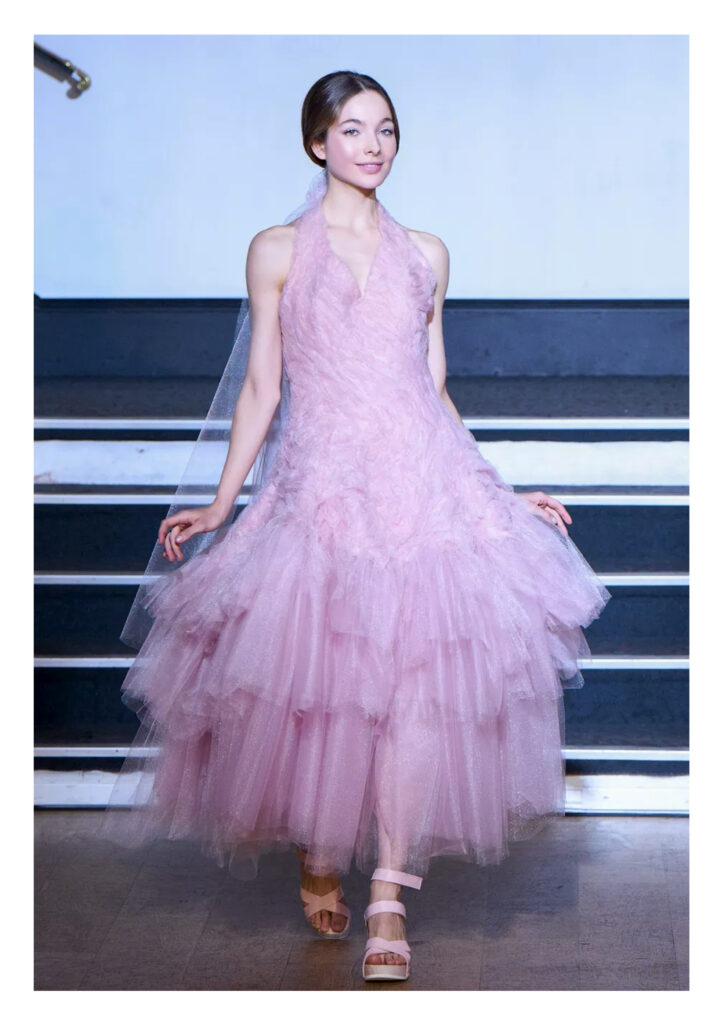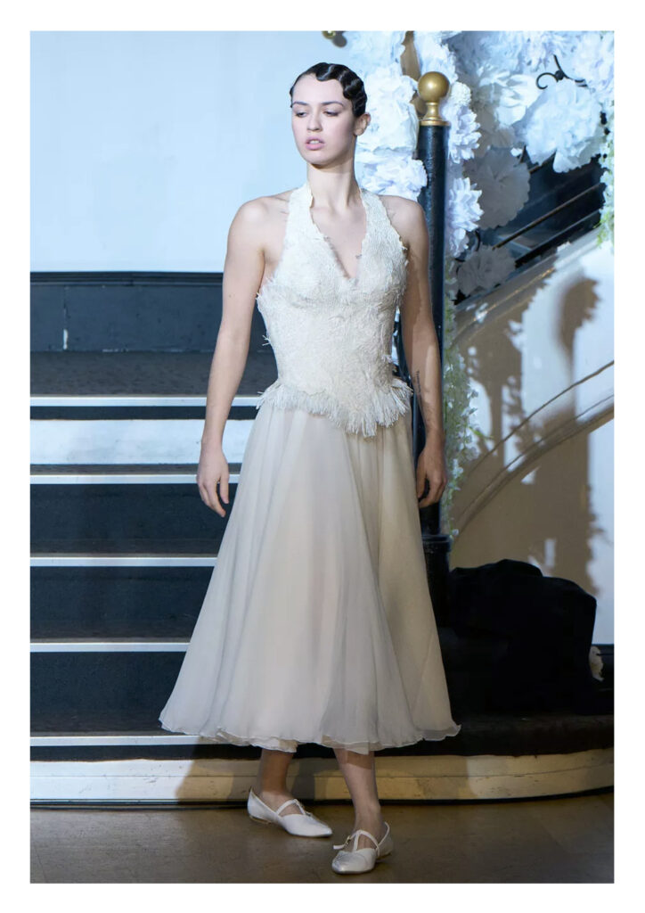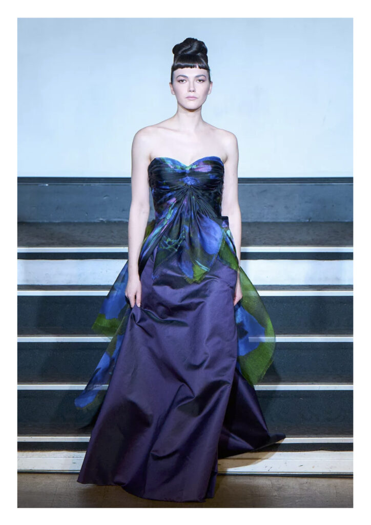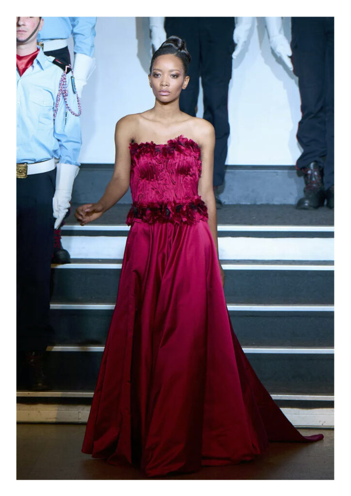 La technique se fait radicale avec la robe « zéro chute » du Bal Blanc, une superposition de plaques-pétales en twill, satin, mikado, organza et radzmir, illustrant une recherche de volume sans perte de matière. Chaque pièce répond à une nomenclature historique ou imaginaire, du Bal du Siècle de Charles de Beistegui au populaire Bal des Pompiers.