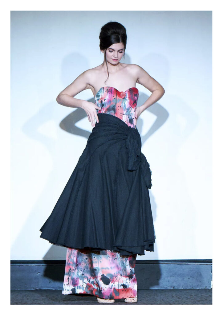 Détail technique : Le Bal des Pompiers Robe bandeau drapée en charmeuse de soie chaudron, impression façon fusant. La pièce se distingue par une taille suspendue et un bas de robe portefeuille agrémenté de plis « sari ».