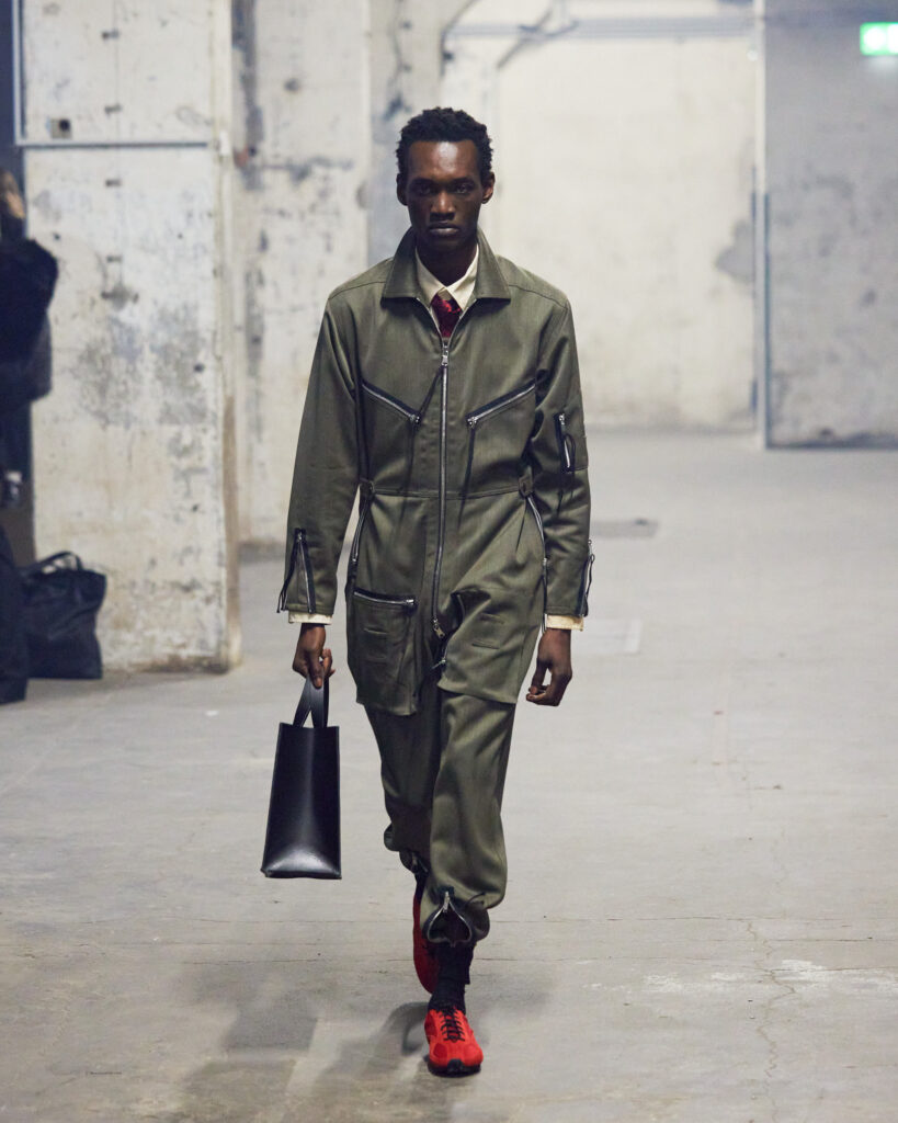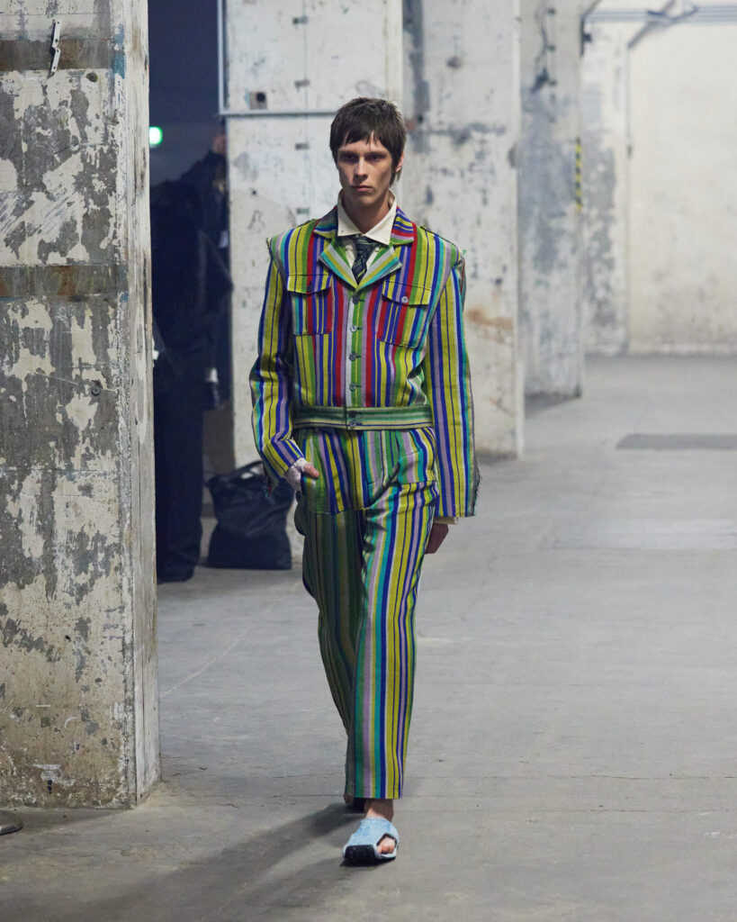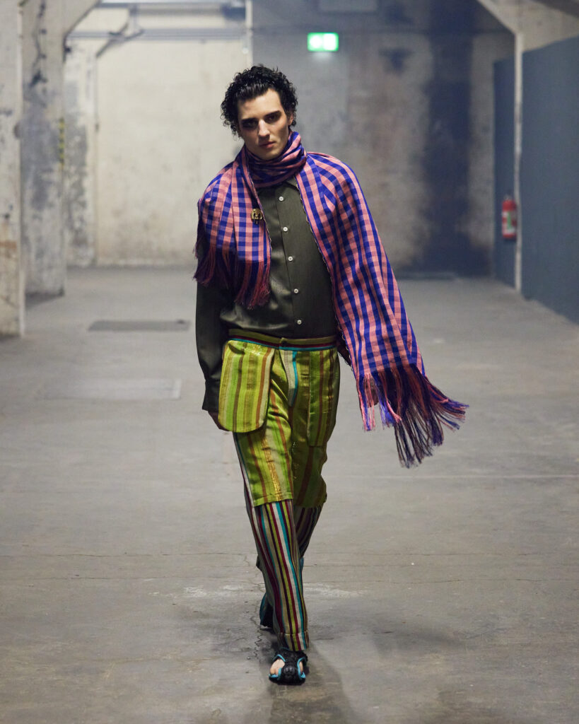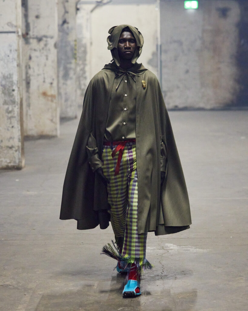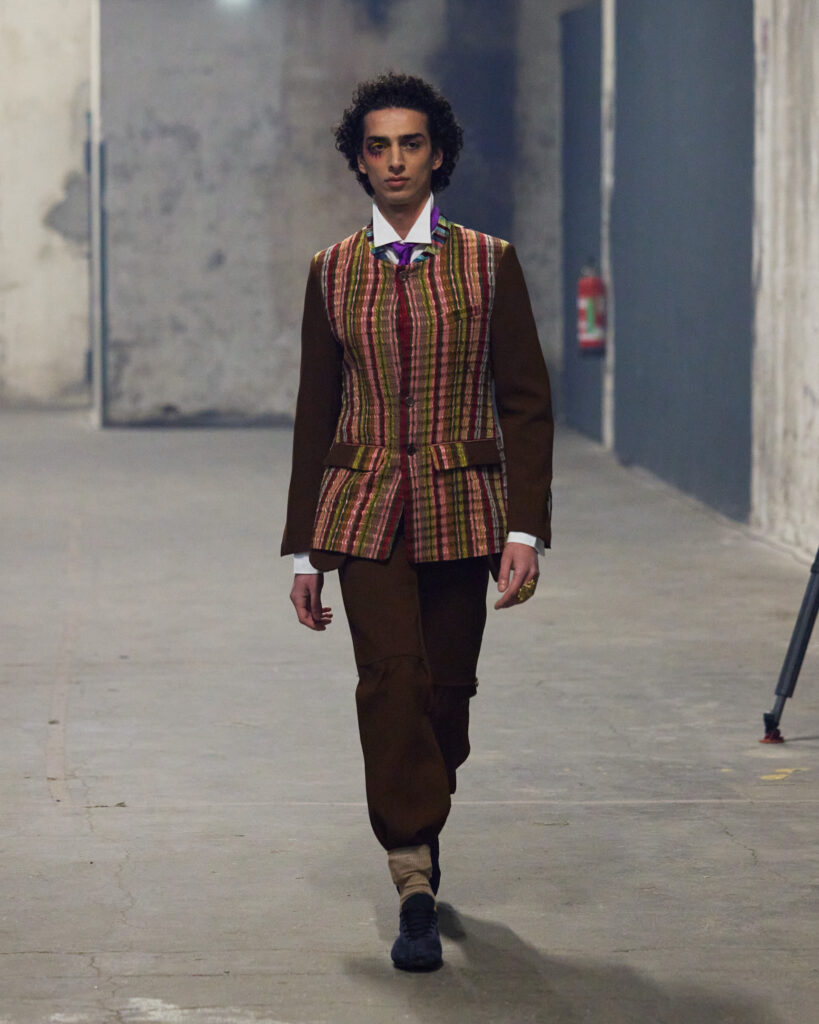 JOY ne s’est pas construite dans l’isolement d’un studio, mais dans l’absorption de conversations. Kenneth Ize a transformé les échanges avec ses proches et collaborateurs — de James Tennessee Braindt à Giovanni Mareschi — en une matière tangible. Ici, le textile ne se contente pas d’habiller ; il documente une géographie humaine faite de voyages et de connexions. Les étoffes deviennent le lexique d’une langue parlée par les mains, où l’expérience du mouvement dicte la structure de la création.