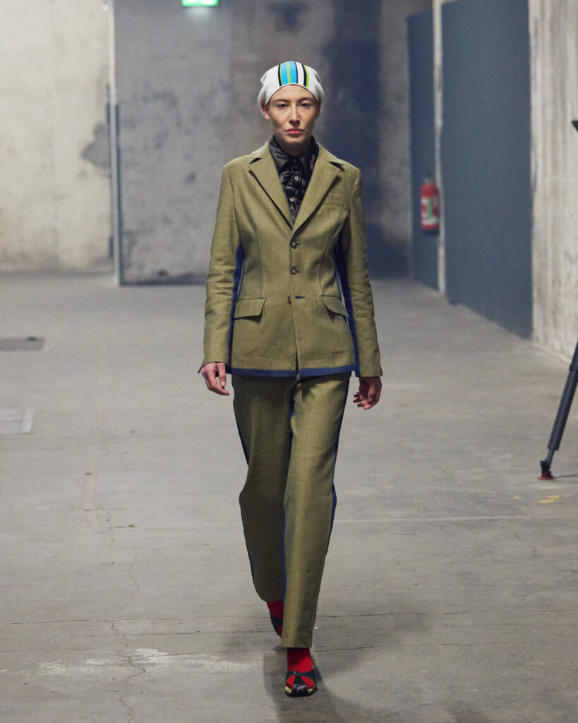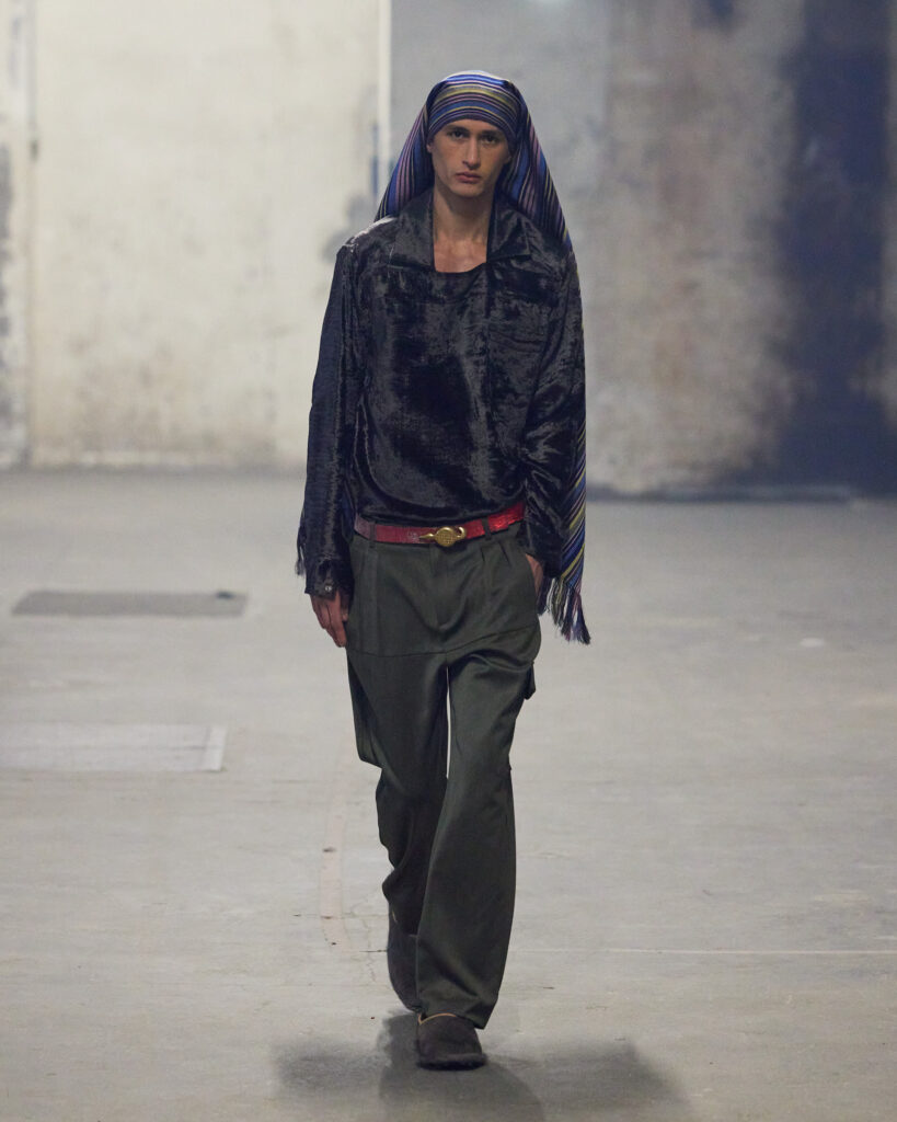 La Maison Ize joue sur une tension entre l’intime et le public. En entremêlant l’asoke traditionnel au velours, à la laine et au denim, la collection brouille la frontière entre l’armure extérieure et la vulnérabilité domestique. Ce qui est habituellement relégué à la doublure ou à l’invisible est ici ramené à la surface. Ce renversement des matières, traditionnellement dévolues à la protection et à l’intériorité, confère aux pièces une dimension vivante et vulnérable.