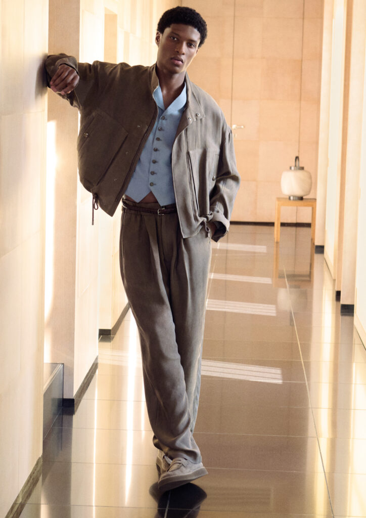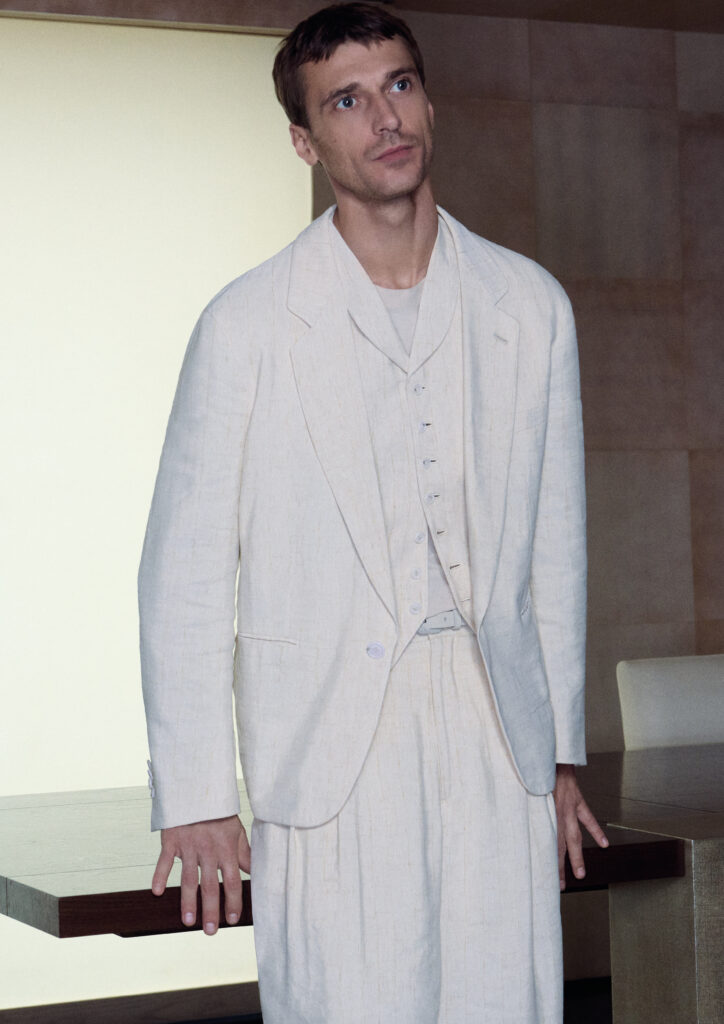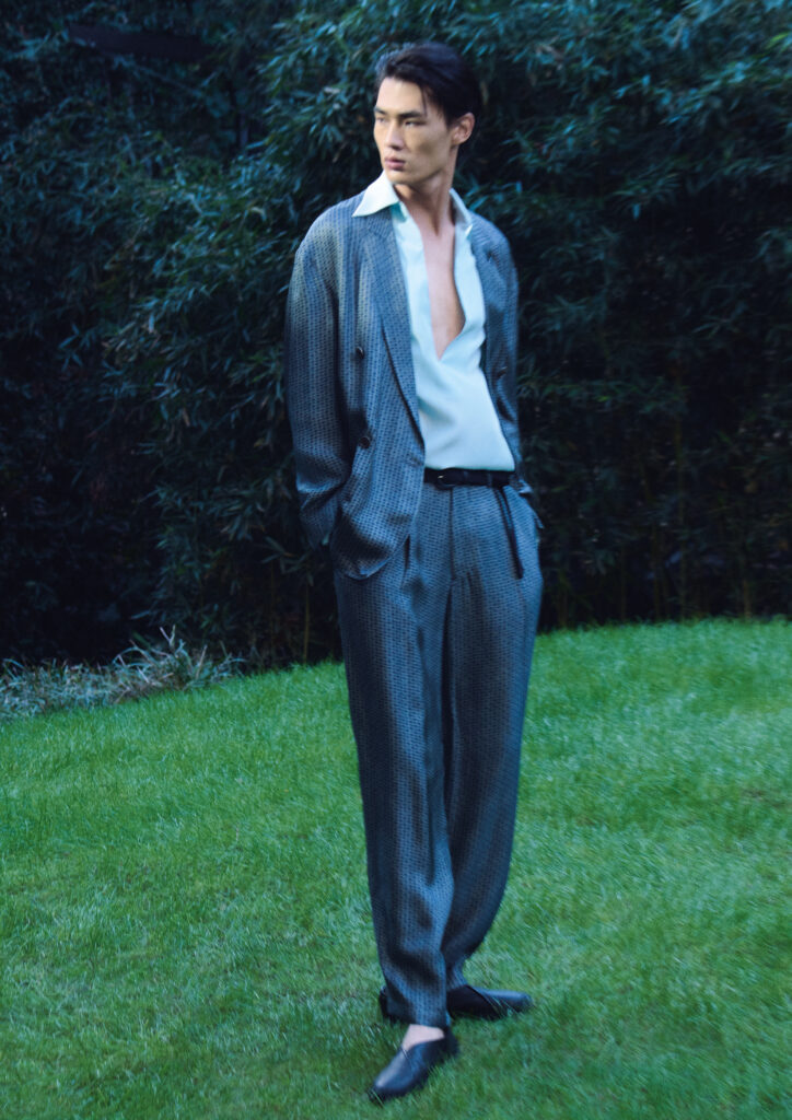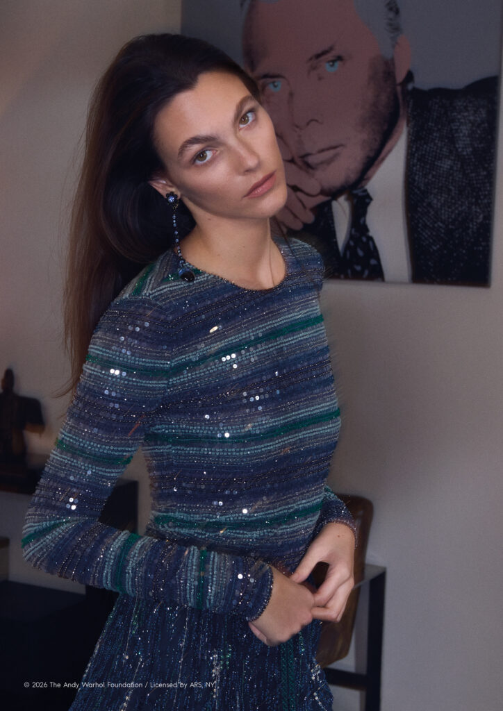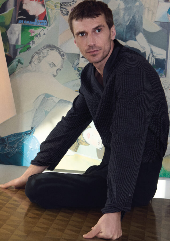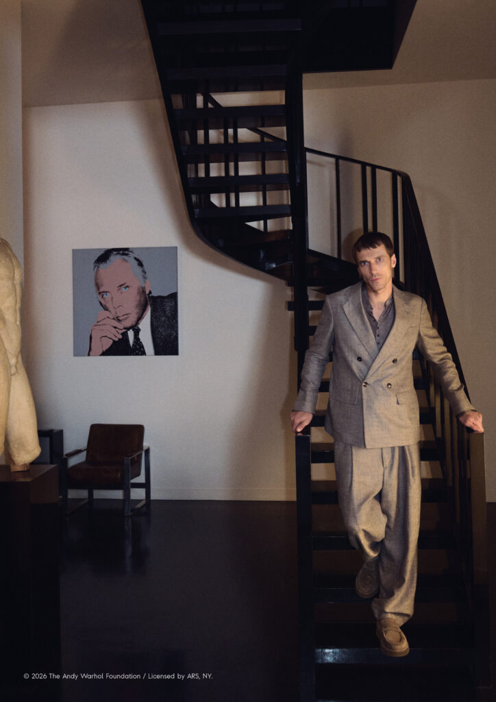 Oliver Hadlee Pearch a photographié Vittoria Ceretti et Clément Chabernaud dans les pièces que Giorgio Armani habitait, au sein du même édifice qui accueille les défilés de la Maison depuis des décennies. L’appartement est toujours occupé par Leo Dell’Orco. Ce n’est pas une reconstitution muséale, mais un lieu de vie traversé par des mannequins portant des costumes structurés, des robes fluides, des pulls et des chemises ajustées. Le jardin intérieur, les murs couverts d’œuvres, les meubles de collection : tout reste en place. Aboubakar Conte, Zhaoyi Fan et Greta Hofer (pour les lunettes) complètent le casting.